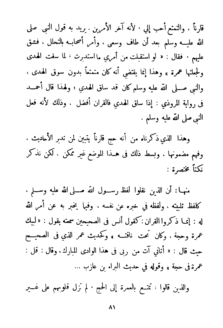 قَارِنًا وَالتَّمَتُّعُ أَحَبُّ إلَيَّ لِأَنَّهُ آخِرُ الْأَمْرَيْنِ. يُرِيدُ بِهِ قَوْلَ النَّبِيِّ صَلَّى اللَّهُ عَلَيْهِ وَسَلَّمَ بَعْدَ أَنْ طَافَ وَسَعَى وَأَمَرَ أَصْحَابَهُ بِالتَّحَلُّلِ فَشَقَّ عَلَيْهِمْ فَقَالَ: {لَوْ اسْتَقْبَلْت مِنْ أَمْرِي مَا اسْتَدْبَرْت لَمَا سُقْت الْهَدْيَ وَلَجَعَلْتهَا عُمْرَةً} وَهَذَا إنَّمَا يَقْتَضِي أَنَّهُ كَانَ مُتَمَتِّعًا بِدُونِ سَوْقِ الْهَدْيِ وَالنَّبِيُّ صَلَّى اللَّهُ عَلَيْهِ وَسَلَّمَ كَانَ قَدْ سَاقَ الْهَدْيَ. وَلِهَذَا قَالَ أَحْمَد فِي رِوَايَةِ المروذي: إذَا سَاقَ الْهَدْيَ فَالْقِرَانُ أَفْضَلُ وَذَلِكَ لِأَنَّهُ فِعْلُ النَّبِيِّ صَلَّى اللَّهُ عَلَيْهِ وَسَلَّمَ. وَهَذَا الَّذِي ذَكَرْنَاهُ مِنْ أَنَّهُ حَجَّ قَارِنًا يَتَبَيَّنُ لِمَنْ تَدَبَّرَ الْأَحَادِيثَ وَفَهِمَ مَضْمُونَهَا. وَبَسْطُ ذَلِكَ فِي هَذَا الْمَوْضِعِ غَيْرُ مُمْكِنٍ لَكِنْ نَذْكُرُ نُكَتًا مُخْتَصَرَةً: مِنْهَا: أَنَّ الَّذِينَ نَقَلُوا لَفْظَ رَسُولِ اللَّهِ صَلَّى اللَّهُ عَلَيْهِ وَسَلَّمَ كَلَفْظِ تَلْبِيَتِهِ وَلَفْظِهِ فِي خَبَرِهِ عَنْ نَفْسِهِ وَفِيمَا يُخْبِرُ بِهِ عَنْ أَمْرِ اللَّهِ لَهُ: إنَّمَا ذَكَرُوا الْقِرَانَ: كَقَوْلِ أَنَسٍ فِي الصَّحِيحَيْنِ سَمِعْته يَقُولُ: {لَبَّيْكَ عُمْرَةً وَحَجَّةً وَكَانَ تَحْتَ نَاقَتِهِ} وَكَحَدِيثِ عُمَرَ الَّذِي فِي الصَّحِيحِ حَيْثُ قَالَ: {أَتَانِي آتٍ مِنْ رَبِّي فِي هَذَا الْوَادِي الْمُبَارَكِ وَقَالَ: قُلْ: عُمْرَةٌ فِي حَجَّةٍ} وَقَوْلِهِ فِي حَدِيثِ الْبَرَاءِ بْنِ عَازِبٍ. . . (*) وَاَلَّذِينَ قَالُوا: تَمَتَّعَ بِالْعُمْرَةِ إلَى الْحَجِّ لَمْ تَزَلْ قُلُوبُهُمْ عَلَى غَيْرِ