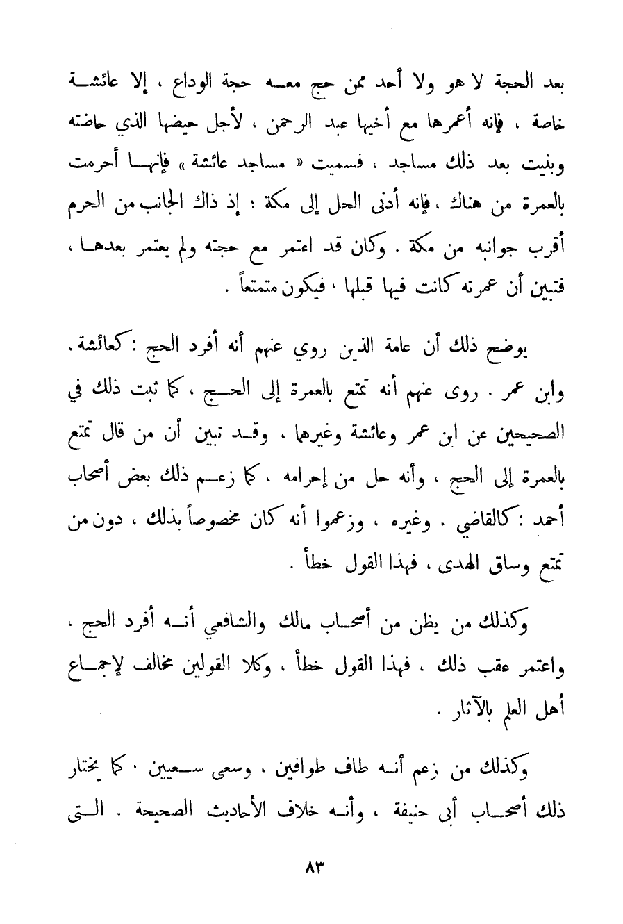 بَعْدَ الْحَجَّةِ لَا هُوَ وَلَا أَحَدٌ مِمَّنْ حَجَّ مَعَهُ حَجَّةَ الْوَدَاعِ إلَّا عَائِشَةَ خَاصَّةً فَإِنَّهُ أَعْمَرَهَا مَعَ أَخِيهَا عَبْدِ الرَّحْمَنِ لِأَجْلِ حَيْضِهَا الَّذِي حَاضَتْهُ وَبُنِيَتْ بَعْدَ ذَلِكَ مَسَاجِدُ فَسُمِّيَتْ " مَسَاجِدَ عَائِشَةَ " فَإِنَّهَا أَحْرَمَتْ بِالْعُمْرَةِ مِنْ هُنَاكَ فَإِنَّهُ أَدْنَى الْحِلِّ إلَى مَكَّةَ؛ إذْ ذَاكَ الْجَانِبُ مِنْ الْحَرَمِ أَقْرَبُ جَوَانِبِهِ مِنْ مَكَّةَ. وَكَانَ قَدْ اعْتَمَرَ مَعَ حَجَّتِهِ وَلَمْ يَعْتَمِرْ بَعْدَهَا فَتَبَيَّنَ أَنَّ عُمْرَتَهُ كَانَتْ فِيهَا قَبْلَهَا فَيَكُونُ مُتَمَتِّعًا. يُوَضِّحُ ذَلِكَ أَنَّ عَامَّةَ الَّذِينَ رُوِيَ عَنْهُمْ أَنَّهُ أَفْرَدَ الْحَجَّ: كَعَائِشَةَ وَابْنِ عُمَرَ. رُوِيَ عَنْهُمْ أَنَّهُ تَمَتَّعَ بِالْعُمْرَةِ إلَى الْحَجِّ كَمَا ثَبَتَ ذَلِكَ فِي الصَّحِيحَيْنِ عَنْ ابْنِ عُمَرَ وَعَائِشَةَ وَغَيْرِهِمَا وَقَدْ تَبَيَّنَ أَنَّ مَنْ قَالَ تَمَتَّعَ بِالْعُمْرَةِ إلَى الْحَجِّ وَأَنَّهُ حَلَّ مِنْ إحْرَامِهِ كَمَا زَعَمَ ذَلِكَ بَعْضُ أَصْحَابِ أَحْمَد: كَالْقَاضِي وَغَيْرِهِ وَزَعَمُوا أَنَّهُ كَانَ مَخْصُوصًا بِذَلِكَ دُونَ مَنْ تَمَتَّعَ وَسَاقَ الْهَدْيَ فَهَذَا الْقَوْلُ خَطَأٌ. وَكَذَلِكَ مَنْ يُظَنُّ مِنْ أَصْحَابِ مَالِكٍ وَالشَّافِعِيِّ أَنَّهُ أَفْرَدَ الْحَجَّ وَاعْتَمَرَ عَقِبَ ذَلِكَ فَهَذَا الْقَوْلُ خَطَأٌ وَكِلَا الْقَوْلَيْنِ مُخَالِفٌ لِإِجْمَاعِ أَهْلِ الْعِلْمِ بِالْآثَارِ. وَكَذَلِكَ مَنْ زَعَمَ أَنَّهُ طَافَ طَوَافَيْنِ وَسَعَى سعيين كَمَا يَخْتَارُ ذَلِكَ أَصْحَابُ أَبِي حَنِيفَةَ وَأَنَّهُ خِلَافُ الْأَحَادِيثِ الصَّحِيحَةِ الَّتِي