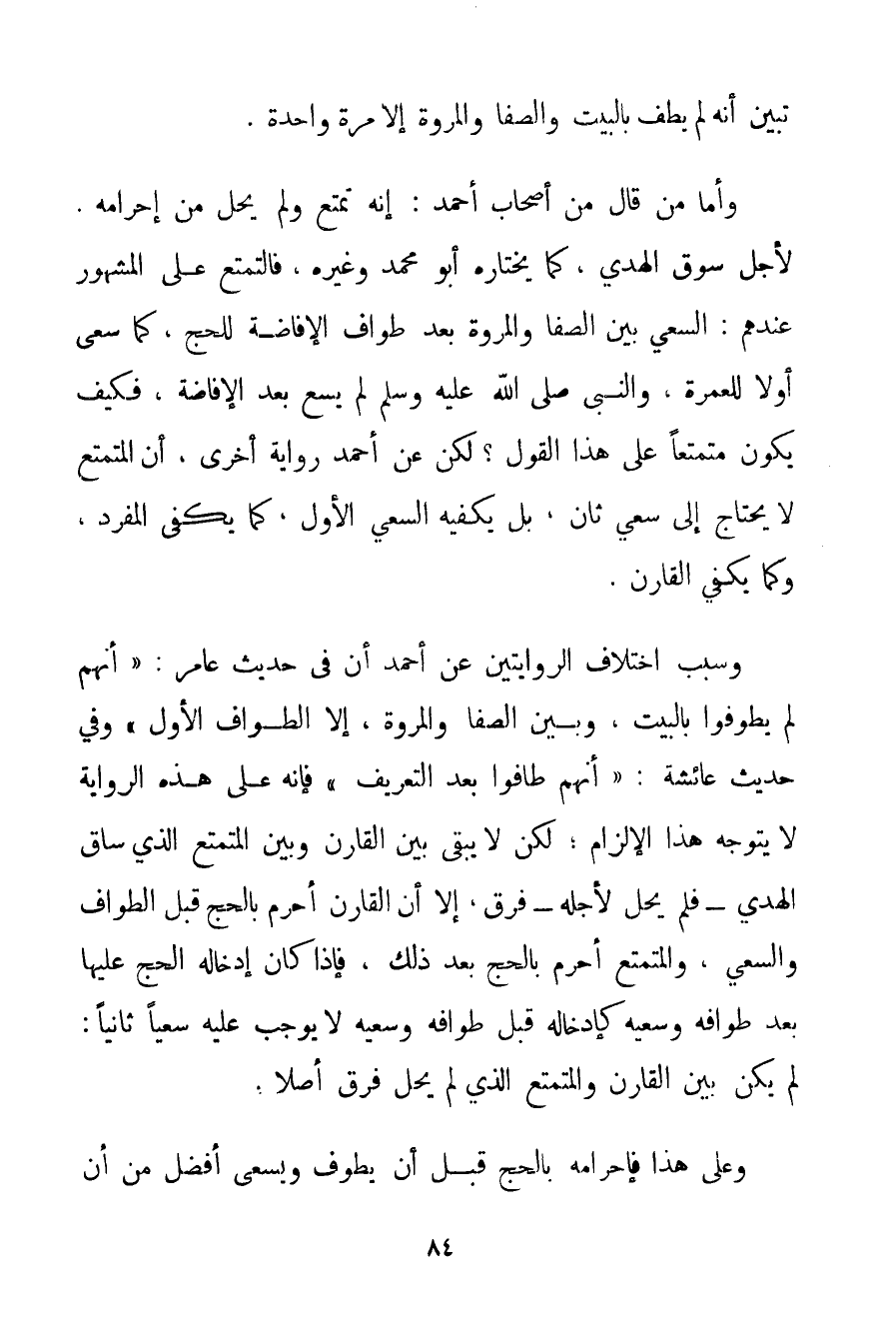 تُبَيِّنُ أَنَّهُ لَمْ يَطُفْ بِالْبَيْتِ وَالصَّفَا وَالْمَرْوَةِ إلَّا مَرَّةً وَاحِدَةً. وَأَمَّا مَنْ قَالَ مِنْ أَصْحَابِ أَحْمَد: إنَّهُ تَمَتَّعَ وَلَمْ يَحِلَّ مِنْ إحْرَامِهِ؛ لِأَجْلِ سَوْقِ الْهَدْيِ كَمَا يَخْتَارُهُ أَبُو مُحَمَّدٍ وَغَيْرُهُ فَالتَّمَتُّعُ عَلَى الْمَشْهُورِ عِنْدَهُمْ: السَّعْيُ بَيْنَ الصَّفَا وَالْمَرْوَةِ بَعْدَ طَوَافِ الْإِفَاضَةِ لِلْحَجِّ كَمَا سَعَى أَوَّلًا لِلْعُمْرَةِ وَالنَّبِيُّ صَلَّى اللَّهُ عَلَيْهِ وَسَلَّمَ لَمْ يَسْعَ بَعْدَ الْإِفَاضَةِ فَكَيْفَ يَكُونُ مُتَمَتِّعًا عَلَى هَذَا الْقَوْلِ؟ لَكِنْ عَنْ أَحْمَد رِوَايَةٌ أُخْرَى أَنَّ الْمُتَمَتِّعَ لَا يَحْتَاجُ إلَى سَعْيٍ ثَانٍ بَلْ يَكْفِيهِ السَّعْيُ الْأَوَّلُ كَمَا يَكْفِي الْمُفْرِدَ وَكَمَا يَكْفِي الْقَارِنَ. وَسَبَبُ اخْتِلَافِ الرِّوَايَتَيْنِ عَنْ أَحْمَد أَنَّ فِي حَدِيثِ جَابِرٍ: " أَنَّهُمْ لَمْ يَطُوفُوا بِالْبَيْتِ وَبَيْنَ الصَّفَا وَالْمَرْوَةِ إلَّا الطَّوَافَ الْأَوَّلَ " وَفِي حَدِيثِ عَائِشَةَ: " أَنَّهُمْ طَافُوا بَعْدَ التَّعْرِيفِ " فَإِنَّهُ عَلَى هَذِهِ الرِّوَايَةِ لَا يَتَوَجَّهُ هَذَا الْإِلْزَامُ؛ لَكِنْ لَا يَبْقَى بَيْنَ الْقَارِنِ وَبَيْنَ الْمُتَمَتِّعِ الَّذِي سَاقَ الْهَدْيَ - فَلَمْ يَحِلَّ لِأَجْلِهِ - فَرْقٌ إلَّا أَنَّ الْقَارِنَ أَحْرَمَ بِالْحَجِّ قَبْلَ الطَّوَافِ وَالسَّعْيِ وَالْمُتَمَتِّعُ أَحْرَمَ بِالْحَجِّ بَعْدَ ذَلِكَ فَإِذَا كَانَ إدْخَالُهُ الْحَجَّ عَلَيْهَا بَعْدَ طَوَافِهِ وَسَعْيِهِ كَإِدْخَالِهِ قَبْلَ طَوَافِهِ وَسَعْيِهِ لَا يُوجِبُ عَلَيْهِ سَعْيًا ثَانِيًا: لَمْ يَكُنْ بَيْنَ الْقَارِنِ وَالْمُتَمَتِّعِ الَّذِي لَمْ يَحِلَّ فَرْقٌ أَصْلًا. وَعَلَى هَذَا فَإِحْرَامُهُ بِالْحَجِّ قَبْلَ أَنْ يَطُوفَ وَيَسْعَى أَفْضَلُ مِنْ أَنْ