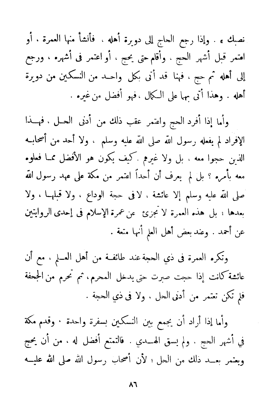 نَصَبِك} . وَإِذَا رَجَعَ الْحَاجُّ إلَى دويرة أَهْلِهِ فَأَنْشَأَ مِنْهَا الْعُمْرَةَ أَوْ اعْتَمَرَ قَبْلَ أَشْهُرِ الْحَجِّ وَأَقَامَ حَتَّى يَحُجَّ أَوْ اعْتَمَرَ فِي أَشْهُرِهِ وَرَجَعَ إلَى أَهْلِهِ ثُمَّ حَجَّ فَهُنَا قَدْ أَتَى بِكُلِّ وَاحِدٍ مِنْ النسكين مِنْ دويرة أَهْلِهِ. وَهَذَا أَتَى بِهِمَا عَلَى الْكَمَالِ فَهُوَ أَفْضَلُ مِنْ غَيْرِهِ. وَأَمَّا إذَا أَفْرَدَ الْحَجَّ وَاعْتَمَرَ عَقِبَ ذَلِكَ مِنْ أَدْنَى الْحِلِّ فَهَذَا الْإِفْرَادُ لَمْ يَفْعَلْهُ رَسُولُ اللَّهِ صَلَّى اللَّهُ عَلَيْهِ وَسَلَّمَ وَلَا أَحَدٌ مِنْ أَصْحَابِهِ الَّذِينَ حَجُّوا مَعَهُ بَلْ وَلَا غَيْرِهِمْ. كَيْفَ يَكُونُ هُوَ الْأَفْضَلُ مِمَّا فَعَلُوهُ مَعَهُ بِأَمْرِهِ؟ بَلْ لَمْ يُعْرَفْ أَنَّ أَحَدًا اعْتَمَرَ مِنْ مَكَّةَ عَلَى عَهْدِ رَسُولِ اللَّهِ صَلَّى اللَّهُ عَلَيْهِ وَسَلَّمَ إلَّا عَائِشَةَ لَا فِي حَجَّةِ الْوَدَاعِ وَلَا قَبْلَهَا وَلَا بَعْدَهَا؛ بَلْ هَذِهِ الْعُمْرَةُ لَا تُجْزِئُ عَنْ عُمْرَةِ الْإِسْلَامِ فِي إحْدَى الرِّوَايَتَيْنِ عَنْ أَحْمَد. وَعِنْدَ بَعْضِ أَهْلِ الْعِلْمِ أَنَّهَا مُتْعَةٌ. وَتُكْرَهُ الْعُمْرَةُ فِي ذِي الْحَجَّةِ عِنْدَ طَائِفَةٍ مِنْ أَهْلِ الْعِلْمِ مَعَ أَنَّ عَائِشَةَ كَانَتْ إذَا حَجَّتْ صَبَرَتْ حَتَّى يَدْخُلَ الْمُحَرَّمُ ثُمَّ تُحْرِمُ مِنْ الْجُحْفَةِ فَلَمْ تَكُنْ تَعْتَمِرُ مِنْ أَدْنَى الْحِلِّ وَلَا فِي ذِي الْحِجَّةِ. وَأَمَّا إذَا أَرَادَ أَنْ يَجْمَعَ بَيْنَ النسكين بِسَفْرَةِ وَاحِدَةٍ وَقَدِمَ مَكَّةَ فِي أَشْهُرِ الْحَجِّ وَلَمْ يَسُقْ الْهَدْيَ. فَالتَّمَتُّعُ أَفْضَلُ لَهُ مِنْ أَنْ يَحُجَّ وَيَعْتَمِرَ بَعْدَ ذَلِكَ مِنْ الْحِلِّ؛ لِأَنَّ أَصْحَابَ رَسُولِ اللَّهِ صَلَّى اللَّهُ عَلَيْهِ وَسَلَّمَ