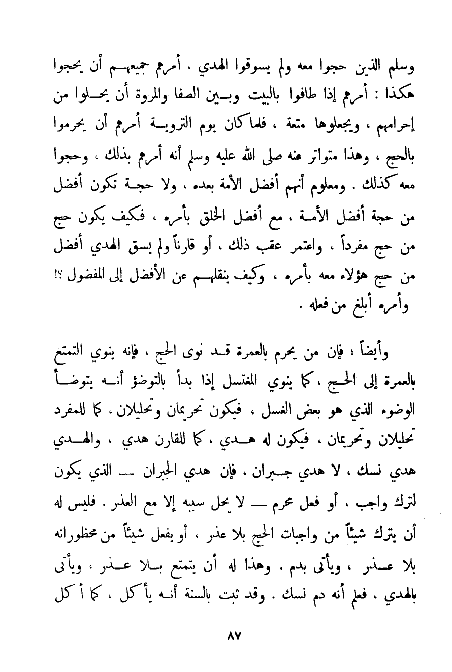 الَّذِينَ حَجُّوا مَعَهُ وَلَمْ يَسُوقُوا الْهَدْيَ أَمَرَهُمْ جَمِيعَهُمْ أَنْ يَحُجُّوا هَكَذَا: أَمَرَهُمْ إذَا طَافُوا بِالْبَيْتِ وَبَيْنَ الصَّفَا وَالْمَرْوَةِ أَنْ يُحِلُّوا مِنْ إحْرَامِهِمْ وَيَجْعَلُوهَا مُتْعَةً فَلَمَّا كَانَ يَوْمُ التَّرْوِيَةِ أَمَرَهُمْ أَنْ يُحْرِمُوا بِالْحَجِّ وَهَذَا مُتَوَاتِرٌ عَنْهُ صَلَّى اللَّهُ عَلَيْهِ وَسَلَّمَ أَنَّهُ أَمَرَهُمْ بِذَلِكَ وَحَجُّوا مَعَهُ كَذَلِكَ. وَمَعْلُومٌ أَنَّهُمْ أَفْضَلُ الْأُمَّةِ بَعْدَهُ وَلَا حَجَّةَ تَكُونُ أَفْضَلَ مِنْ حَجَّةِ أَفْضَلِ الْأُمَّةِ " مَعَ أَفْضَلِ الْخَلْقِ بِأَمْرِهِ فَكَيْفَ يَكُونُ حَجُّ مَنْ حَجَّ مُفْرِدًا وَاعْتَمَرَ عَقِبَ ذَلِكَ أَوْ قَارِنًا وَلَمْ يَسُقْ الْهَدْيَ أَفْضَلَ مِنْ حَجِّ هَؤُلَاءِ مَعَهُ بِأَمْرِهِ وَكَيْفَ يَنْقُلُهُمْ عَنْ الْأَفْضَلِ إلَى الْمَفْضُولِ وَأَمْرُهُ أَبْلَغُ مِنْ فِعْلِهِ. وَأَيْضًا؛ فَإِنَّ مَنْ يُحْرِمُ بِالْعُمْرَةِ قَدْ نَوَى الْحَجَّ فَإِنَّهُ يَنْوِي التَّمَتُّعَ بِالْعُمْرَةِ إلَى الْحَجِّ كَمَا يَنْوِي الْمُغْتَسِلُ إذَا بَدَأَ بِالتَّوَضُّؤِ أَنَّهُ يَتَوَضَّأُ الْوُضُوءَ الَّذِي هُوَ بَعْضُ الْغُسْلِ فَيَكُونُ تَحْرِيمَانِ وَتَحْلِيلَانِ كَمَا لِلْمُفْرِدِ تَحْلِيلَانِ وَتَحْرِيمَانِ فَيَكُونُ لَهُ هَدْيٌ كَمَا لِلْقَارِنِ هَدْيٌ وَالْهَدْيُ هَدْيُ نُسُكٍ لَا هَدْيُ جبران فَإِنَّ هَدْيَ الْجُبْرَانِ - الَّذِي يَكُونُ لِتَرْكِ وَاجِبٍ أَوْ فِعْلِ مُحَرَّمٍ - لَا يَحِلُّ سَبَبُهُ إلَّا مَعَ الْعُذْرِ. فَلَيْسَ لَهُ أَنْ يَتْرُكَ شَيْئًا مِنْ وَاجِبَاتِ الْحَجِّ بِلَا عُذْرٍ أَوْ يَفْعَلَ شَيْئًا مِنْ مَحْظُورَاتِهِ بِلَا عُذْرٍ وَيَأْتِي بِدَمِ. وَهَذَا لَهُ أَنْ يَتَمَتَّعَ بِلَا عُذْرٍ وَيَأْتِيَ بِالْهَدْيِ فَعُلِمَ أَنَّهُ دَمُ نُسُكٍ. وَقَدْ ثَبَتَ بِالسُّنَّةِ أَنَّهُ يَأْكُلُ كَمَا أَكَلَ
