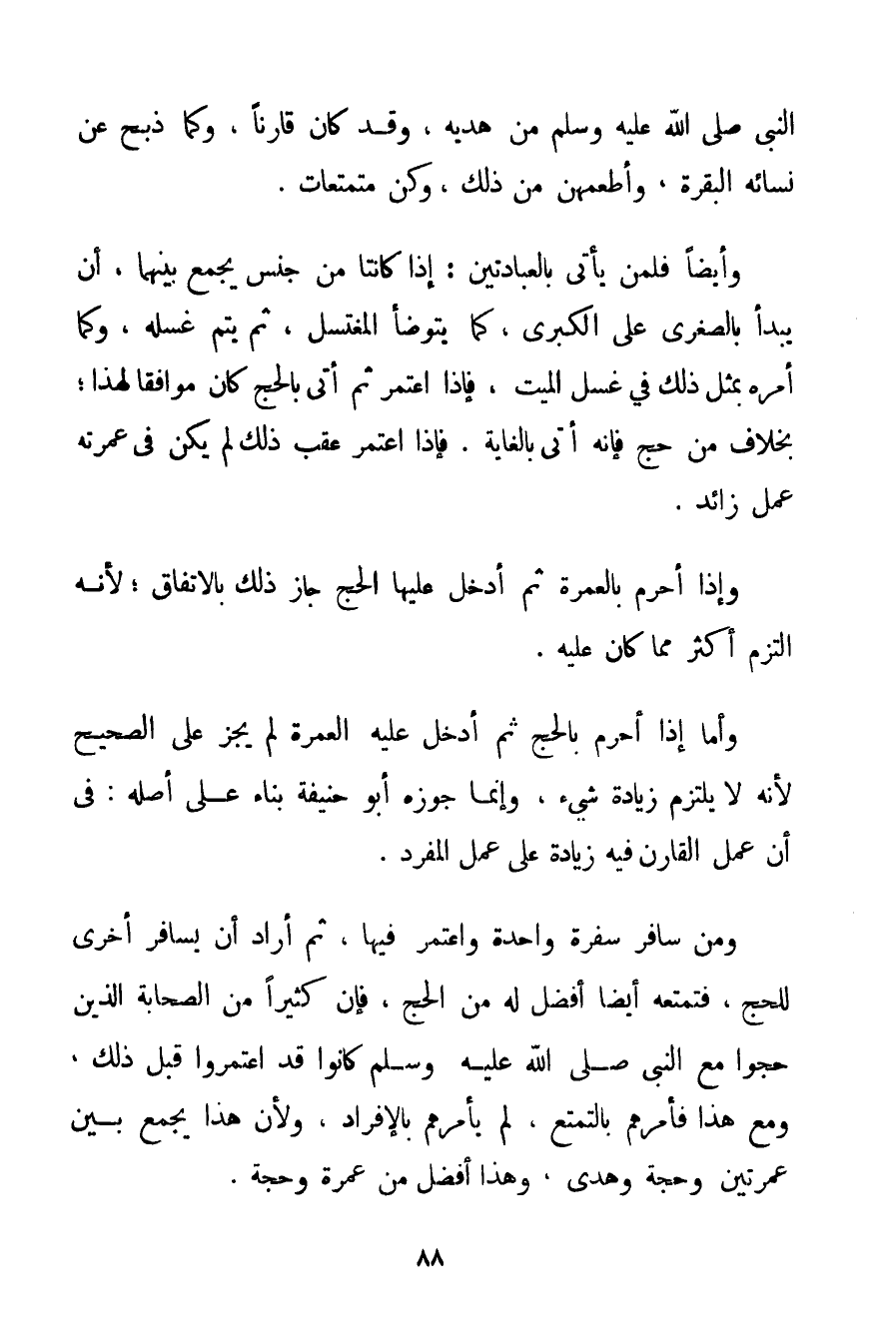 النَّبِيُّ صَلَّى اللَّهُ عَلَيْهِ وَسَلَّمَ مِنْ هَدْيِهِ وَقَدْ كَانَ قَارِنًا وَكَمَا ذَبَحَ عَنْ نِسَائِهِ الْبَقَرَةَ وَأَطْعَمَهُنَّ مِنْ ذَلِكَ وَكُنَّ مُتَمَتِّعَاتٍ. وَأَيْضًا فَلِمَنْ يَأْتِي بِالْعِبَادَتَيْنِ: إذَا كَانَتَا مِنْ جِنْسٍ يَجْمَعُ بَيْنَهُمَا أَنْ يَبْدَأَ بِالصُّغْرَى عَلَى الْكُبْرَى كَمَا يَتَوَضَّأُ الْمُغْتَسِلُ ثُمَّ يُتِمُّ غُسْلَهُ وَكَمَا أَمَرَهُ بِمِثْلِ ذَلِكَ فِي غُسْلِ الْمَيِّتِ فَإِذَا اعْتَمَرَ ثُمَّ أَتَى بِالْحَجِّ كَانَ مُوَافِقًا لِهَذَا؛ بِخِلَافِ مَنْ حَجَّ فَإِنَّهُ أَتَى بِالْغَايَةِ. فَإِذَا اعْتَمَرَ عَقِبَ ذَلِكَ لَمْ يَكُنْ فِي عُمْرَتِهِ عَمَلٌ زَائِدٌ. وَإِذَا أَحْرَمَ بِالْعُمْرَةِ ثُمَّ أَدْخَلَ عَلَيْهَا الْحَجَّ جَازَ ذَلِكَ بِالِاتِّفَاقِ؛ لِأَنَّهُ الْتَزَمَ أَكْثَرَ مِمَّا كَانَ عَلَيْهِ. وَأَمَّا إذَا أَحْرَمَ بِالْحَجِّ ثُمَّ أَدْخَلَ عَلَيْهِ الْعُمْرَةَ لَمْ يَجُزْ عَلَى الصَّحِيحِ لِأَنَّهُ لَا يَلْتَزِمُ زِيَادَةَ شَيْءٍ وَإِنَّمَا جَوَّزَهُ أَبُو حَنِيفَةَ بِنَاءً عَلَى أَصْلِهِ: فِي أَنَّ عَمَلَ الْقَارِنِ فِيهِ زِيَادَةٌ عَلَى عَمَلِ الْمُفْرِدِ. وَمَنْ سَافَرَ سَفْرَةً وَاحِدَةً وَاعْتَمَرَ فِيهَا ثُمَّ أَرَادَ أَنْ يُسَافِرَ أُخْرَى لِلْحَجِّ فَتَمَتُّعُهُ أَيْضًا أَفْضَلُ لَهُ مِنْ الْحَجِّ فَإِنَّ كَثِيرًا مِنْ الصَّحَابَةِ الَّذِينَ حَجُّوا مَعَ النَّبِيِّ صَلَّى اللَّهُ عَلَيْهِ وَسَلَّمَ كَانُوا قَدْ اعْتَمَرُوا قَبْلَ ذَلِكَ وَمَعَ هَذَا فَأَمَرَهُمْ بِالتَّمَتُّعِ لَمْ يَأْمُرْهُمْ بِالْإِفْرَادِ وَلِأَنَّ هَذَا يَجْمَعُ بَيْنَ عُمْرَتَيْنِ وَحَجَّةٍ وَهَدْيٍ وَهَذَا أَفْضَلُ مِنْ عُمْرَةٍ وَحَجَّةٍ.