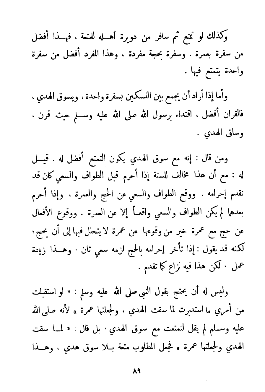 وَكَذَلِكَ لَوْ تَمَتَّعَ ثُمَّ سَافَرَ مِنْ دويرة أَهْلِهِ لِلْمُتْعَةِ فَهَذَا أَفْضَلُ مِنْ سَفْرَةٍ بِعُمْرَةِ وَسَفْرَةٍ بِحَجَّةِ مُفْرَدَةٍ وَهَذَا الْمُفْرِدُ أَفْضَلُ مِنْ سَفْرَةٍ وَاحِدَةٍ يَتَمَتَّعُ فِيهَا. وَأَمَّا إذَا أَرَادَ أَنْ يَجْمَعَ بَيْنَ النسكين بِسَفْرَةِ وَاحِدَةٍ وَيَسُوقَ الْهَدْيَ فَالْقِرَانُ أَفْضَلُ اقْتِدَاءً بِرَسُولِ اللَّهِ صَلَّى اللَّهُ عَلَيْهِ وَسَلَّمَ حَيْثُ قَرَنَ وَسَاقَ الْهَدْيَ. وَمَنْ قَالَ: إنَّهُ مَعَ سَوْقِ الْهَدْيِ يَكُونُ التَّمَتُّعُ أَفْضَلَ لَهُ. قِيلَ لَهُ: مَعَ أَنَّ هَذَا مُخَالِفٌ لِلسُّنَّةِ إذَا أَحْرَمَ قَبْلَ الطَّوَافِ وَالسَّعْيِ كَانَ قَدْ تَقَدَّمَ إحْرَامُهُ وَوَقَعَ الطَّوَافُ وَالسَّعْيُ عَنْ الْحَجِّ وَالْعُمْرَةِ وَإِذَا أَحْرَمَ بَعْدَهُمَا لَمْ يَكُنْ الطَّوَافُ وَالسَّعْيُ وَاقِعًا إلَّا عَنْ الْعُمْرَةِ. وَوُقُوعُ الْأَفْعَالِ عَنْ حَجٍّ مَعَ عُمْرَةٍ خَيْرٌ مِنْ وُقُوعِهَا عَنْ عُمْرَةٍ لَا يَتَحَلَّلُ فِيهَا إلَى أَنْ يَحُجَّ؛ لَكِنَّهُ قَدْ يَقُولُ: إذَا تَأَخَّرَ إحْرَامُهُ بِالْحَجِّ لَزِمَهُ سَعْيٌ ثَانٍ وَهَذَا زِيَادَةُ عَمَلٍ لَكِنْ هَذَا فِيهِ نِزَاعٌ كَمَا تَقَدَّمَ. وَلَيْسَ لَهُ أَنْ يَحْتَجَّ بِقَوْلِ النَّبِيِّ صَلَّى اللَّهُ عَلَيْهِ وَسَلَّمَ {لَوْ اسْتَقْبَلْت مِنْ أَمْرِي مَا اسْتَدْبَرْت لَمَا سُقْت الْهَدْيَ وَلَجَعَلْتهَا عُمْرَةً} لِأَنَّهُ صَلَّى اللَّهُ عَلَيْهِ وَسَلَّمَ لَمْ يَقُلْ لَتَمَتَّعْت مَعَ سَوْقِ الْهَدْيِ بَلْ قَالَ: " لَمَا سُقْت الْهَدْيَ وَلَجَعَلْتهَا عُمْرَةً " فَجَعَلَ الْمَطْلُوبَ مُتْعَةً بِلَا سَوْقِ هَدْيٍ وَهَذَا