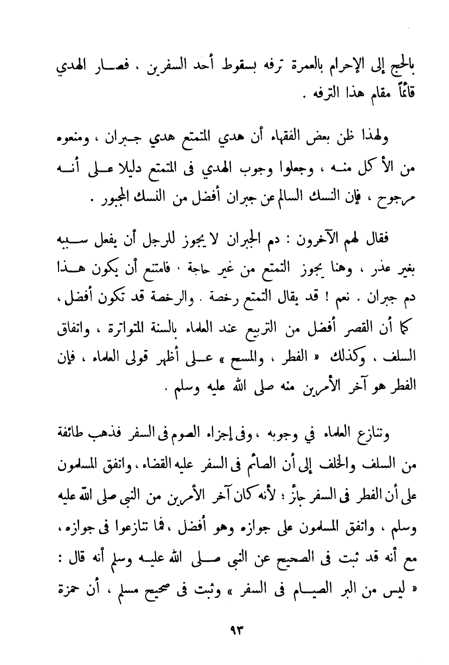 بِالْحَجِّ إلَى الْإِحْرَامِ بِالْعُمْرَةِ تَرَفَّهَ بِسُقُوطِ أَحَدِ السَّفَرَيْنِ فَصَارَ الْهَدْيُ قَائِمًا مَقَامَ هَذَا التَّرَفُّهِ. وَلِهَذَا ظَنَّ بَعْضُ الْفُقَهَاءِ أَنَّ هَدْيَ الْمُتَمَتِّعِ هَدْيُ جبران وَمَنَعُوهُ مِنْ الْأَكْلِ مِنْهُ وَجَعَلُوا وُجُوبَ الْهَدْيِ فِي الْمُتَمَتِّعِ دَلِيلًا عَلَى أَنَّهُ مَرْجُوحٌ فَإِنَّ النُّسُكَ السَّالِمَ عَنْ جبران أَفْضَلُ مِنْ النُّسُكِ الْمَجْبُورِ. فَقَالَ لَهُمْ الْآخَرُونَ: دَمُ الْجُبْرَانِ لَا يَجُوزُ لِلرَّجُلِ أَنْ يَفْعَلَ سَبَبَهُ بِغَيْرِ عُذْرٍ وَهُنَا يَجُوزُ التَّمَتُّعُ مِنْ غَيْرِ حَاجَةٍ فَامْتَنَعَ أَنْ يَكُونَ هَذَا دَمَ جبران. نَعَمْ قَدْ يُقَالُ التَّمَتُّعُ رُخْصَةٌ وَالرُّخْصَةُ قَدْ تَكُونُ أَفْضَلَ كَمَا أَنَّ الْقَصْرَ أَفْضَلُ مِنْ التَّرْبِيعِ عِنْدَ الْعُلَمَاءِ بِالسُّنَّةِ الْمُتَوَاتِرَةِ وَاتِّفَاقِ السَّلَفِ وَكَذَلِكَ " الْفِطْرُ وَالْمَسْحُ " عَلَى أَظْهَرِ قَوْلَيْ الْعُلَمَاءِ فَإِنَّ الْفِطْرَ هُوَ آخِرُ الْأَمْرَيْنِ مِنْهُ صَلَّى اللَّهُ عَلَيْهِ وَسَلَّمَ. وَتَنَازَعَ الْعُلَمَاءُ فِي وُجُوبِهِ وَفِي إجْزَاءِ الصَّوْمِ فِي السَّفَرِ فَذَهَبَ طَائِفَةٌ مِنْ السَّلَفِ وَالْخَلَفِ إلَى أَنَّ الصَّائِمَ فِي السَّفَرِ عَلَيْهِ الْقَضَاءُ وَاتَّفَقَ الْمُسْلِمُونَ عَلَى أَنَّ الْفِطْرَ فِي السَّفَرِ جَائِزٌ؛ لِأَنَّهُ كَانَ آخِرَ الْأَمْرَيْنِ مِنْ النَّبِيِّ صَلَّى اللَّهُ عَلَيْهِ وَسَلَّمَ وَاتَّفَقَ الْمُسْلِمُونَ عَلَى جَوَازِهِ وَهُوَ أَفْضَلُ فَمَا تَنَازَعُوا فِي جَوَازِهِ مَعَ أَنَّهُ قَدْ ثَبَتَ فِي الصَّحِيحِ عَنْ النَّبِيِّ صَلَّى اللَّهُ عَلَيْهِ وَسَلَّمَ أَنَّهُ قَالَ: {لَيْسَ مِنْ الْبِرِّ الصِّيَامُ فِي السَّفَرِ} وَثَبَتَ فِي صَحِيحِ مُسْلِمٍ {أَنَّ حَمْزَةَ