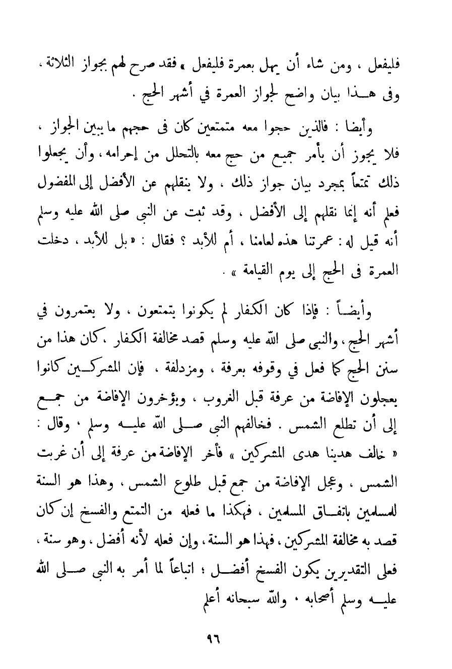 فَلْيَفْعَلْ وَمَنْ شَاءَ أَنْ يُهِلَّ بِعُمْرَةِ فَلْيَفْعَلْ} فَقَدْ صَرَّحَ لَهُمْ بِجَوَازِ الثَّلَاثَةِ وَفِي هَذَا بَيَانٌ وَاضِحٌ لِجَوَازِ الْعُمْرَةِ فِي أَشْهُرِ الْحَجِّ. وَأَيْضًا: فَاَلَّذِينَ حَجُّوا مَعَهُ مُتَمَتِّعِينَ كَانَ فِي حَجِّهِمْ مَا يُبَيِّنُ الْجَوَازَ فَلَا يَجُوزُ أَنْ يَأْمُرَ جَمِيعَ مَنْ حَجَّ مَعَهُ بِالتَّحَلُّلِ مِنْ إحْرَامِهِ وَأَنْ يَجْعَلُوا ذَلِكَ تَمَتُّعًا بِمُجَرَّدِ بَيَانِ جَوَازِ ذَلِكَ وَلَا يَنْقُلُهُمْ عَنْ الْأَفْضَلِ إلَى الْمَفْضُولِ فَعُلِمَ أَنَّهُ إنَّمَا نَقَلَهُمْ إلَى الْأَفْضَلِ وَقَدْ ثَبَتَ {عن النَّبِيِّ صَلَّى اللَّهُ عَلَيْهِ وَسَلَّمَ أَنَّهُ قِيلَ لَهُ: عُمْرَتُنَا هَذِهِ لِعَامِنَا أَمْ لِلْأَبَدِ؟ فَقَالَ: بَلْ لِلْأَبَدِ دَخَلَتْ الْعُمْرَةُ فِي الْحَجِّ إلَى يَوْمِ الْقِيَامَةِ} . وَأَيْضًا: فَإِذَا كَانَ الْكُفَّارُ لَمْ يَكُونُوا يَتَمَتَّعُونَ وَلَا يَعْتَمِرُونَ فِي أَشْهُرِ الْحَجِّ وَالنَّبِيُّ صَلَّى اللَّهُ عَلَيْهِ وَسَلَّمَ قَصَدَ مُخَالَفَةَ الْكُفَّارِ كَانَ هَذَا مِنْ سُنَنِ الْحَجِّ كَمَا فَعَلَ فِي وُقُوفِهِ بِعَرَفَةَ وَمُزْدَلِفَةَ فَإِنَّ الْمُشْرِكِينَ كَانُوا يُعَجِّلُونَ الْإِفَاضَةَ مِنْ عَرَفَةَ قَبْلَ الْغُرُوبِ وَيُؤَخِّرُونَ الْإِفَاضَةَ مِنْ جَمْعٍ إلَى أَنْ تَطْلُعَ الشَّمْسُ. فَخَالَفَهُمْ النَّبِيُّ صَلَّى اللَّهُ عَلَيْهِ وَسَلَّمَ وَقَالَ: {خَالَفَ هَدْيُنَا هَدْيَ الْمُشْرِكِينَ} فَأَخَّرَ الْإِفَاضَةَ مِنْ عَرَفَةَ إلَى أَنْ غَرَبَتْ الشَّمْسُ وَعَجَّلَ الْإِفَاضَةَ مِنْ جَمْعٍ قَبْلَ طُلُوعِ الشَّمْسِ وَهَذَا هُوَ السُّنَّةُ لِلْمُسْلِمِينَ بِاتِّفَاقِ الْمُسْلِمِينَ فَهَكَذَا مَا فَعَلَهُ مِنْ التَّمَتُّعِ وَالْفَسْخِ إنْ كَانَ قَصَدَ بِهِ مُخَالَفَةَ الْمُشْرِكِينَ فَهَذَا هُوَ السُّنَّةُ وَإِنْ فَعَلَهُ لِأَنَّهُ أَفْضَلُ وَهُوَ سُنَّةٌ فَعَلَى التَّقْدِيرَيْنِ يَكُونُ الْفَسْخُ أَفْضَلَ؛ اتِّبَاعًا لِمَا أَمَرَ بِهِ النَّبِيُّ صَلَّى اللَّهُ عَلَيْهِ وَسَلَّمَ أَصْحَابَهُ وَاَللَّهُ سُبْحَانَهُ أَعْلَمُ.