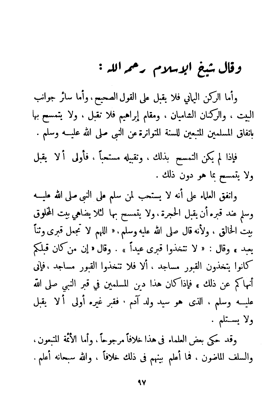 وَاتَّفَقَ الْعُلَمَاءُ عَلَى أَنَّهُ لَا يُسْتَحَبُّ لِمَنْ سَلَّمَ عَلَى النَّبِيِّ صَلَّى اللَّهُ عَلَيْهِ وَسَلَّمَ عِنْدَ قَبْرِهِ أَنْ يُقَبِّلَ الْحُجْرَةَ وَلَا يَتَمَسَّحَ بِهَا لِئَلَّا يُضَاهِيَ بَيْتُ الْمَخْلُوقِ بَيْتَ الْخَالِقِ وَلِأَنَّهُ {قال صَلَّى اللَّهُ عَلَيْهِ وَسَلَّمَ اللَّهُمَّ لَا تَجْعَلْ قَبْرِي وَثَنًا يُعْبَدُ} وَقَالَ: {لَا تَتَّخِذُوا قَبْرِي عِيدًا} . وَقَالَ {إنَّ مَنْ كَانَ قَبْلَكُمْ كَانُوا يَتَّخِذُونَ الْقُبُورَ مَسَاجِدَ أَلَا فَلَا تَتَّخِذُوا الْقُبُورَ مَسَاجِدَ فَإِنِّي أَنْهَاكُمْ عَنْ ذَلِكَ} فَإِذَا كَانَ هَذَا دِينَ الْمُسْلِمِينَ فِي قَبْرِ النَّبِيِّ صَلَّى اللَّهُ عَلَيْهِ وَسَلَّمَ الَّذِي هُوَ سَيِّدُ وَلَدِ آدَمَ فَقَبْرُ غَيْرِهِ أَوْلَى أَنْ لَا يُقَبَّلَ وَلَا يُسْتَلَمَ. وَقَدْ حَكَى بَعْضُ الْعُلَمَاءِ فِي هَذَا خِلَافًا مَرْجُوحًا وَأَمَّا الْأَئِمَّةُ الْمُتَّبَعُونَ وَالسَّلَفُ الْمَاضُونَ فَمَا أَعْلَمُ بَيْنَهُمْ فِي ذَلِكَ خِلَافًا وَاَللَّهُ سُبْحَانَهُ أَعْلَمُ.