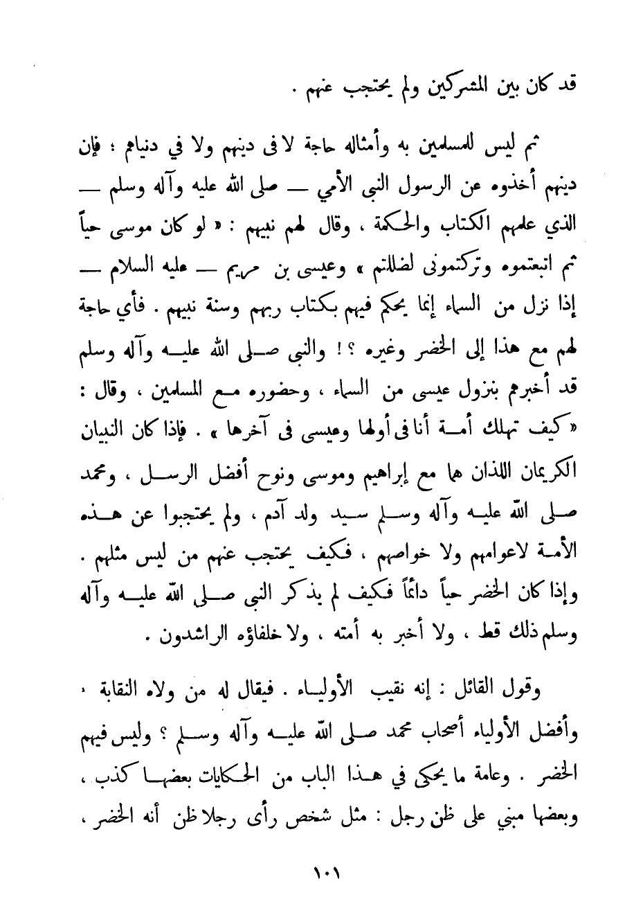 قَدْ كَانَ بَيْنَ الْمُشْرِكِينَ وَلَمْ يَحْتَجِبْ عَنْهُمْ. ثُمَّ لَيْسَ لِلْمُسْلِمِينَ بِهِ وَأَمْثَالِهِ حَاجَةٌ لَا فِي دِينِهِمْ وَلَا فِي دُنْيَاهُمْ؛ فَإِنَّ دِينَهُمْ أَخَذُوهُ عَنْ الرَّسُولِ النَّبِيِّ الْأُمِّيِّ - صَلَّى اللَّهُ عَلَيْهِ وَآلِهِ وَسَلَّمَ - الَّذِي عَلَّمَهُمْ الْكِتَابَ وَالْحِكْمَةَ وَقَالَ لَهُمْ نَبِيُّهُمْ: " {لَوْ كَانَ مُوسَى حَيًّا ثُمَّ اتَّبَعْتُمُوهُ وَتَرَكْتُمُونِي لَضَلَلْتُمْ} وَعِيسَى ابْنُ مَرْيَمَ - عَلَيْهِ السَّلَامُ - إذَا نَزَلَ مِنْ السَّمَاءِ إنَّمَا يَحْكُمُ فِيهِمْ بِكِتَابِ رَبِّهِمْ وَسُنَّةِ نَبِيَّهُمْ. فَأَيُّ حَاجَةٍ لَهُمْ مَعَ هَذَا إلَى الْخَضِرِ وَغَيْرِهِ وَالنَّبِيُّ صَلَّى اللَّهُ عَلَيْهِ وَآلِهِ وَسَلَّمَ قَدْ أَخْبَرَهُمْ بِنُزُولِ عِيسَى مِنْ السَّمَاءِ وَحُضُورِهِ مَعَ الْمُسْلِمِينَ وَقَالَ: " {كَيْفَ تَهْلِكُ أُمَّةٌ أَنَا فِي أَوَّلِهَا وَعِيسَى فِي آخِرِهَا} . فَإِذَا كَانَ النَّبِيَّانِ الْكَرِيمَانِ اللَّذَانِ هُمَا مَعَ إبْرَاهِيمَ مُوسَى وَنُوحٌ أَفْضَلَ الرُّسُلِ وَمُحَمَّدٌ صَلَّى اللَّهُ عَلَيْهِ وَآلِهِ وَسَلَّمَ سَيِّدُ وَلَدِ آدَمَ وَلَمْ يَحْتَجِبُوا عَنْ هَذِهِ الْأُمَّةِ لَا عَوَامُّهُمْ وَلَا خَوَاصُّهُمْ فَكَيْفَ يَحْتَجِبُ عَنْهُمْ مَنْ لَيْسَ مِثْلَهُمْ. وَإِذَا كَانَ الْخَضِرُ حَيًّا دَائِمًا فَكَيْفَ لَمْ يَذْكُرْ النَّبِيُّ صَلَّى اللَّهُ عَلَيْهِ وَآلِهِ وَسَلَّمَ ذَلِكَ قَطُّ وَلَا أَخْبَرَ بِهِ أُمَّتَهُ وَلَا خُلَفَاؤُهُ الرَّاشِدُونَ. وَقَوْلُ الْقَائِلِ: إنَّهُ نَقِيبُ الْأَوْلِيَاءِ. فَيُقَالُ لَهُ مَنْ وَلَّاهُ النِّقَابَةَ وَأَفْضَلُ الْأَوْلِيَاءِ أَصْحَابُ مُحَمَّدٍ صَلَّى اللَّهُ عَلَيْهِ وَآلِهِ وَسَلَّمَ؟ وَلَيْسَ فِيهِمْ الْخَضِرُ. وَعَامَّةُ مَا يُحْكَى فِي هَذَا الْبَابِ مِنْ الْحِكَايَاتِ بَعْضُهَا كَذِبٌ وَبَعْضُهَا مَبْنِيٌّ عَلَى ظَنِّ رَجُلٍ: مِثْلُ شَخْصٍ رَأَى رَجُلًا ظَنَّ أَنَّهُ الْخَضِرُ