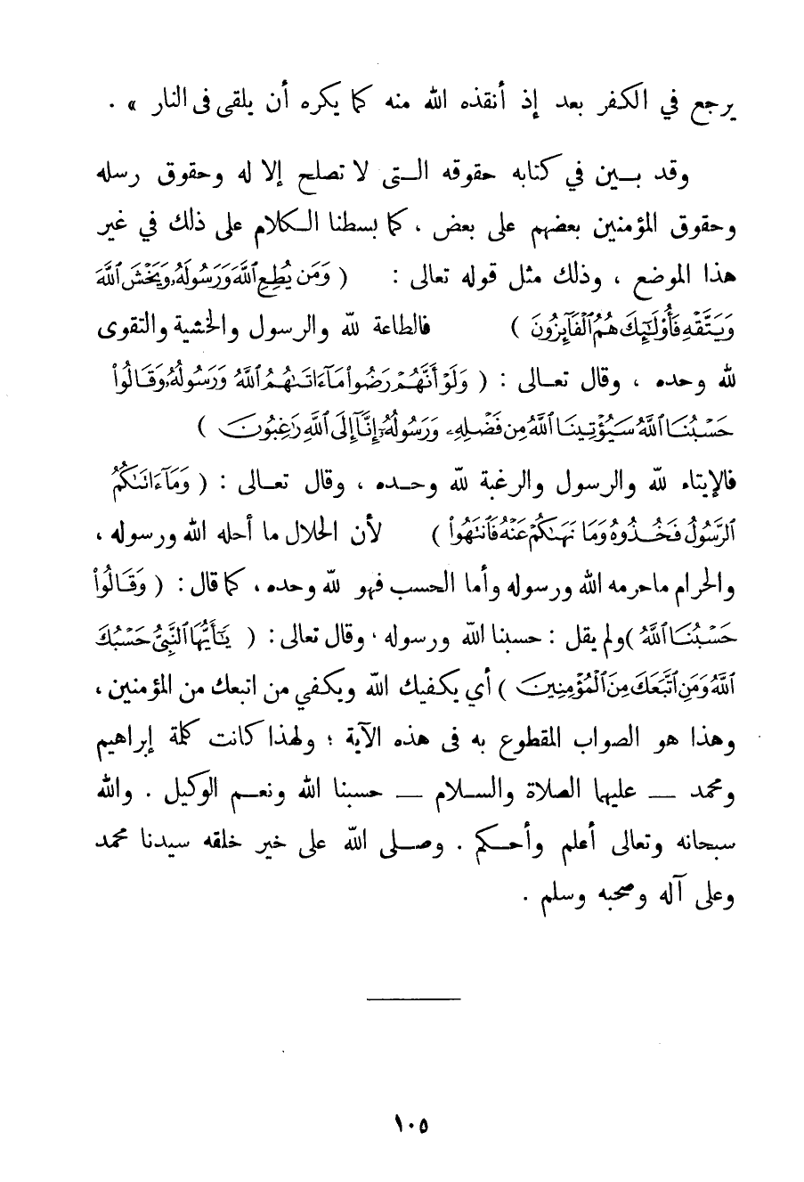 يَرْجِعَ فِي الْكُفْرِ بَعْدَ إذْ أَنْقَذَهُ اللَّهُ مِنْهُ كَمَا يَكْرَهُ أَنْ يُلْقَى فِي النَّارِ} . وَقَدْ بَيَّنَ فِي كِتَابِهِ حُقُوقَهُ الَّتِي لَا تَصْلُحُ إلَّا لَهُ وَحُقُوقَ رُسُلِهِ وَحُقُوقَ الْمُؤْمِنِينَ بَعْضُهُمْ عَلَى بَعْضٍ كَمَا بَسَطْنَا الْكَلَامَ عَلَى ذَلِكَ فِي غَيْرِ هَذَا الْمَوْضِعِ وَذَلِكَ مِثْلُ قَوْله تَعَالَى {وَمَنْ يُطِعِ اللَّهَ وَرَسُولَهُ وَيَخْشَ اللَّهَ وَيَتَّقْهِ فَأُولَئِكَ هُمُ الْفَائِزُونَ} فَالطَّاعَةُ لِلَّهِ وَالرَّسُولِ وَالْخَشْيَةُ وَالتَّقْوَى لِلَّهِ وَحْدَهُ وَقَالَ تَعَالَى: {وَلَوْ أَنَّهُمْ رَضُوا مَا آتَاهُمُ اللَّهُ وَرَسُولُهُ وَقَالُوا حَسْبُنَا اللَّهُ سَيُؤْتِينَا اللَّهُ مِنْ فَضْلِهِ وَرَسُولُهُ إنَّا إلَى اللَّهِ رَاغِبُونَ} فَالْإِيتَاءُ لِلَّهِ وَالرَّسُولِ وَالرَّغْبَةُ لِلَّهِ وَحْدَهُ وَقَالَ تَعَالَى: {وَمَا آتَاكُمُ الرَّسُولُ فَخُذُوهُ وَمَا نَهَاكُمْ عَنْهُ فَانْتَهُوا} لِأَنَّ الْحَلَالَ مَا أَحَلَّهُ اللَّهُ وَرَسُولُهُ وَالْحَرَامَ مَا حَرَّمَهُ اللَّهُ وَرَسُولُهُ وَأَمَّا الحسب فَهُوَ لِلَّهِ وَحْدَهُ كَمَا قَالَ: {وَقَالُوا حَسْبُنَا اللَّهُ} وَلَمْ يَقُلْ: حَسْبُنَا اللَّهُ وَرَسُولُهُ وَقَالَ تَعَالَى: {يَا أَيُّهَا النَّبِيُّ حَسْبُكَ اللَّهُ وَمَنِ اتَّبَعَكَ مِنَ الْمُؤْمِنِينَ} أَيْ يَكْفِيك اللَّهُ وَيَكْفِي مَنْ اتَّبَعَك مِنْ الْمُؤْمِنِينَ وَهَذَا هُوَ الصَّوَابُ الْمَقْطُوعُ بِهِ فِي هَذِهِ الْآيَةِ؛ وَلِهَذَا كَانَتْ كَلِمَةُ إبْرَاهِيمَ وَمُحَمَّدٍ - عَلَيْهِمَا الصَّلَاةُ وَالسَّلَامُ - حَسْبُنَا اللَّهُ وَنِعْمَ الْوَكِيلُ. وَاَللَّهُ سُبْحَانَهُ وَتَعَالَى أَعْلَمُ وَأَحْكَمُ. وَصَلَّى اللَّهُ عَلَى خَيْرِ خَلْقِهِ سَيِّدِنَا مُحَمَّدٍ وَعَلَى آلِهِ وَصَحْبِهِ وَسَلَّمَ.