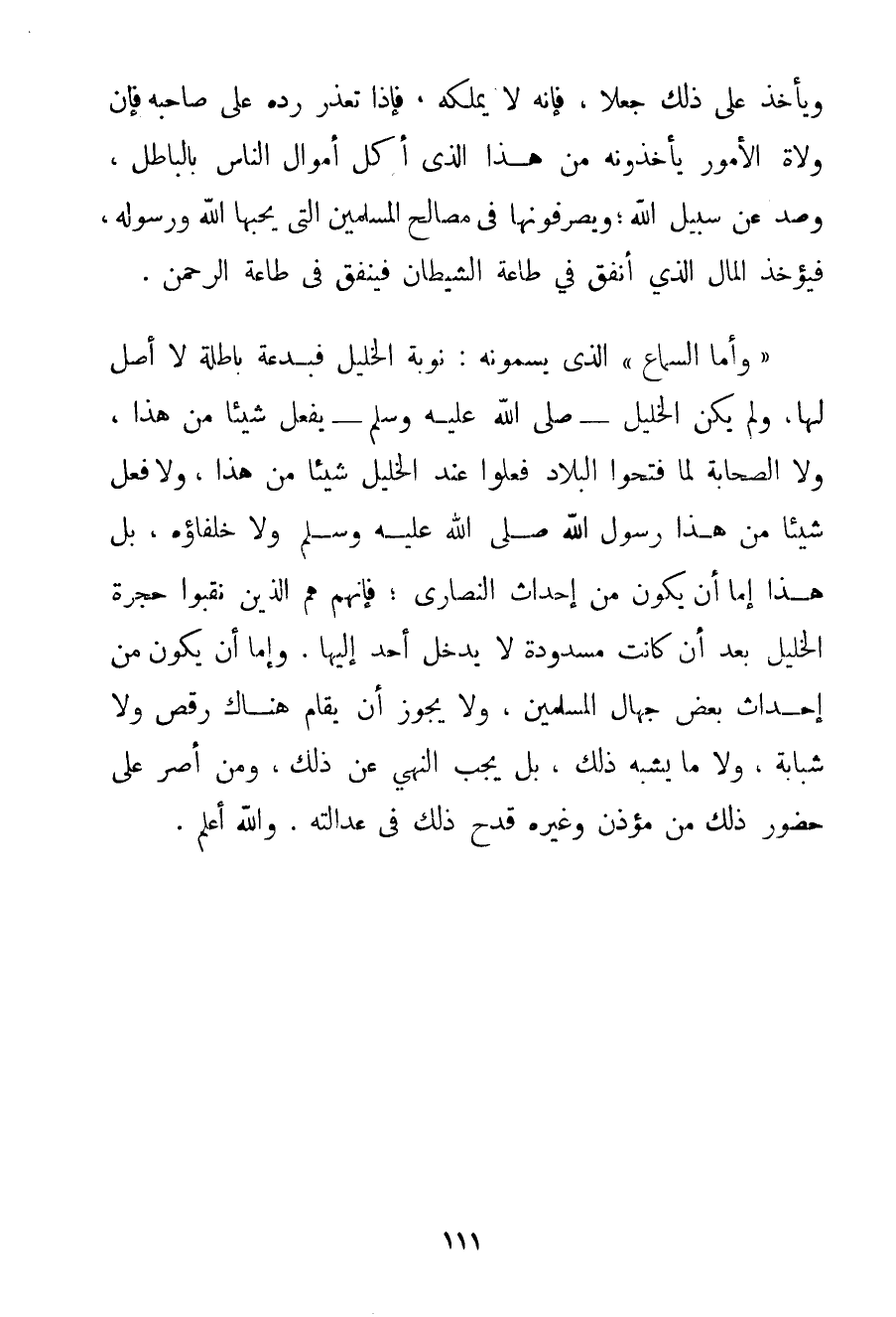 وَيَأْخُذُ عَلَى ذَلِكَ جُعْلًا فَإِنَّهُ لَا يَمْلِكُهُ فَإِذَا تَعَذَّرَ رَدُّهُ عَلَى صَاحِبِهِ فَإِنَّ وُلَاةَ الْأُمُورِ يَأْخُذُونَهُ مِنْ هَذَا الَّذِي أَكَلَ أَمْوَالَ النَّاسِ بِالْبَاطِلِ وَصَدَّ عَنْ سَبِيلِ اللَّهِ؛ وَيَصْرِفُونَهَا فِي مَصَالِحِ الْمُسْلِمِينَ الَّتِي يُحِبُّهَا اللَّهُ وَرَسُولُهُ فَيُؤْخَذُ الْمَالُ الَّذِي أُنْفِقَ فِي طَاعَةِ الشَّيْطَانِ فَيُنْفَقُ فِي طَاعَةِ الرَّحْمَنِ. " وَأَمَّا السَّمَاعُ " الَّذِي يُسَمُّونَهُ: نَوْبَةَ الْخَلِيلِ فَبِدْعَةٌ بَاطِلَةٌ لَا أَصْلَ لَهَا وَلَمْ يَكُنْ الْخَلِيلُ - صَلَّى اللَّهُ عَلَيْهِ وَسَلَّمَ - يَفْعَلُ شَيْئًا مِنْ هَذَا وَلَا الصَّحَابَةُ لَمَّا فَتَحُوا الْبِلَادَ فَعَلُوا عِنْدَ الْخَلِيلِ شَيْئًا مِنْ هَذَا وَلَا فَعَلَ شَيْئًا مِنْ هَذَا رَسُولُ اللَّهِ صَلَّى اللَّهُ عَلَيْهِ وَسَلَّمَ وَلَا خُلَفَاؤُهُ بَلْ هَذَا إمَّا أَنْ يَكُونَ مِنْ إحْدَاثِ النَّصَارَى؛ فَإِنَّهُمْ هُمْ الَّذِينَ نَقَبُوا حُجْرَةَ الْخَلِيلِ بَعْدَ أَنْ كَانَتْ مَسْدُودَةً لَا يَدْخُلُ أَحَدٌ إلَيْهَا. وَإِمَّا أَنْ يَكُونَ مِنْ إحْدَاثِ بَعْضِ جُهَّالِ الْمُسْلِمِينَ وَلَا يَجُوزُ أَنْ يُقَامَ هُنَاكَ رَقْصٌ وَلَا شَبَّابَةٌ وَلَا مَا يُشْبِهُ ذَلِكَ بَلْ يَجِبُ النَّهْيُ عَنْ ذَلِكَ وَمَنْ أَصَرَّ عَلَى حُضُورِ ذَلِكَ مِنْ مُؤَذِّنٍ وَغَيْرِهِ قَدَحَ ذَلِكَ فِي عَدَالَتِهِ. وَاَللَّهُ أَعْلَمُ.