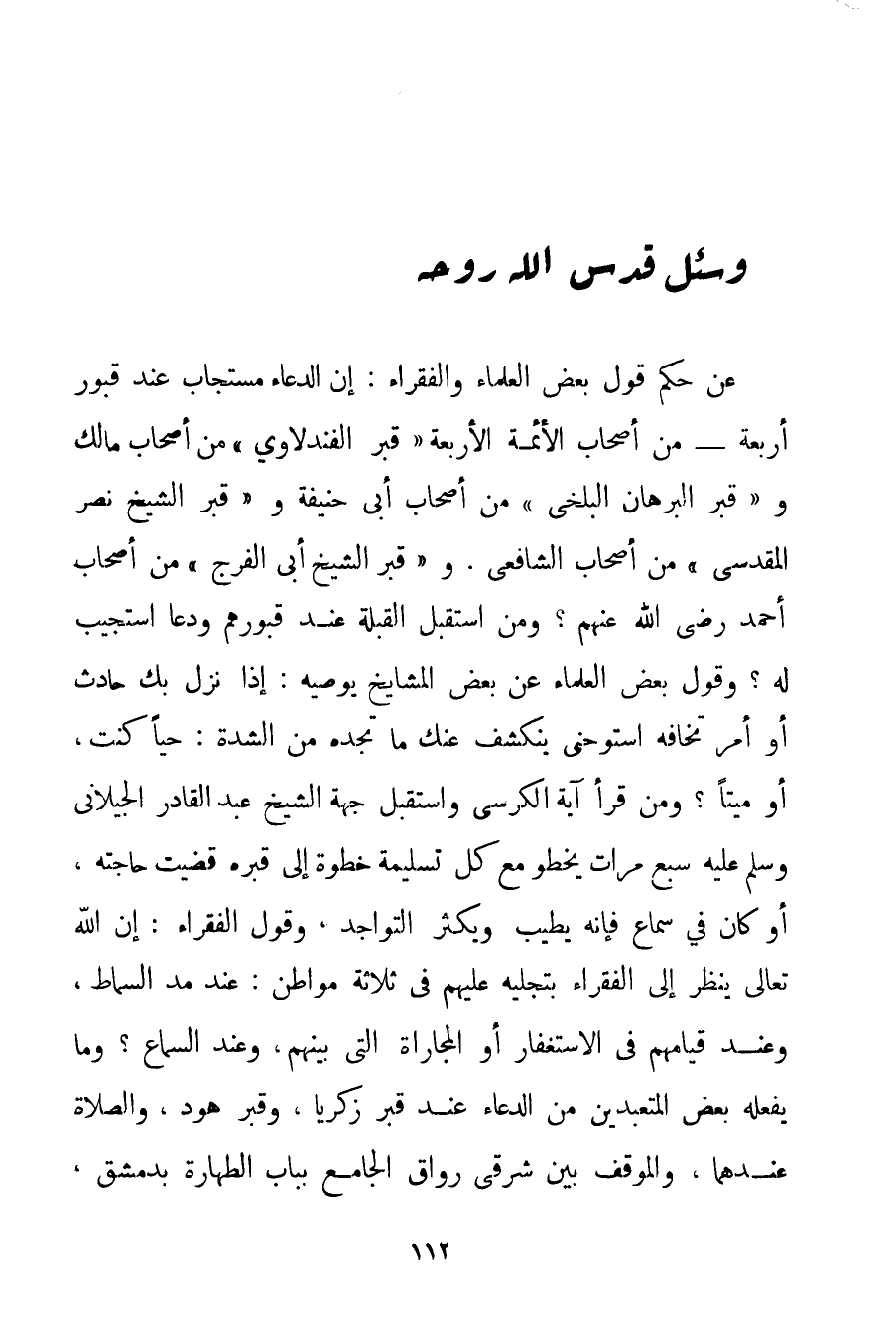 عَنْ حُكْمِ قَوْلِ بَعْضِ الْعُلَمَاءِ وَالْفُقَرَاءِ: إنَّ الدُّعَاءَ مُسْتَجَابٌ عِنْدَ قُبُورِ أَرْبَعَةٍ - مِنْ أَصْحَابِ الْأَئِمَّةِ الْأَرْبَعَةِ " قَبْرُ الفندلاوي " مِنْ أَصْحَابِ مَالِكٍ و " قَبْرُ الْبُرْهَانِ البلخي " مِنْ أَصْحَابِ أَبِي حَنِيفَةَ و " قَبْرُ الشَّيْخِ نَصْرٍ المقدسي " مِنْ أَصْحَابِ الشَّافِعِيِّ. و " قَبْرُ الشَّيْخِ أَبِي الْفَرَجِ " مِنْ أَصْحَابِ أَحْمَد رَضِيَ اللَّهُ عَنْهُمْ؟ وَمَنْ اسْتَقْبَلَ الْقِبْلَةَ عِنْدَ قُبُورِهِمْ وَدَعَا اُسْتُجِيبَ لَهُ؟ وَقَوْلُ بَعْضِ الْعُلَمَاءِ عَنْ بَعْضِ الْمَشَايِخِ يُوصِيهِ: إذَا نَزَلَ بِك حَادِثٌ أَوْ أَمْرٌ تَخَافُهُ اسْتَوْحِنِي يَنْكَشِفُ عَنْك مَا تَجِدُهُ مِنْ الشِّدَّةِ: حَيًّا كُنْت أَوْ مَيِّتًا؟ وَمَنْ قَرَأَ آيَةَ الْكُرْسِيِّ وَاسْتَقْبَلَ جِهَةَ الشَّيْخِ عَبْدِ الْقَادِرِ الجيلاني وَسَلَّمَ عَلَيْهِ سَبْعَ مَرَّاتٍ يَخْطُو مَعَ كُلِّ تَسْلِيمَةٍ خَطْوَةً إلَى قَبْرِهِ قُضِيَتْ حَاجَتُهُ أَوْ كَانَ فِي سَمَاعٍ فَإِنَّهُ يَطِيبُ وَيَكْثُرُ التَّوَاجُدُ وَقَوْلُ الْفُقَرَاءِ: إنَّ اللَّهَ تَعَالَى يَنْظُرُ إلَى الْفُقَرَاءِ بِتَجَلِّيهِ عَلَيْهِمْ فِي ثَلَاثَةِ مَوَاطِنَ: عِنْدَ مَدِّ السِّمَاطِ وَعِنْدَ قِيَامِهِمْ فِي الِاسْتِغْفَارِ أَوْ الْمُجَارَاةِ الَّتِي بَيْنَهُمْ وَعِنْدَ السَّمَاعِ؟ وَمَا يَفْعَلُهُ بَعْضُ الْمُتَعَبِّدِينَ مِنْ الدُّعَاءِ عِنْدَ قَبْرِ زَكَرِيَّا وَقَبْرِ هُودٍ وَالصَّلَاةِ عِنْدَهُمَا وَالْمَوْقِفِ بَيْنَ شَرْقِيِّ رِوَاقِ الْجَامِعِ بِبَابِ الطَّهَارَةِ بِدِمَشْقَ