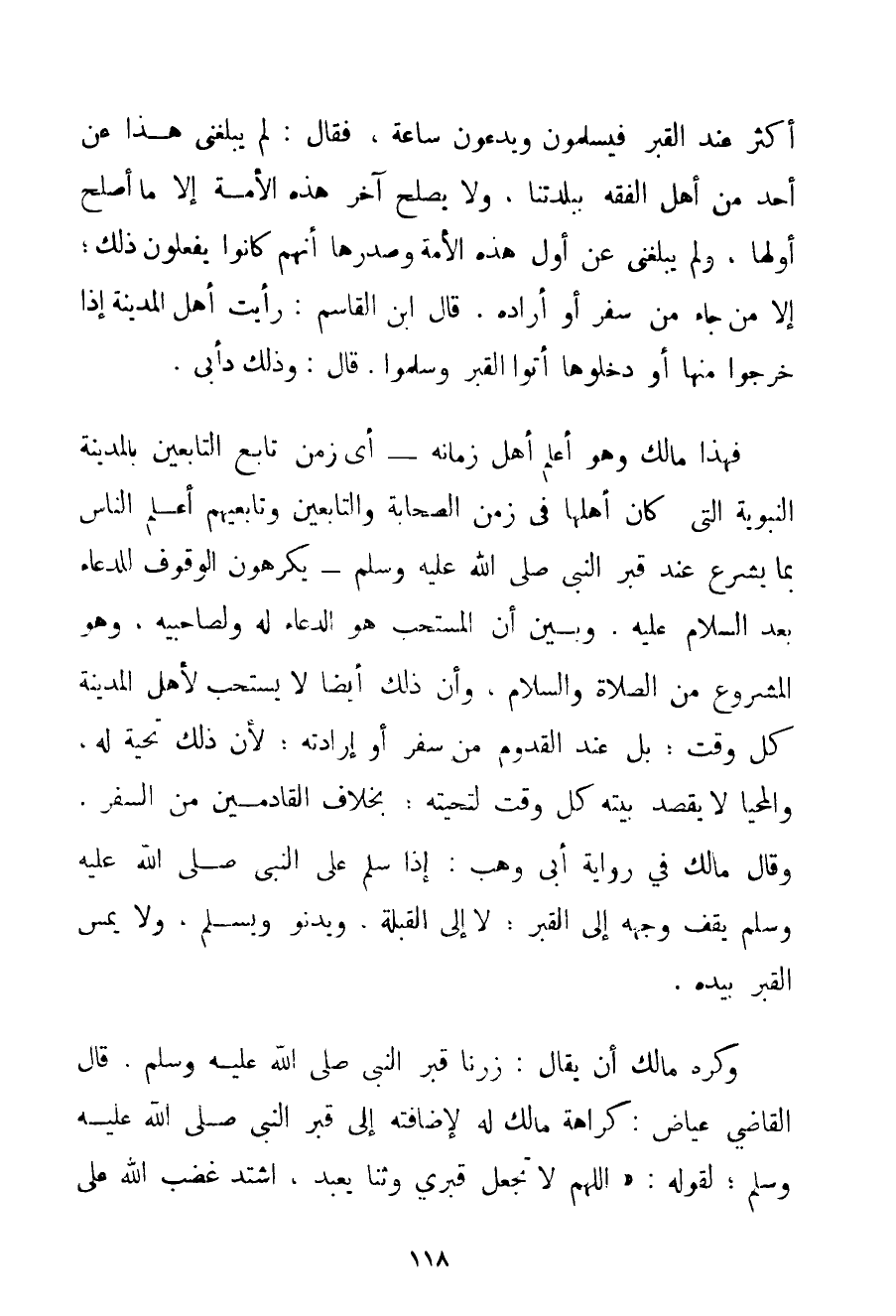 أَكْثَرَ عِنْدَ الْقَبْرِ فَيُسَلِّمُونَ وَيَدْعُونَ سَاعَةً فَقَالَ: لَمْ يَبْلُغْنِي هَذَا عَنْ أَحَدٍ مِنْ أَهْلِ الْفِقْهِ بِبَلْدَتِنَا وَلَا يُصْلِحُ آخِرَ هَذِهِ الْأُمَّةِ إلَّا مَا أَصْلَحَ أَوَّلَهَا وَلَمْ يَبْلُغْنِي عَنْ أَوَّلِ هَذِهِ الْأُمَّةِ وَصَدْرِهَا أَنَّهُمْ كَانُوا يَفْعَلُونَ ذَلِكَ؛ إلَّا مَنْ جَاءَ مَنْ سَفَرٍ أَوْ أَرَادَهُ. قَالَ ابْنُ الْقَاسِمِ: رَأَيْت أَهْلَ الْمَدِينَةِ إذَا خَرَجُوا مِنْهَا أَوْ دَخَلُوهَا أَتَوْا الْقَبْرَ وَسَلَّمُوا. قَالَ: وَذَلِكَ دَأْبِي. فَهَذَا مَالِكٌ وَهُوَ أَعْلَمُ أَهْلِ زَمَانِهِ - أَيْ زَمَنِ تَابِعِ التَّابِعِينَ بِالْمَدِينَةِ النَّبَوِيَّةِ الَّذِينَ كَانَ أَهْلُهَا فِي زَمَنِ الصَّحَابَةِ وَالتَّابِعِينَ وَتَابِعِيهِمْ أَعْلَمَ النَّاسِ بِمَا يُشْرَعُ عِنْدَ قَبْرِ النَّبِيِّ صَلَّى اللَّهُ عَلَيْهِ وَسَلَّمَ - يَكْرَهُونَ الْوُقُوفَ لِلدُّعَاءِ بَعْدَ السَّلَامِ عَلَيْهِ. وَبَيَّنَ أَنَّ الْمُسْتَحَبَّ هُوَ الدُّعَاءُ لَهُ وَلِصَاحِبَيْهِ وَهُوَ الْمَشْرُوعُ مِنْ الصَّلَاةِ وَالسَّلَامِ وَأَنَّ ذَلِكَ أَيْضًا لَا يُسْتَحَبُّ لِأَهْلِ الْمَدِينَةِ كُلَّ وَقْتٍ. بَلْ عِنْدَ الْقُدُومِ مِنْ سَفَرٍ أَوْ إرَادَتِهِ؛ لِأَنَّ ذَلِكَ تَحِيَّةٌ لَهُ وَالْمُحَيَّا لَا يُقْصَدُ بَيْتُهُ كُلَّ وَقْتٍ لِتَحِيَّتِهِ؛ بِخِلَافِ الْقَادِمَيْنِ مِنْ السَّفَرِ. وَقَالَ مَالِكٌ فِي رِوَايَةِ أَبِي وَهْبٍ: إذَا سَلَّمَ عَلَى النَّبِيِّ صَلَّى اللَّهُ عَلَيْهِ وَسَلَّمَ يَقِفُ وَجْهَهُ إلَى الْقَبْرِ؛ لَا إلَى الْقِبْلَةِ وَيَدْنُو وَيُسَلِّمُ وَلَا يَمَسُّ الْقَبْرَ بِيَدِهِ. وَكَرِهَ مَالِكٌ أَنْ يُقَالَ: زُرْنَا قَبْرَ النَّبِيِّ صَلَّى اللَّهُ عَلَيْهِ وَسَلَّمَ. قَالَ الْقَاضِي عِيَاضٌ: كَرَاهَةُ مَالِكٍ لَهُ لِإِضَافَتِهِ إلَى قَبْرِ النَّبِيِّ صَلَّى اللَّهُ عَلَيْهِ وَسَلَّمَ لِقَوْلِهِ: " {اللَّهُمَّ لَا تَجْعَلُ قَبْرِي وَثَنًا يُعْبَدُ اشْتَدَّ غَضَبُ اللَّهِ عَلَى قَوْمٍ