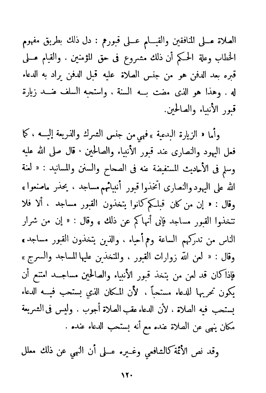 الصَّلَاةِ عَلَى الْمُنَافِقِينَ وَالْقِيَامِ عَلَى قُبُورِهِمْ: دَلَّ ذَلِكَ بِطَرِيقِ مَفْهُومِ الْخِطَابِ وَعِلَّةِ الْحُكْمِ أَنَّ ذَلِكَ مَشْرُوعٌ فِي حَقِّ الْمُؤْمِنِينَ. وَالْقِيَامُ عَلَى قَبْرِهِ بَعْدَ الدَّفْنِ هُوَ مِنْ جِنْسِ الصَّلَاةِ عَلَيْهِ قَبْلَ الدَّفْنِ يُرَادُ بِهِ الدُّعَاءُ لَهُ. وَهَذَا هُوَ الَّذِي مَضَتْ بِهِ السُّنَّةُ وَاسْتَحَبَّهُ السَّلَفُ عِنْدَ زِيَارَةِ قُبُورِ الْأَنْبِيَاءِ وَالصَّالِحِينَ. وَأَمَّا " الزِّيَارَةُ الْبِدْعِيَّةُ " فَهِيَ مِنْ جِنْسِ الشِّرْكِ وَالذَّرِيعَةِ إلَيْهِ كَمَا فَعَلَ الْيَهُودُ وَالنَّصَارَى عِنْدَ قُبُورِ الْأَنْبِيَاءِ وَالصَّالِحِينَ قَالَ صَلَّى اللَّهُ عَلَيْهِ وَسَلَّمَ فِي الْأَحَادِيثِ الْمُسْتَفِيضَةِ عَنْهُ فِي الصِّحَاحِ وَالسُّنَنِ وَالْمَسَانِيدِ: " {لَعْنَةُ اللَّهِ عَلَى الْيَهُودِ وَالنَّصَارَى اتَّخَذُوا قُبُورَ أَنْبِيَائِهِمْ مَسَاجِدَ يُحَذِّرُ مَا صَنَعُوا} وَقَالَ: " {إنَّ مَنْ كَانَ قَبْلكُمْ كَانُوا يَتَّخِذُونَ الْقُبُورَ مَسَاجِدَ أَلَا فَلَا تَتَّخِذُوا الْقُبُورَ مَسَاجِدَ فَإِنِّي أَنْهَاكُمْ عَنْ ذَلِكَ} وَقَالَ: " {إنَّ مِنْ شِرَارِ النَّاسِ مَنْ تُدْرِكُهُمْ السَّاعَةُ وَهُمْ أَحْيَاءُ وَاَلَّذِينَ يَتَّخِذُونَ الْقُبُورَ مَسَاجِدَ} وَقَالَ: " {لَعَنَ اللَّهُ زَوَّارَاتِ الْقُبُورِ وَالْمُتَّخِذِينَ عَلَيْهَا الْمَسَاجِدَ وَالسُّرُجَ} فَإِذَا كَانَ قَدْ لَعَنَ مَنْ يَتَّخِذُ قُبُورَ الْأَنْبِيَاءِ وَالصَّالِحِينَ مَسَاجِدَ امْتَنَعَ أَنْ يَكُونَ تَحَرِّيهَا لِلدُّعَاءِ مُسْتَحَبًّا لِأَنَّ الْمَكَانَ الَّذِي يُسْتَحَبُّ فِيهِ الدُّعَاءُ يُسْتَحَبُّ فِيهِ الصَّلَاةُ لِأَنَّ الدُّعَاءَ عَقِبَ الصَّلَاةِ أجوب. وَلَيْسَ فِي الشَّرِيعَةِ مَكَانٌ يُنْهَى عَنْ الصَّلَاةِ عِنْدَهُ مَعَ أَنَّهُ يُسْتَحَبُّ الدُّعَاءُ عِنْدَهُ. وَقَدْ نَصَّ الْأَئِمَّةُ كَالشَّافِعِيِّ وَغَيْرِهِ عَلَى أَنَّ النَّهْيَ عَنْ ذَلِكَ مُعَلَّلٌ