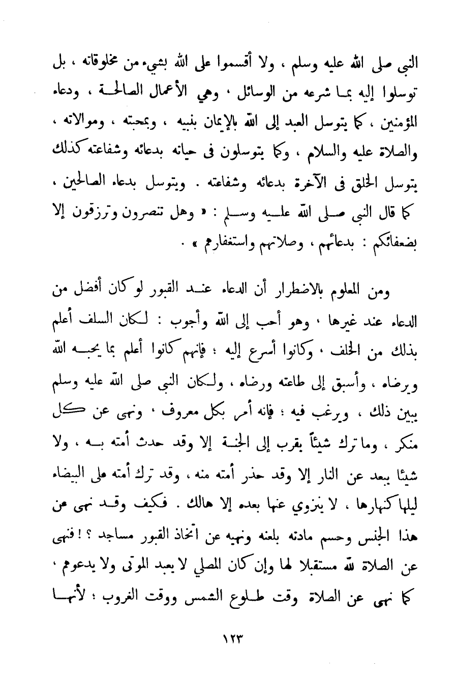 النَّبِيِّ صَلَّى اللَّهُ عَلَيْهِ وَسَلَّمَ وَلَا أَقْسَمُوا عَلَى اللَّهِ بِشَيْءِ مِنْ مَخْلُوقَاتِهِ بَلْ تَوَسَّلُوا إلَيْهِ بِمَا شَرَعَهُ مِنْ الْوَسَائِلِ وَهِيَ الْأَعْمَالُ الصَّالِحَةُ وَدُعَاءُ الْمُؤْمِنِينَ كَمَا يَتَوَسَّلُ الْعَبْدُ إلَى اللَّهِ بِالْإِيمَانِ بِنَبِيِّهِ وَبِمَحَبَّتِهِ وَمُوَالَاتِهِ وَالصَّلَاةِ عَلَيْهِ وَالسَّلَامِ وَكَمَا يَتَوَسَّلُونَ فِي حَيَاتِهِ بِدُعَائِهِ وَشَفَاعَتِهِ كَذَلِكَ يَتَوَسَّلُ الْخَلْقُ فِي الْآخِرَةِ بِدُعَائِهِ وَشَفَاعَتِهِ. وَيَتَوَسَّلُ بِدُعَاءِ الصَّالِحِينَ كَمَا قَالَ النَّبِيُّ صَلَّى اللَّهُ عَلَيْهِ وَسَلَّمَ " {وَهَلْ تُنْصَرُونَ وَتُرْزَقُونَ إلَّا بِضُعَفَائِكُمْ: بِدُعَائِهِمْ وَصَلَاتِهِمْ وَاسْتِغْفَارِهِمْ} . وَمِنْ الْمَعْلُومِ بِالِاضْطِرَارِ أَنَّ الدُّعَاءَ عِنْدَ الْقُبُورِ لَوْ كَانَ أَفْضَلَ مِنْ الدُّعَاءِ عِنْدَ غَيْرِهَا وَهُوَ أَحَبُّ إلَى اللَّهِ وأجوب: لَكَانَ السَّلَفُ أَعْلَمَ بِذَلِكَ مِنْ الْخَلَفِ " وَكَانُوا أَسْرَعَ إلَيْهِ. فَإِنَّهُمْ كَانُوا أَعْلَمَ بِمَا يُحِبُّهُ اللَّهُ وَيَرْضَاهُ وَأَسْبَقَ إلَى طَاعَتِهِ وَرِضَاهُ وَلَكَانَ النَّبِيُّ صَلَّى اللَّهُ عَلَيْهِ وَسَلَّمَ يُبَيِّنُ ذَلِكَ وَيُرَغِّبُ فِيهِ؛ فَإِنَّهُ أَمَرَ بِكُلِّ مَعْرُوفٍ وَنَهَى عَنْ كُلِّ مُنْكَرٍ وَمَا تَرَكَ شَيْئًا يُقَرِّبُ إلَى الْجَنَّةِ إلَّا وَقَدْ حَدَّثَ أُمَّتَهُ بِهِ وَلَا شَيْئًا يُبْعِدُ عَنْ النَّارِ إلَّا وَقَدْ حَذَّرَ أُمَّتَهُ مِنْهُ وَقَدْ تَرَكَ أُمَّتَهُ عَلَى الْبَيْضَاءِ لَيْلُهَا كَنَهَارِهَا لَا يَنْزَوِي عَنْهَا بَعْدَهُ إلَّا هَالِكٌ. فَكَيْفَ وَقَدْ نَهَى عَنْ هَذَا الْجِنْسِ وَحَسَمَ مَادَّتَهُ بِلَعْنِهِ وَنَهْيِهِ عَنْ اتِّخَاذِ الْقُبُورِ مَسَاجِدَ؟ فَنَهَى عَنْ الصَّلَاةِ لِلَّهِ مُسْتَقْبِلًا لَهَا وَإِنْ كَانَ الْمُصَلِّي لَا يَعْبُدُ الْمَوْتَى وَلَا يَدْعُوهُمْ كَمَا نُهِيَ عَنْ الصَّلَاةِ وَقْتَ طُلُوعِ الشَّمْسِ وَوَقْتَ الْغُرُوبِ؛ لِأَنَّهَا