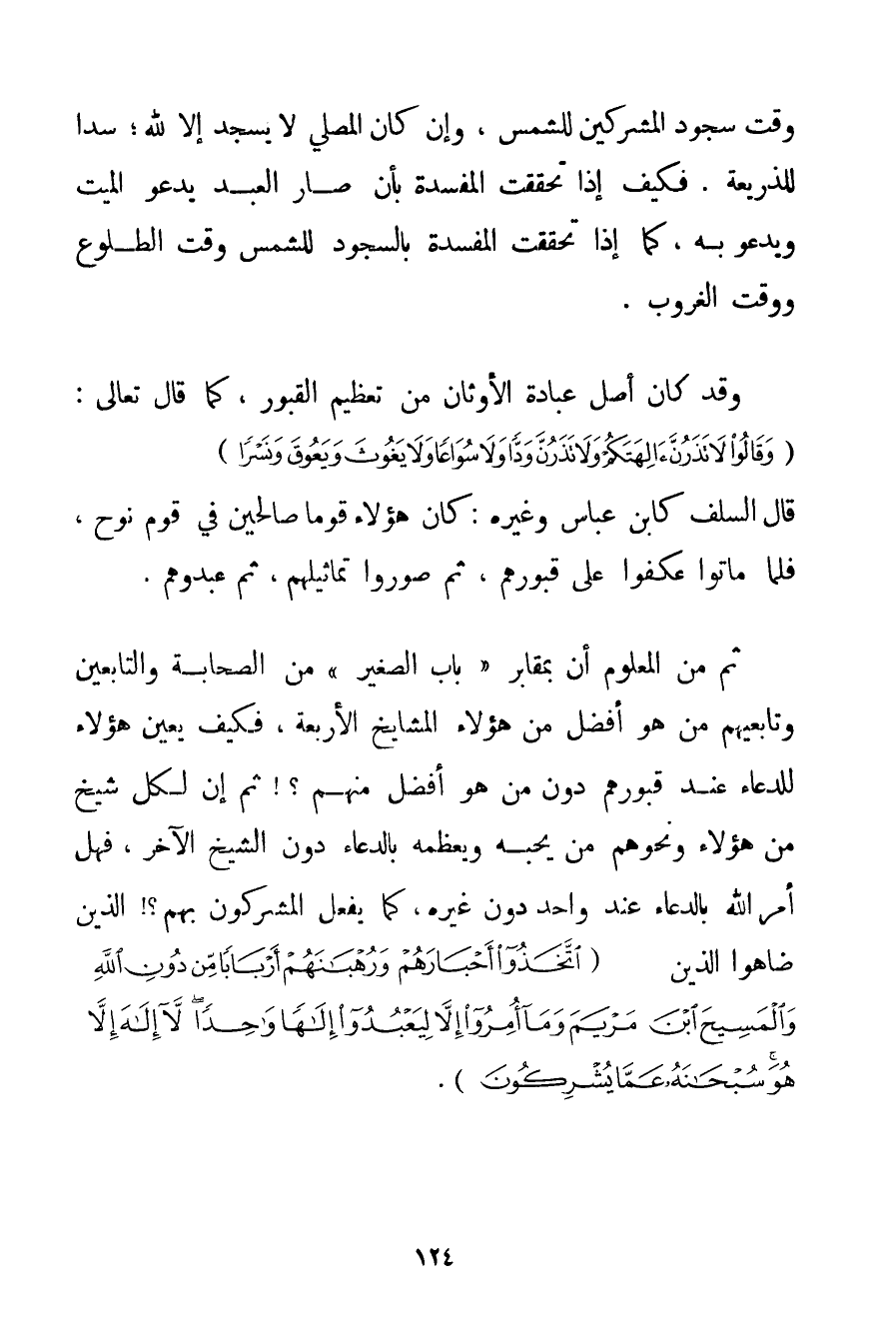 وَقْتُ سُجُودِ الْمُشْرِكِينَ لِلشَّمْسِ وَإِنْ كَانَ الْمُصَلِّي لَا يَسْجُدُ إلَّا لِلَّهِ؛ سَدًّا لِلذَّرِيعَةِ. فَكَيْفَ إذَا تَحَقَّقَتْ الْمَفْسَدَةُ بِأَنْ صَارَ الْعَبْدُ يَدْعُو الْمَيِّتَ وَيَدْعُو بِهِ كَمَا إذَا تَحَقَّقَتْ الْمَفْسَدَةُ بِالسُّجُودِ لِلشَّمْسِ وَقْتَ الطُّلُوعِ وَوَقْتَ الْغُرُوبِ. وَقَدْ كَانَ أَصْلُ عِبَادَةِ الْأَوْثَانِ مِنْ تَعْظِيمِ الْقُبُورِ كَمَا قَالَ تَعَالَى: {وَقَالُوا لَا تَذَرُنَّ آلِهَتَكُمْ وَلَا تَذَرُنَّ وَدًّا وَلَا سُوَاعًا وَلَا يَغُوثَ وَيَعُوقَ وَنَسْرًا} قَالَ السَّلَفُ كَابْنِ عَبَّاسٍ وَغَيْرِهِ: كَانَ هَؤُلَاءِ قَوْمًا صَالِحِينَ فِي قَوْمِ نُوحٍ فَلَمَّا مَاتُوا عَكَفُوا عَلَى قُبُورِهِمْ ثُمَّ صَوَّرُوا تَمَاثِيلَهُمْ ثُمَّ عَبَدُوهُمْ. ثُمَّ مِنْ الْمَعْلُومِ أَنَّ بِمَقَابِرَ " بَابِ الصَّغِيرِ " مِنْ الصَّحَابَةِ وَالتَّابِعِينَ وَتَابِعِيهِمْ مَنْ هُوَ أَفْضَلُ مِنْ هَؤُلَاءِ الْمَشَايِخِ الْأَرْبَعَةِ فَكَيْفَ يُعَيَّنُ هَؤُلَاءِ لِلدُّعَاءِ عِنْدَ قُبُورِهِمْ دُونَ مَنْ هُوَ أَفْضَلُ مِنْهُمْ ثُمَّ إنَّ لِكُلِّ شَيْخٍ مِنْ هَؤُلَاءِ وَنَحْوِهِمْ مَنْ يُحِبُّهُ وَيُعَظِّمُهُ بِالدُّعَاءِ دُونَ الشَّيْخِ الْآخَرِ فَهَلْ أَمَرَ اللَّهُ بِالدُّعَاءِ عِنْدَ وَاحِدٍ دُونَ غَيْرِهِ كَمَا يَفْعَلُ الْمُشْرِكُونَ بِهِمْ؟ الَّذِينَ ضَاهَوْا الَّذِينَ {اتَّخَذُوا أَحْبَارَهُمْ وَرُهْبَانَهُمْ أَرْبَابًا مِنْ دُونِ اللَّهِ وَالْمَسِيحَ ابْنَ مَرْيَمَ وَمَا أُمِرُوا إلَّا لِيَعْبُدُوا إلَهًا وَاحِدًا لَا إلَهَ إلَّا هُوَ سُبْحَانَهُ عَمَّا يُشْرِكُونَ} .