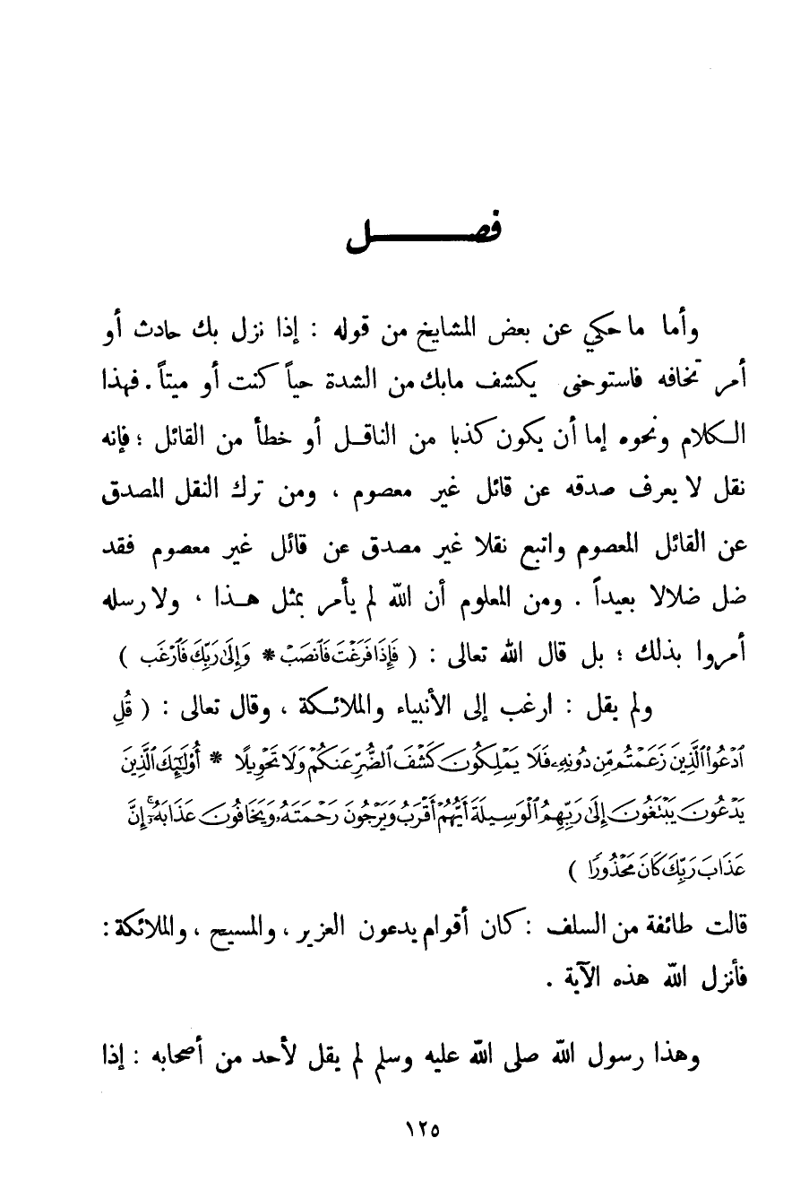وَأَمَّا مَا حُكِيَ عَنْ بَعْضِ الْمَشَايِخِ مِنْ قَوْلِهِ: إذَا نَزَلَ بِك حَادِثٌ أَوْ أَمْرٌ تَخَافُهُ فَاسْتَوْحِنِي فَيُكْشَفُ مَا بِك مِنْ الشِّدَّةِ حَيًّا كُنْت أَوْ مَيِّتًا. فَهَذَا الْكَلَامُ وَنَحْوُهُ إمَّا أَنْ يَكُونَ كَذِبًا مِنْ النَّاقِلِ أَوْ خَطَأً مِنْ الْقَائِلِ؛ فَإِنَّهُ نَقْلٌ لَا يُعْرَفُ صِدْقُهُ عَنْ قَائِلٍ غَيْرِ مَعْصُومٍ وَمَنْ تَرَكَ النَّقْلَ الْمُصَدَّقَ عَنْ الْقَائِلِ الْمَعْصُومِ وَاتَّبَعَ نَقْلًا غَيْرَ مُصَدَّقٍ عَنْ قَائِلٍ غَيْرِ مَعْصُومٍ فَقَدْ ضَلَّ ضَلَالًا بَعِيدًا. وَمِنْ الْمَعْلُومِ أَنَّ اللَّهَ لَمْ يَأْمُرْ بِمِثْلِ هَذَا " وَلَا رُسُلُهُ أَمَرُوا بِذَلِكَ؛ بَلْ قَالَ اللَّهُ تَعَالَى: {فَإِذَا فَرَغْتَ فَانْصَبْ} {وَإِلَى رَبِّكَ فَارْغَبْ} وَلَمْ يَقُلْ: ارْغَبْ إلَى الْأَنْبِيَاءِ وَالْمَلَائِكَةِ وَقَالَ تَعَالَى: {قُلِ ادْعُوا الَّذِينَ زَعَمْتُمْ مِنْ دُونِهِ فَلَا يَمْلِكُونَ كَشْفَ الضُّرِّ عَنْكُمْ وَلَا تَحْوِيلًا} {أُولَئِكَ الَّذِينَ يَدْعُونَ يَبْتَغُونَ إلَى رَبِّهِمُ الْوَسِيلَةَ أَيُّهُمْ أَقْرَبُ وَيَرْجُونَ رَحْمَتَهُ وَيَخَافُونَ عَذَابَهُ إنَّ عَذَابَ رَبِّكَ كَانَ مَحْذُورًا} قَالَتْ طَائِفَةٌ مِنْ السَّلَفِ: كَانَ أَقْوَامٌ يَدْعُونَ الْعُزَيْرَ وَالْمَسِيحَ وَالْمَلَائِكَةَ: فَأَنْزَلَ اللَّهُ هَذِهِ الْآيَةَ. وَهَذَا رَسُولُ اللَّهِ صَلَّى اللَّهُ عَلَيْهِ وَسَلَّمَ لَمْ يَقُلْ لِأَحَدِ مِنْ أَصْحَابِهِ: إذَا