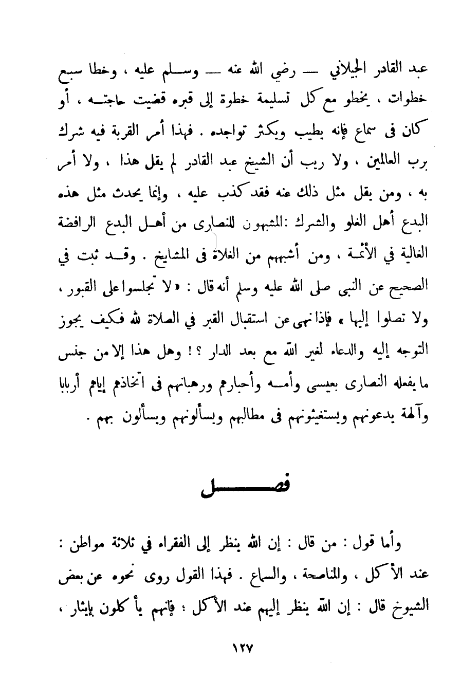 عَبْدِ الْقَادِرِ الجيلاني - رَضِيَ اللَّهُ عَنْهُ - وَسَلَّمَ عَلَيْهِ وَخَطَا سَبْعَ خُطُوَاتٍ يَخْطُو مَعَ كُلِّ تَسْلِيمَةٍ خَطْوَةً إلَى قَبْرِهِ قُضِيَتْ حَاجَتُهُ أَوْ كَانَ فِي سَمَاعٍ فَإِنَّهُ يَطِيبُ وَيَكْثُرُ تَوَاجُدُهُ. فَهَذَا أَمْرٌ الْقُرْبَةُ فِيهِ شِرْكٌ بِرَبِّ الْعَالَمِينَ وَلَا رَيْبَ أَنَّ الشَّيْخَ عَبْدَ الْقَادِرِ لَمْ يَقُلْ هَذَا وَلَا أَمَرَ بِهِ وَمَنْ يَقُلْ مِثْلَ ذَلِكَ عَنْهُ فَقَدْ كَذَبَ عَلَيْهِ وَإِنَّمَا يُحْدِثُ مِثْلَ هَذِهِ الْبِدَعِ أَهْلُ الْغُلُوِّ وَالشِّرْكِ: الْمُشْبِهُونَ لِلنَّصَارَى مِنْ أَهْلِ الْبِدَعِ الرَّافِضَةِ الْغَالِيَةِ فِي الْأَئِمَّةِ وَمَنْ أَشْبَهَهُمْ مِنْ الْغُلَاةِ فِي الْمَشَايِخِ. وَقَدْ ثَبَتَ فِي الصَّحِيحِ عَنْ النَّبِيِّ صَلَّى اللَّهُ عَلَيْهِ وَسَلَّمَ أَنَّهُ قَالَ: " {لَا تَجْلِسُوا عَلَى الْقُبُورِ وَلَا تُصَلُّوا إلَيْهَا} فَإِذَا نَهَى عَنْ اسْتِقْبَالِ الْقَبْرِ فِي الصَّلَاةِ لِلَّهِ فَكَيْفَ يَجُوزُ التَّوَجُّهُ إلَيْهِ وَالدُّعَاءُ لِغَيْرِ اللَّهِ مَعَ بُعْدِ الدَّارِ وَهَلْ هَذَا إلَّا مِنْ جِنْسِ مَا يَفْعَلُهُ النَّصَارَى بِعِيسَى وَأُمِّهِ وَأَحْبَارِهِمْ وَرُهْبَانِهِمْ فِي اتِّخَاذِهِمْ إيَّاهُمْ أَرْبَابًا وَآلِهَةً يَدْعُونَهُمْ وَيَسْتَغِيثُونَهُم فِي مَطَالِبِهِمْ وَيَسْأَلُونَهُمْ وَيَسْأَلُونَ بِهِمْ.