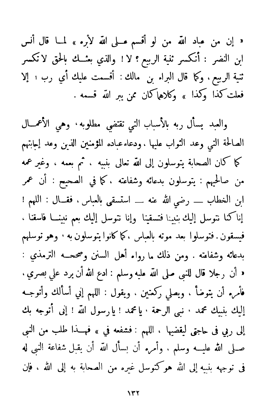 {إنَّ مِنْ عِبَادِ اللَّهِ مَنْ لَوْ أَقْسَمَ عَلَى اللَّهِ لَأَبَرَّهُ لَمَّا قَالَ أَنَسُ بْنُ النَّضْرِ: أَتُكْسَرُ ثَنِيَّةُ الربيع؟ لَا وَاَلَّذِي بَعَثَك بِالْحَقِّ لَا تُكْسَرُ ثَنِيَّةُ الربيع} وَكَمَا قَالَ الْبَرَاءُ بْنُ مَالِكٍ: أَقْسَمْت عَلَيْك أَيْ رَبِّ؛ إلَّا فَعَلْت كَذَا وَكَذَا " وَكِلَاهُمَا كَانَ مِمَّنْ يَبَرُّ اللَّهُ قَسَمَهُ. وَالْعَبْدُ يَسْأَلُ رَبَّهُ بِالْأَسْبَابِ الَّتِي تَقْتَضِي مَطْلُوبَهُ وَهِيَ الْأَعْمَالُ الصَّالِحَةُ الَّتِي وَعَدَ الثَّوَابَ عَلَيْهَا. وَدُعَاءُ عِبَادِهِ الْمُؤْمِنِينَ الَّذِينَ وَعَدَ إجَابَتَهُمْ كَمَا كَانَ الصَّحَابَةُ يَتَوَسَّلُونَ إلَى اللَّهِ تَعَالَى بِنَبِيِّهِ ثُمَّ بِعَمِّهِ وَغَيْرِ عَمِّهِ مِنْ صَالِحِيهِمْ: يَتَوَسَّلُونَ بِدُعَائِهِ وَشَفَاعَتِهِ كَمَا فِي الصَّحِيحِ: أَنَّ عُمَرَ بْنَ الْخَطَّابِ - رَضِيَ اللَّهُ عَنْهُ - اسْتَسْقَى بِالْعَبَّاسِ فَقَالَ: اللَّهُمَّ إنَّا كُنَّا نَتَوَسَّلُ إلَيْك بِنَبِيِّنَا فَتَسْقِيَنَا وَإِنَّا نَتَوَسَّلُ إلَيْك بِعَمِّ نَبِيِّنَا فَاسْقِنَا فَيُسْقَوْنَ. فَتَوَسَّلُوا بَعْدَ مَوْتِهِ بِالْعَبَّاسِ كَمَا كَانُوا يَتَوَسَّلُونَ بِهِ وَهُوَ تَوَسُّلُهُمْ بِدُعَائِهِ وَشَفَاعَتِهِ. وَمِنْ ذَلِكَ مَا رَوَاهُ أَهْلُ السُّنَنِ وَصَحَّحَهُ التِّرْمِذِيُّ: " {أَنَّ رَجُلًا قَالَ لِلنَّبِيِّ صَلَّى اللَّهُ عَلَيْهِ وَسَلَّمَ اُدْعُ اللَّهَ أَنْ يَرُدَّ عَلَيَّ بَصَرِي فَأَمَرَهُ أَنْ يَتَوَضَّأَ وَيُصَلِّيَ رَكْعَتَيْنِ وَيَقُولَ: اللَّهُمَّ إنِّي أَسْأَلُك وَأَتَوَجَّهُ إلَيْك بِنَبِيِّك مُحَمَّدٍ نَبِيِّ الرَّحْمَةِ يَا مُحَمَّدُ يَا رَسُولَ اللَّهِ إنِّي أَتَوَجَّهُ بِك إلَى رَبِّي فِي حَاجَتِي لِيَقْضِيَهَا اللَّهُمَّ: فَشَفِّعْهُ فِيَّ} فَهَذَا طَلَبَ مِنْ النَّبِيِّ صَلَّى اللَّهُ عَلَيْهِ وَسَلَّمَ وَأَمَرَهُ أَنْ يَسْأَلَ اللَّهَ أَنْ يَقْبَلَ شَفَاعَةَ النَّبِيِّ لَهُ فِي تَوَجُّهِهِ بِنَبِيِّهِ إلَى اللَّهِ هُوَ كَتَوَسُّلِ غَيْرِهِ مِنْ الصَّحَابَةِ بِهِ إلَى اللَّهِ فَإِنَّ
