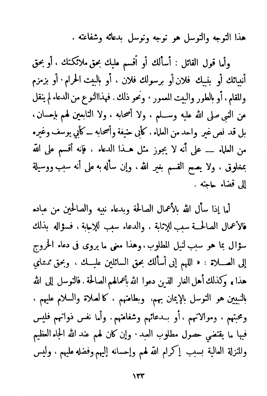 هَذَا التَّوَجُّهَ وَالتَّوَسُّلَ هُوَ تَوَجُّهٌ وَتَوَسُّلٌ بِدُعَائِهِ وَشَفَاعَتِهِ. وَأَمَّا قَوْلُ الْقَائِلِ: أَسْأَلُك أَوْ أُقْسِمُ عَلَيْك بِحَقِّ مَلَائِكَتِك أَوْ بِحَقِّ أَنْبِيَائِك أَوْ بِنَبِيِّك فُلَانٍ أَوْ بِرَسُولِك فُلَانٍ أَوْ بِالْبَيْتِ الْحَرَامِ أَوْ بِزَمْزَمَ وَالْمَقَامِ أَوْ بِالطُّورِ وَالْبَيْتِ الْمَعْمُورِ وَنَحْوِ ذَلِكَ. فَهَذَا النَّوْعُ مِنْ الدُّعَاءِ لَمْ يُنْقَلْ عَنْ النَّبِيِّ صَلَّى اللَّهُ عَلَيْهِ وَسَلَّمَ وَلَا أَصْحَابِهِ وَلَا التَّابِعِينَ لَهُمْ بِإِحْسَانِ بَلْ قَدْ نَصَّ غَيْرُ وَاحِدٍ مِنْ الْعُلَمَاءِ كَأَبِي حَنِيفَةَ وَأَصْحَابِهِ - كَأَبِي يُوسُفَ وَغَيْرِهِ مِنْ الْعُلَمَاءِ - عَلَى أَنَّهُ لَا يَجُوزُ مِثْلُ هَذَا الدُّعَاءِ فَإِنَّهُ أَقْسَمَ عَلَى اللَّهِ بِمَخْلُوقِ وَلَا يَصِحُّ الْقَسَمُ بِغَيْرِ اللَّهِ وَإِنْ سَأَلَهُ بِهِ عَلَى أَنَّهُ سَبَبٌ وَوَسِيلَةٌ إلَى قَضَاءِ حَاجَتِهِ. أَمَّا إذَا سَأَلَ اللَّهَ بِالْأَعْمَالِ الصَّالِحَةِ وَبِدُعَاءِ نَبِيِّهِ وَالصَّالِحِينَ مِنْ عِبَادِهِ فَالْأَعْمَالُ الصَّالِحَةُ سَبَبٌ لِلْإِثَابَةِ وَالدُّعَاءُ سَبَبٌ لِلْإِجَابَةِ فَسُؤَالُهُ بِذَلِكَ سُؤَالٌ بِمَا هُوَ سَبَبٌ لِنَيْلِ الْمَطْلُوبِ وَهَذَا مَعْنَى مَا يُرْوَى فِي دُعَاءِ الْخُرُوجِ إلَى الصَّلَاةِ: " {اللَّهُمَّ إنِّي أَسْأَلُك بِحَقِّ السَّائِلِينَ عَلَيْك وَبِحَقِّ مَمْشَايَ هَذَا} وَكَذَلِكَ أَهْلُ الْغَارِ الَّذِينَ دَعَوْا اللَّهَ بِأَعْمَالِهِمْ الصَّالِحَةِ. فَالتَّوَسُّلُ إلَى اللَّهِ بِالنَّبِيِّينَ هُوَ التَّوَسُّلُ بِالْإِيمَانِ بِهِمْ وَبِطَاعَتِهِمْ كَالصَّلَاةِ وَالسَّلَامِ عَلَيْهِمْ وَمَحَبَّتِهِمْ وَمُوَالَاتِهِمْ أَوْ بِدُعَائِهِمْ وَشَفَاعَتِهِمْ. وَأَمَّا نَفْسُ ذَوَاتِهِمْ فَلَيْسَ فِيهَا مَا يَقْتَضِي حُصُولَ مَطْلُوبِ الْعَبْدِ وَإِنْ كَانَ لَهُمْ عِنْدَ اللَّهِ الْجَاهُ الْعَظِيمُ وَالْمَنْزِلَةُ الْعَالِيَةُ بِسَبَبِ إكْرَامِ اللَّهِ لَهُمْ وَإِحْسَانِهِ إلَيْهِمْ وَفَضْلِهِ عَلَيْهِمْ وَلَيْسَ