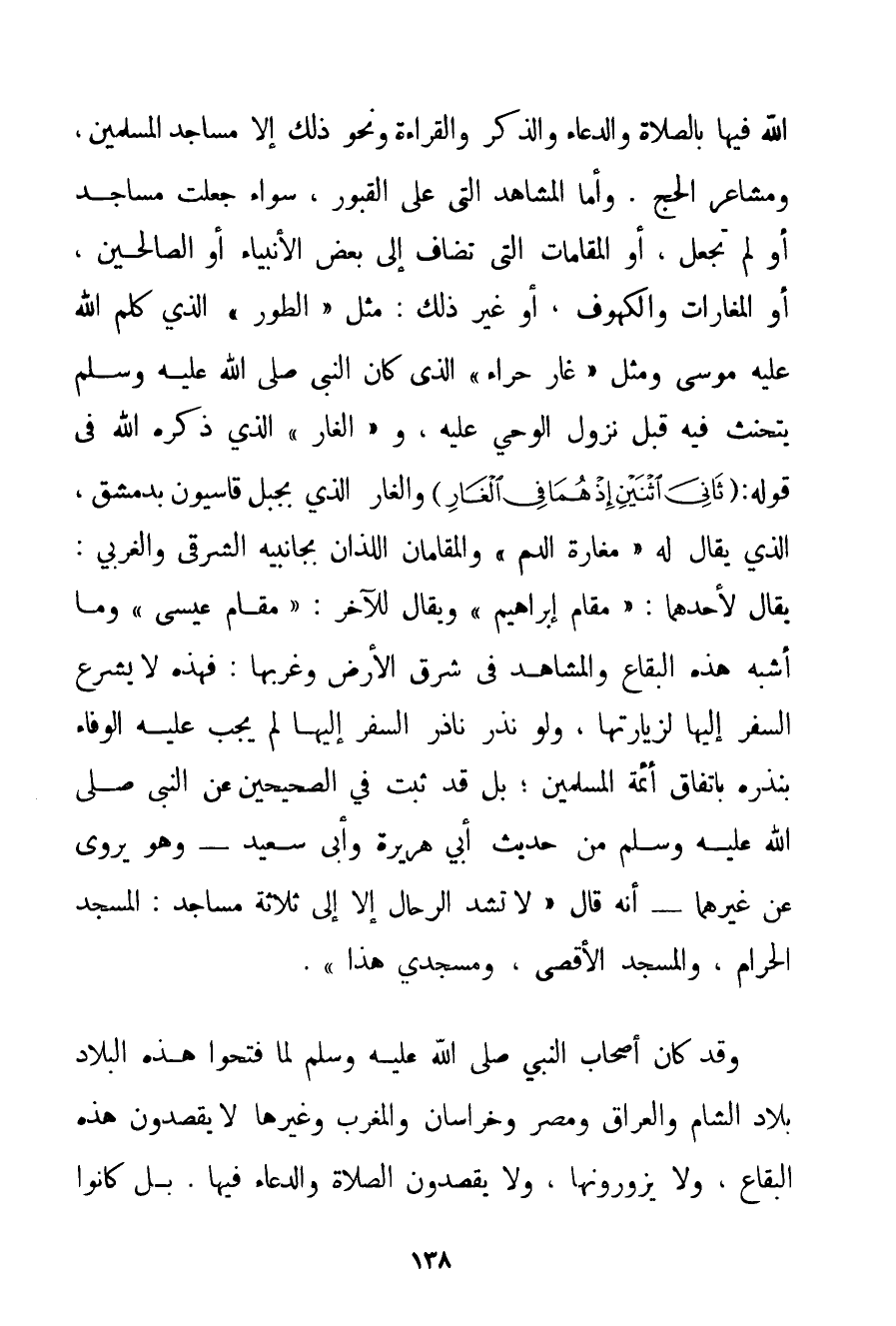اللَّهِ فِيهَا بِالصَّلَاةِ وَالدُّعَاءِ وَالذِّكْرِ وَالْقِرَاءَةِ وَنَحْوِ ذَلِكَ إلَّا مَسَاجِدُ الْمُسْلِمِينَ وَمَشَاعِرُ الْحَجِّ. وَأَمَّا الْمَشَاهِدُ الَّتِي عَلَى الْقُبُورِ سَوَاءٌ جُعِلَتْ مَسَاجِدَ أَوْ لَمْ تُجْعَلْ أَوْ الْمَقَامَاتُ الَّتِي تُضَافُ إلَى بَعْضِ الْأَنْبِيَاءِ أَوْ الصَّالِحِينَ أَوْ الْمَغَارَاتُ وَالْكُهُوفُ أَوْ غَيْرُ ذَلِكَ: مِثْلُ " الطُّورِ " الَّذِي كَلَّمَ اللَّهُ عَلَيْهِ مُوسَى وَمِثْلُ " غَارِ حِرَاءَ " الَّذِي كَانَ النَّبِيُّ صَلَّى اللَّهُ عَلَيْهِ وَسَلَّمَ يَتَحَنَّثُ فِيهِ قَبْلَ نُزُولِ الْوَحْيِ عَلَيْهِ و " الْغَارِ " الَّذِي ذَكَرَهُ اللَّهُ فِي قَوْلِهِ: {ثَانِيَ اثْنَيْنِ إذْ هُمَا فِي الْغَارِ} وَالْغَارِ الَّذِي بِجَبَلِ قاسيون بِدِمَشْقَ الَّذِي يُقَالُ لَهُ " مَغَارَةُ الدَّمِ " وَالْمَقَامَانِ اللَّذَانِ بِجَانِبَيْهِ الشَّرْقِيِّ وَالْغَرْبِيِّ: يُقَالُ لِأَحَدِهِمَا: " مَقَامُ إبْرَاهِيمَ " وَيُقَالُ لِلْآخَرِ: " مَقَامُ عِيسَى " وَمَا أَشْبَهَ هَذِهِ الْبِقَاعَ وَالْمَشَاهِدَ فِي شَرْقِ الْأَرْضِ وَغَرْبِهَا: فَهَذِهِ لَا يُشْرَعُ السَّفَرُ إلَيْهَا لِزِيَارَتِهَا وَلَوْ نَذَرَ نَاذِرٌ السَّفَرَ إلَيْهَا لَمْ يَجِبْ عَلَيْهِ الْوَفَاءُ بِنَذْرِهِ بِاتِّفَاقِ أَئِمَّةِ الْمُسْلِمِينَ؛ بَلْ قَدْ ثَبَتَ فِي الصَّحِيحَيْنِ عَنْ النَّبِيِّ صَلَّى اللَّهُ عَلَيْهِ وَسَلَّمَ مِنْ حَدِيثِ أَبِي هُرَيْرَةَ وَأَبِي سَعِيدٍ - وَهُوَ يُرْوَى عَنْ غَيْرِهِمَا - أَنَّهُ قَالَ " {لَا تُشَدُّ الرِّحَالُ إلَّا إلَى ثَلَاثَةِ مَسَاجِدَ: الْمَسْجِدِ الْحَرَامِ وَالْمَسْجِدِ الْأَقْصَى وَمَسْجِدِي هَذَا} . وَقَدْ كَانَ أَصْحَابُ النَّبِيِّ صَلَّى اللَّهُ عَلَيْهِ وَسَلَّمَ لَمَّا فَتَحُوا هَذِهِ الْبِلَادَ بِلَادَ الشَّامِ وَالْعِرَاقِ وَمِصْرَ وَخُرَاسَانَ وَالْمَغْرِبِ وَغَيْرِهَا لَا يَقْصِدُونَ هَذِهِ الْبِقَاعَ وَلَا يَزُورُونَهَا وَلَا يَقْصِدُونَ الصَّلَاةَ وَالدُّعَاءَ فِيهَا. بَلْ كَانُوا