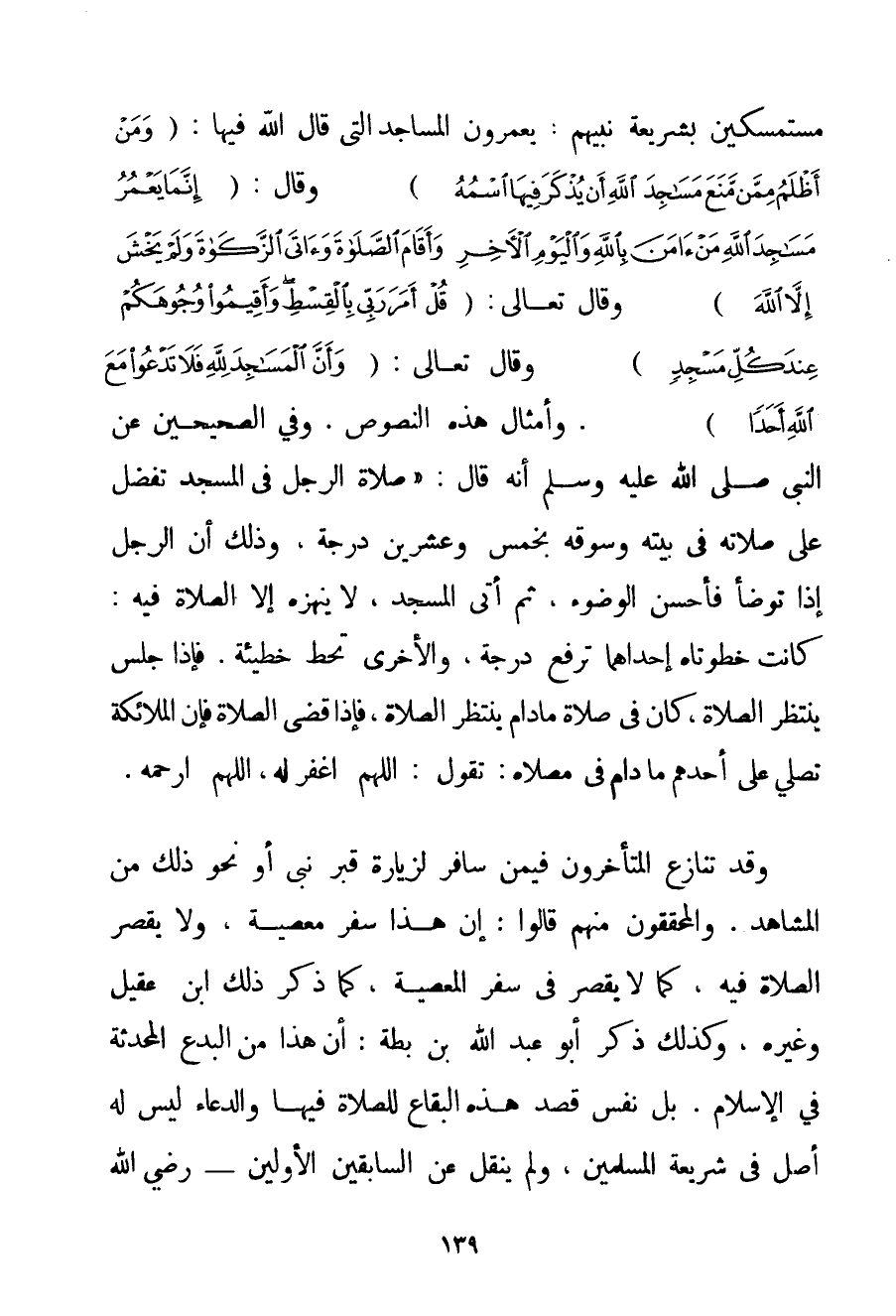 مُسْتَمْسِكِينَ بِشَرِيعَةِ نَبِيِّهِمْ: يَعْمُرُونَ الْمَسَاجِدَ الَّتِي قَالَ اللَّهُ فِيهَا: {وَمَنْ أَظْلَمُ مِمَّنْ مَنَعَ مَسَاجِدَ اللَّهِ أَنْ يُذْكَرَ فِيهَا اسْمُهُ} وَقَالَ: {إنَّمَا يَعْمُرُ مَسَاجِدَ اللَّهِ مَنْ آمَنَ بِاللَّهِ وَالْيَوْمِ الْآخِرِ وَأَقَامَ الصَّلَاةَ وَآتَى الزَّكَاةَ وَلَمْ يَخْشَ إلَّا اللَّهَ} وَقَالَ تَعَالَى: {قُلْ أَمَرَ رَبِّي بِالْقِسْطِ وَأَقِيمُوا وُجُوهَكُمْ عِنْدَ كُلِّ مَسْجِدٍ} وَقَالَ تَعَالَى: {وَأَنَّ الْمَسَاجِدَ لِلَّهِ فَلَا تَدْعُوا مَعَ اللَّهِ أَحَدًا} . وَأَمْثَالَ هَذِهِ النُّصُوصِ. وَفِي الصَّحِيحَيْنِ عَنْ النَّبِيِّ صَلَّى اللَّهُ عَلَيْهِ وَسَلَّمَ أَنَّهُ قَالَ: " {صَلَاةُ الرَّجُلِ فِي الْمَسْجِدِ تَفْضُلُ عَلَى صَلَاتِهِ فِي بَيْتِهِ وَسُوقِهِ بِخَمْسِ وَعِشْرِينَ دَرَجَةً وَذَلِكَ أَنَّ الرَّجُلَ إذَا تَوَضَّأَ فَأَحْسَنَ الْوُضُوءَ ثُمَّ أَتَى الْمَسْجِدَ لَا يُنْهِزُهُ إلَّا الصَّلَاةُ فِيهِ: كَانَتْ خُطْوَتَاهُ إحْدَاهُمَا تَرْفَعُ دَرَجَةً وَالْأُخْرَى تَحُطُّ خَطِيئَةً. فَإِذَا جَلَسَ يَنْتَظِرُ الصَّلَاةَ كَانَ فِي صَلَاةٍ مَا دَامَ يَنْتَظِرُ الصَّلَاةَ فَإِذَا قَضَى الصَّلَاةَ فَإِنَّ الْمَلَائِكَةَ تُصَلِّي عَلَى أَحَدِهِمْ مَا دَامَ فِي مُصَلَّاهُ: تَقُولُ: اللَّهُمَّ اغْفِرْ لَهُ اللَّهُمَّ ارْحَمْهُ} . وَقَدْ تَنَازَعَ الْمُتَأَخِّرُونَ فِيمَنْ سَافَرَ لِزِيَارَةِ قَبْرِ نَبِيٍّ أَوْ نَحْوِ ذَلِكَ مِنْ الْمَشَاهِدِ. وَالْمُحَقِّقُونَ مِنْهُمْ قَالُوا: إنَّ هَذَا سَفَرُ مَعْصِيَةٍ وَلَا يَقْصُرُ الصَّلَاةَ فِيهِ كَمَا لَا يَقْصُرُ فِي سَفَرِ الْمَعْصِيَةِ كَمَا ذَكَرَ ذَلِكَ ابْنُ عَقِيلٍ وَغَيْرُهُ وَكَذَلِكَ ذَكَرَ أَبُو عَبْدِ اللَّهِ بْنُ بَطَّةَ: أَنَّ هَذَا مِنْ الْبِدَعِ الْمُحْدَثَةِ فِي الْإِسْلَامِ. بَلْ نَفْسُ قَصْدِ هَذِهِ الْبِقَاعِ لِلصَّلَاةِ فِيهَا وَالدُّعَاءِ لَيْسَ لَهُ أَصْلٌ فِي شَرِيعَةِ الْمُسْلِمِينَ وَلَمْ يُنْقَلْ عَنْ السَّابِقِينَ الْأَوَّلِينَ - رَضِيَ اللَّهُ