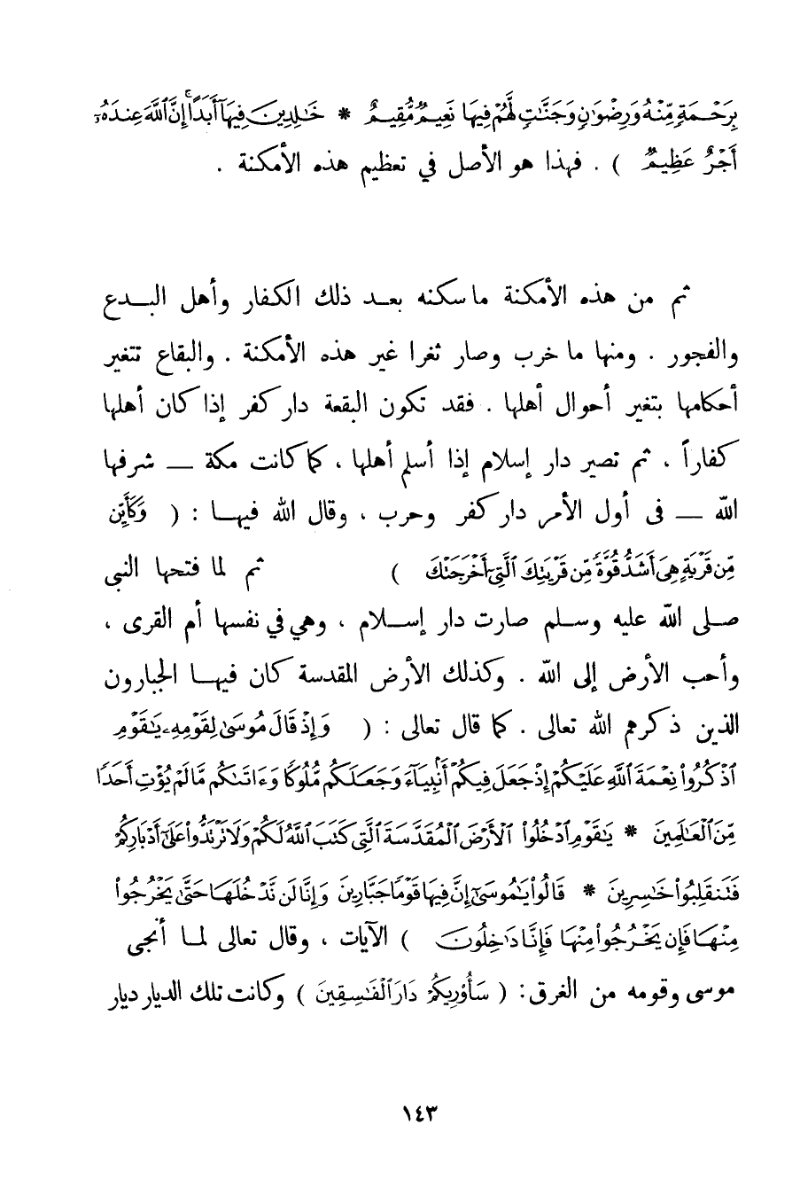 وَأَنْفُسِهِمْ أَعْظَمُ دَرَجَةً عِنْدَ اللَّهِ وَأُولَئِكَ هُمُ الْفَائِزُونَ} {يُبَشِّرُهُمْ رَبُّهُمْ بِرَحْمَةٍ مِنْهُ وَرِضْوَانٍ وَجَنَّاتٍ لَهُمْ فِيهَا نَعِيمٌ مُقِيمٌ} {خَالِدِينَ فِيهَا أَبَدًا إنَّ اللَّهَ عِنْدَهُ أَجْرٌ عَظِيمٌ} . فَهَذَا هُوَ الْأَصْلُ فِي تَعْظِيمِ هَذِهِ الْأَمْكِنَةِ. ثُمَّ مِنْ هَذِهِ الْأَمْكِنَةِ مَا سَكَنَهُ بَعْدَ ذَلِكَ الْكُفَّارُ وَأَهْلُ الْبِدَعِ وَالْفُجُورِ. وَمِنْهَا مَا خَرَبَ وَصَارَ ثَغْرًا غَيْرَ هَذِهِ الْأَمْكِنَةِ. وَالْبِقَاعُ تَتَغَيَّرُ أَحْكَامُهَا بِتَغَيُّرِ أَحْوَالِ أَهْلِهَا. فَقَدْ تَكُونُ الْبُقْعَةُ دَارَ كُفْرٍ إذَا كَانَ أَهْلُهَا كُفَّارًا ثُمَّ تَصِيرُ دَارَ إسْلَامٍ إذَا أَسْلَمَ أَهْلُهَا كَمَا كَانَتْ مَكَّةُ - شَرَّفَهَا اللَّهُ - فِي أَوَّلِ الْأَمْرِ دَارَ كُفْرٍ وَحَرْبٍ وَقَالَ اللَّهُ فِيهَا: {وَكَأَيِّنْ مِنْ قَرْيَةٍ هِيَ أَشَدُّ قُوَّةً مِنْ قَرْيَتِكَ الَّتِي أَخْرَجَتْكَ} ثُمَّ لَمَّا فَتَحَهَا النَّبِيُّ صَلَّى اللَّهُ عَلَيْهِ وَسَلَّمَ صَارَتْ دَارَ إسْلَامٍ وَهِيَ فِي نَفْسِهَا أُمُّ الْقُرَى وَأَحَبُّ الْأَرْضِ إلَى اللَّهِ. وَكَذَلِكَ الْأَرْضُ الْمُقَدَّسَةُ كَانَ فِيهَا الْجَبَّارُونَ الَّذِينَ ذَكَرَهُمْ اللَّهُ تَعَالَى. كَمَا قَالَ تَعَالَى: {وَإِذْ قَالَ مُوسَى لِقَوْمِهِ يَا قَوْمِ اذْكُرُوا نِعْمَةَ اللَّهِ عَلَيْكُمْ إذْ جَعَلَ فِيكُمْ أَنْبِيَاءَ وَجَعَلَكُمْ مُلُوكًا وَآتَاكُمْ مَا لَمْ يُؤْتِ أَحَدًا مِنَ الْعَالَمِينَ} {يَا قَوْمِ ادْخُلُوا الْأَرْضَ الْمُقَدَّسَةَ الَّتِي كَتَبَ اللَّهُ لَكُمْ وَلَا تَرْتَدُّوا عَلَى أَدْبَارِكُمْ فَتَنْقَلِبُوا خَاسِرِينَ} {قَالُوا يَا مُوسَى إنَّ فِيهَا قَوْمًا جَبَّارِينَ وَإِنَّا لَنْ نَدْخُلَهَا حَتَّى يَخْرُجُوا مِنْهَا فَإِنْ يَخْرُجُوا مِنْهَا فَإِنَّا دَاخِلُونَ} الْآيَاتُ وَقَالَ تَعَالَى لَمَّا أَنْجَى مُوسَى وَقَوْمَهُ مِنْ الْغَرَقِ: {سَأُرِيكُمْ دَارَ الْفَاسِقِينَ} وَكَانَتْ تِلْكَ الدِّيَارُ دِيَارَ