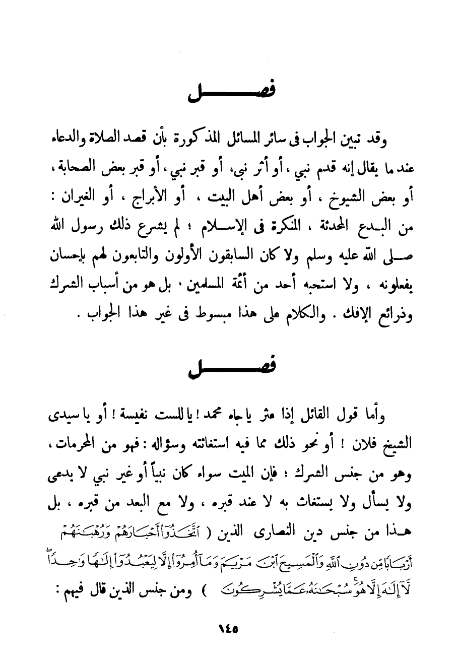 وَقَدْ تَبَيَّنَ الْجَوَابُ فِي سَائِرِ الْمَسَائِلِ الْمَذْكُورَةِ بِأَنَّ قَصْدَ الصَّلَاةِ وَالدُّعَاءِ عِنْدَمَا يُقَالُ إنَّهُ قَدَمُ نَبِيٍّ أَوْ أَثَرُ نَبِيٍّ أَوْ قَبْرُ نَبِيٍّ أَوْ قَبْرُ بَعْضِ الصَّحَابَةِ أَوْ بَعْضِ الشُّيُوخِ أَوْ بَعْضِ أَهْلِ الْبَيْتِ أَوْ الْأَبْرَاجِ أَوْ الْغِيرَان: مِنْ الْبِدَعِ الْمُحْدَثَةِ الْمُنْكَرَةِ فِي الْإِسْلَامِ لَمْ يَشْرَعْ ذَلِكَ رَسُولُ اللَّهِ صَلَّى اللَّهُ عَلَيْهِ وَسَلَّمَ وَلَا كَانَ السَّابِقُونَ الْأَوَّلُونَ وَالتَّابِعُونَ لَهُمْ بِإِحْسَانِ يَفْعَلُونَهُ وَلَا اسْتَحَبَّهُ أَحَدٌ مِنْ أَئِمَّةِ الْمُسْلِمِينَ بَلْ هُوَ مِنْ أَسْبَابِ الشِّرْكِ وَذَرَائِعِ الْإِفْكِ. وَالْكَلَامُ عَلَى هَذَا مَبْسُوطٌ فِي غَيْرِ هَذَا الْجَوَابِ.