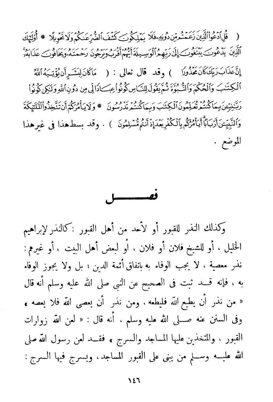 وَكَذَلِكَ النَّذْرُ لِلْقُبُورِ أَوْ لِأَحَدٍ مِنْ أَهْلِ الْقُبُورِ: كَالنَّذْرِ لِإِبْرَاهِيمَ الْخَلِيلِ أَوْ لِلشَّيْخِ فُلَانٍ أَوْ فُلَانٍ أَوْ لِبَعْضِ أَهْلِ الْبَيْتِ أَوْ غَيْرِهِمْ: نَذْرُ مَعْصِيَةٍ لَا يَجِبُ الْوَفَاءُ بِهِ بِاتِّفَاقِ أَئِمَّةِ الدِّينِ؛ بَلْ وَلَا يَجُوزُ الْوَفَاءُ بِهِ فَإِنَّهُ قَدْ ثَبَتَ فِي الصَّحِيحِ عَنْ النَّبِيِّ صَلَّى اللَّهُ عَلَيْهِ وَسَلَّمَ أَنَّهُ قَالَ {مَنْ نَذَرَ أَنْ يُطِيعَ اللَّهَ فَلْيُطِعْهُ وَمَنْ نَذَرَ أَنْ يَعْصِيَ اللَّهَ فَلَا يَعْصِهِ} وَفِي السُّنَنِ عَنْهُ صَلَّى اللَّهُ عَلَيْهِ وَسَلَّمَ أَنَّهُ قَالَ: " {لَعَنَ اللَّهُ زَوَّارَاتِ الْقُبُورِ وَالْمُتَّخِذِينَ عَلَيْهَا الْمَسَاجِدَ وَالسُّرُجَ} فَقَدْ لَعَنَ رَسُولُ اللَّهِ صَلَّى اللَّهُ عَلَيْهِ وَسَلَّمَ مَنْ يَبْنِي عَلَى الْقُبُورِ الْمَسَاجِدَ وَيُسْرِجُ فِيهَا السُّرُجَ: