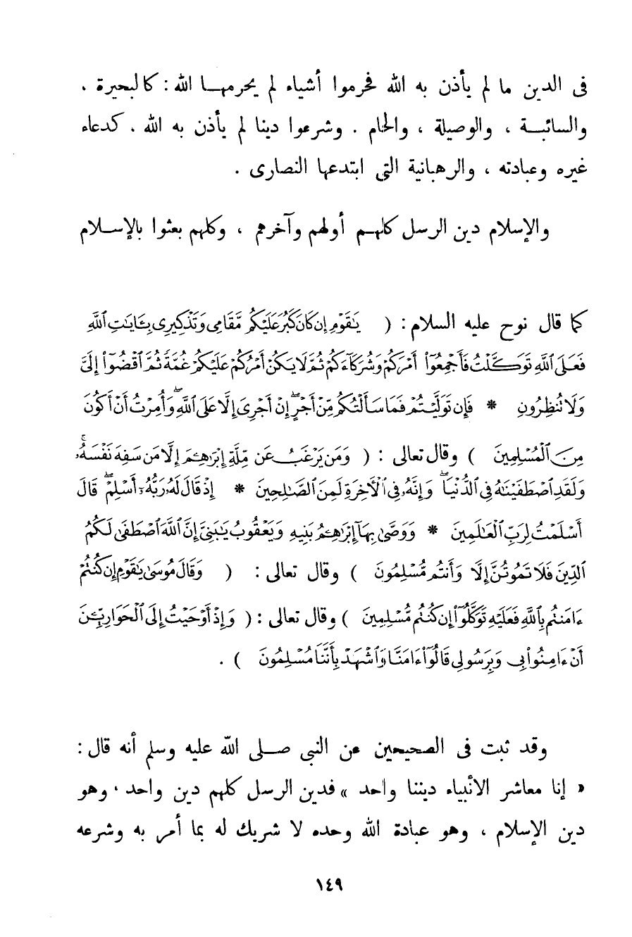 فِي الدِّينِ مَا لَمْ يَأْذَنْ بِهِ اللَّهُ فَحَرَّمُوا أَشْيَاءَ لَمْ يُحَرِّمْهَا اللَّهُ: كَالْبَحِيرَةِ وَالسَّائِبَةِ وَالْوَصِيلَةِ والحام. وَشَرَعُوا دِينًا لَمْ يَأْذَنْ بِهِ اللَّهُ كَدُعَاءِ غَيْرِهِ وَعِبَادَتِهِ والرهبانية الَّتِي ابْتَدَعَهَا النَّصَارَى. وَالْإِسْلَامُ دِينُ الرُّسُلِ كُلِّهِمْ أَوَّلِهِمْ وَآخِرِهِمْ وَكُلُّهُمْ بُعِثُوا بِالْإِسْلَامِ كَمَا قَالَ نُوحٌ عَلَيْهِ السَّلَامُ {يَا قَوْمِ إنْ كَانَ كَبُرَ عَلَيْكُمْ مَقَامِي وَتَذْكِيرِي بِآيَاتِ اللَّهِ فَعَلَى اللَّهِ تَوَكَّلْتُ فَأَجْمِعُوا أَمْرَكُمْ وَشُرَكَاءَكُمْ ثُمَّ لَا يَكُنْ أَمْرُكُمْ عَلَيْكُمْ غُمَّةً ثُمَّ اقْضُوا إلَيَّ وَلَا تُنْظِرُونِ} {فَإِنْ تَوَلَّيْتُمْ فَمَا سَأَلْتُكُمْ مِنْ أَجْرٍ إنْ أَجْرِيَ إلَّا عَلَى اللَّهِ وَأُمِرْتُ أَنْ أَكُونَ مِنَ الْمُسْلِمِينَ} وَقَالَ تَعَالَى: {وَمَنْ يَرْغَبُ عَنْ مِلَّةِ إبْرَاهِيمَ إلَّا مَنْ سَفِهَ نَفْسَهُ وَلَقَدِ اصْطَفَيْنَاهُ فِي الدُّنْيَا وَإِنَّهُ فِي الْآخِرَةِ لَمِنَ الصَّالِحِينَ} {إذْ قَالَ لَهُ رَبُّهُ أَسْلِمْ قَالَ أَسْلَمْتُ لِرَبِّ الْعَالَمِينَ} {وَوَصَّى بِهَا إبْرَاهِيمُ بَنِيهِ وَيَعْقُوبُ يَا بَنِيَّ إنَّ اللَّهَ اصْطَفَى لَكُمُ الدِّينَ فَلَا تَمُوتُنَّ إلَّا وَأَنْتُمْ مُسْلِمُونَ} وَقَالَ تَعَالَى: {وَقَالَ مُوسَى يَا قَوْمِ إنْ كُنْتُمْ آمَنْتُمْ بِاللَّهِ فَعَلَيْهِ تَوَكَّلُوا إنْ كُنْتُمْ مُسْلِمِينَ} وَقَالَ تَعَالَى: {وَإِذْ أَوْحَيْتُ إلَى الْحَوَارِيِّينَ أَنْ آمِنُوا بِي وَبِرَسُولِي قَالُوا آمَنَّا وَاشْهَدْ بِأَنَّنَا مُسْلِمُونَ} . وَقَدْ ثَبَتَ فِي الصَّحِيحَيْنِ عَنْ النَّبِيِّ صَلَّى اللَّهُ عَلَيْهِ وَسَلَّمَ أَنَّهُ قَالَ: " {إنَّا مَعَاشِرَ الْأَنْبِيَاءِ دِينُنَا وَاحِدٌ} فَدِينُ الرُّسُلِ كُلِّهِمْ دِينٌ وَاحِدٌ وَهُوَ دِينُ الْإِسْلَامِ وَهُوَ عِبَادَةُ اللَّهِ وَحْدَهُ لَا شَرِيكَ لَهُ بِمَا أَمَرَ بِهِ وَشَرَعَهُ