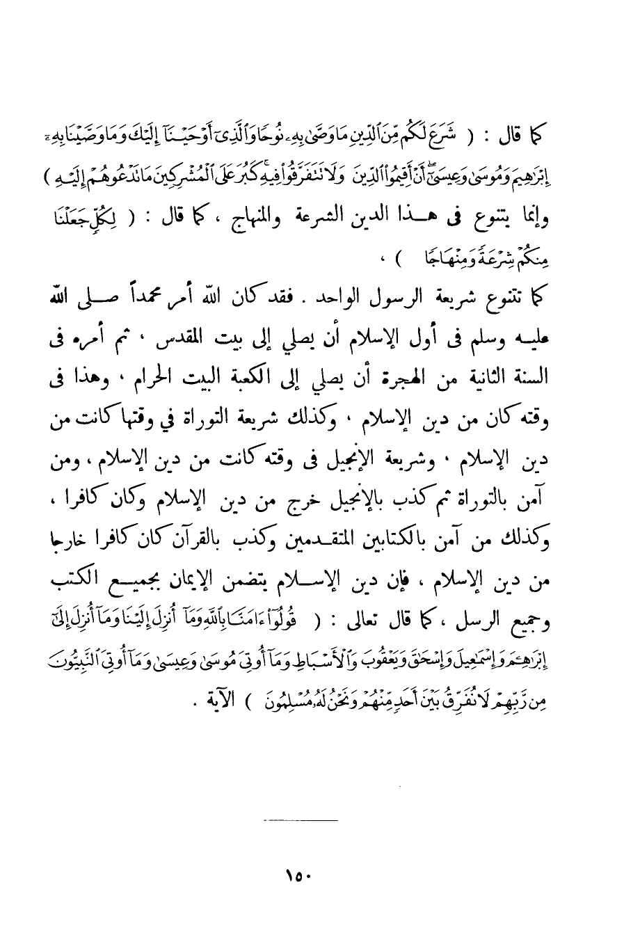 كَمَا قَالَ: {شَرَعَ لَكُمْ مِنَ الدِّينِ مَا وَصَّى بِهِ نُوحًا وَالَّذِي أَوْحَيْنَا إلَيْكَ وَمَا وَصَّيْنَا بِهِ إبْرَاهِيمَ وَمُوسَى وَعِيسَى أَنْ أَقِيمُوا الدِّينَ وَلَا تَتَفَرَّقُوا فِيهِ كَبُرَ عَلَى الْمُشْرِكِينَ مَا تَدْعُوهُمْ إلَيْهِ} وَإِنَّمَا يَتَنَوَّعُ فِي هَذَا الدِّينِ الشِّرْعَةُ وَالْمِنْهَاجُ كَمَا قَالَ: {لِكُلٍّ جَعَلْنَا مِنْكُمْ شِرْعَةً وَمِنْهَاجًا} كَمَا تَتَنَوَّعُ شَرِيعَةُ الرَّسُولِ الْوَاحِدِ. فَقَدْ كَانَ اللَّهُ أَمَرَ مُحَمَّدًا صَلَّى اللَّهُ عَلَيْهِ وَسَلَّمَ فِي أَوَّلِ الْإِسْلَامِ أَنْ يُصَلِّيَ إلَى بَيْتِ الْمَقْدِسِ ثُمَّ أَمَرَهُ فِي السَّنَةِ الثَّانِيَةِ مِنْ الْهِجْرَةِ أَنْ يُصَلِّيَ إلَى الْكَعْبَةِ الْبَيْتِ الْحَرَامِ وَهَذَا فِي وَقْتِهِ كَانَ مِنْ دِينِ الْإِسْلَامِ وَكَذَلِكَ شَرِيعَةُ التَّوْرَاةِ فِي وَقْتِهَا كَانَتْ مِنْ دِينِ الْإِسْلَامِ وَشَرِيعَةُ الْإِنْجِيلِ فِي وَقْتِهِ كَانَتْ مِنْ دِينِ الْإِسْلَامِ وَمَنْ آمَنَ بِالتَّوْرَاةِ ثُمَّ كَذَّبَ بِالْإِنْجِيلِ خَرَجَ مِنْ دِينِ الْإِسْلَامِ وَكَانَ كَافِرًا وَكَذَلِكَ مَنْ آمَنَ بِالْكِتَابَيْنِ الْمُتَقَدِّمَيْنِ وَكَذَّبَ بِالْقُرْآنِ كَانَ كَافِرًا خَارِجًا مِنْ دِينِ الْإِسْلَامِ فَإِنَّ دِينَ الْإِسْلَامِ يَتَضَمَّنُ الْإِيمَانَ بِجَمِيعِ الْكُتُبِ وَجَمِيعِ الرُّسُلِ كَمَا قَالَ تَعَالَى: {قُولُوا آمَنَّا بِاللَّهِ وَمَا أُنْزِلَ إلَيْنَا وَمَا أُنْزِلَ إلَى إبْرَاهِيمَ وَإِسْمَاعِيلَ وَإِسْحَاقَ وَيَعْقُوبَ وَالْأَسْبَاطِ وَمَا أُوتِيَ مُوسَى وَعِيسَى وَمَا أُوتِيَ النَّبِيُّونَ مِنْ رَبِّهِمْ لَا نُفَرِّقُ بَيْنَ أَحَدٍ مِنْهُمْ وَنَحْنُ لَهُ مُسْلِمُونَ} الْآيَةُ.