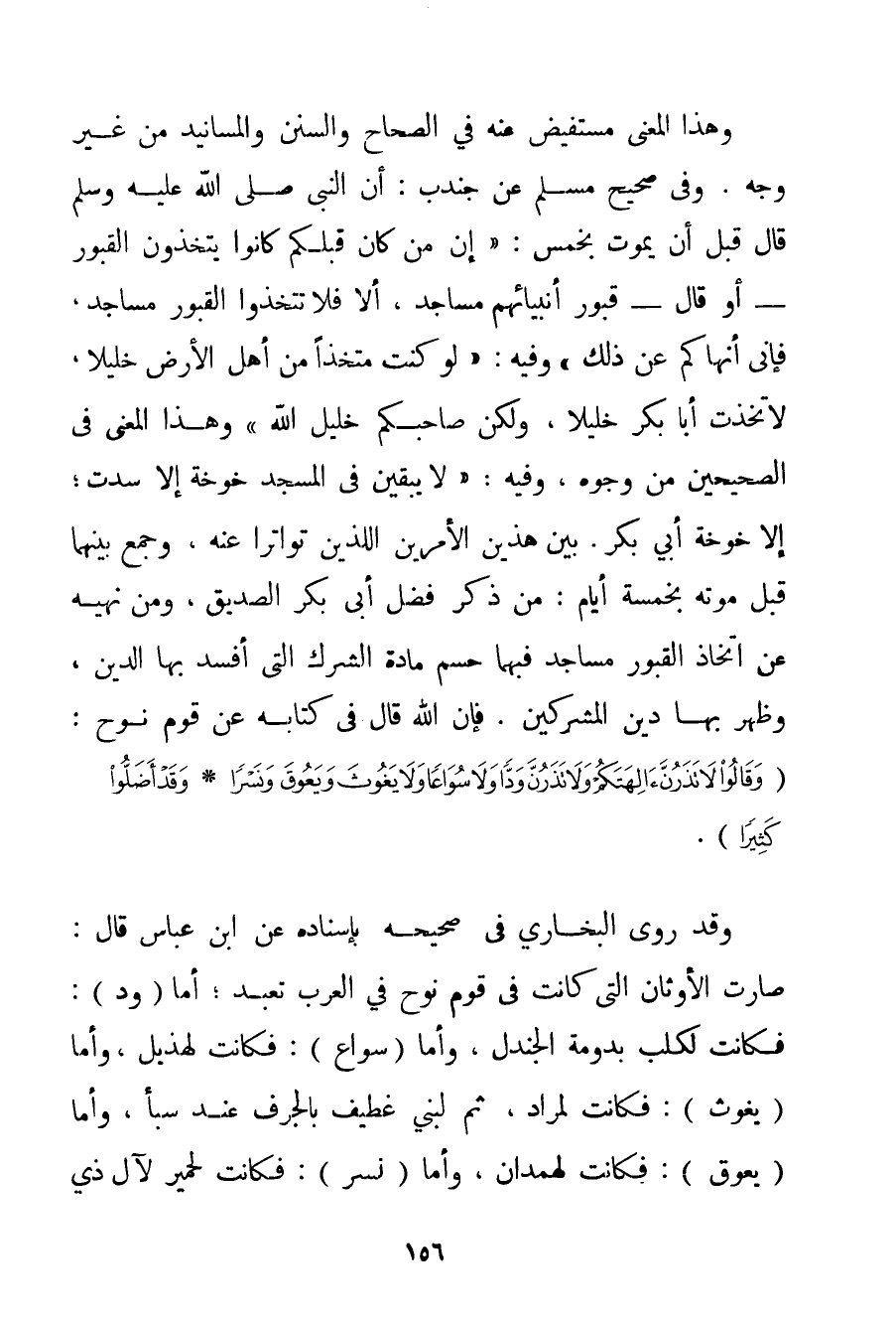 وَهَذَا الْمَعْنَى مُسْتَفِيضٌ عَنْهُ فِي الصِّحَاحِ وَالسُّنَنِ وَالْمَسَانِيدِ مِنْ غَيْرِ وَجْهٍ. وَفِي صَحِيحِ مُسْلِمٍ عَنْ جُنْدُبٍ: أَنَّ النَّبِيَّ صَلَّى اللَّهُ عَلَيْهِ وَسَلَّمَ قَالَ قَبْلَ أَنْ يَمُوتَ بِخَمْسِ: {إنَّ مَنْ كَانَ قَبْلَكُمْ كَانُوا يَتَّخِذُونَ الْقُبُورَ - أَوْ قَالَ - قُبُورَ أَنْبِيَائِهِمْ مَسَاجِدَ أَلَا فَلَا تَتَّخِذُوا الْقُبُورَ مَسَاجِدَ فَإِنِّي أَنْهَاكُمْ عَنْ ذَلِكَ} وَفِيهِ: {لَوْ كُنْت مُتَّخِذًا مِنْ أَهْلِ الْأَرْضِ خَلِيلًا لَاِتَّخَذْت أَبَا بَكْرٍ خَلِيلًا وَلَكِنَّ صَاحِبَكُمْ خَلِيلُ اللَّهِ} وَهَذَا الْمَعْنَى فِي الصَّحِيحَيْنِ مِنْ وُجُوهٍ وَفِيهِ: {لَا يَبْقَيَنَّ فِي الْمَسْجِدِ خَوْخَةٌ إلَّا سُدَّتْ؛ إلَّا خَوْخَةُ أَبِي بَكْرٍ} . بَيْنَ هَذَيْنَ الْأَمْرَيْنِ اللَّذَيْنِ تَوَاتَرَا عَنْهُ وَجَمَعَ بَيْنَهُمَا قَبْلَ مَوْتِهِ بِخَمْسَةِ أَيَّامٍ: مِنْ ذِكْرِ فَضْلِ أَبِي بَكْرٍ الصَّدِيقِ وَمِنْ نَهْيِهِ عَنْ اتِّخَاذِ الْقُبُورِ مَسَاجِدَ فَبِهِمَا حَسْمُ مَادَّةِ الشِّرْكِ الَّتِي أُفْسِدَ بِهَا الدِّينُ وَظَهَرَ بِهَا دِينُ الْمُشْرِكِينَ. فَإِنَّ اللَّهَ قَالَ فِي كِتَابِهِ عَنْ قَوْمِ نُوحٍ: {وَقَالُوا لَا تَذَرُنَّ آلِهَتَكُمْ وَلَا تَذَرُنَّ وَدًّا وَلَا سُوَاعًا وَلَا يَغُوثَ وَيَعُوقَ وَنَسْرًا وَقَدْ أَضَلُّوا كَثِيرًا} . وَقَدْ رَوَى الْبُخَارِيُّ فِي صَحِيحِهِ بِإِسْنَادِهِ عَنْ ابْنِ عَبَّاسٍ قَالَ: صَارَتْ الْأَوْثَانُ الَّتِي كَانَتْ فِي قَوْمِ نُوحٍ فِي الْعَرَبِ تُعْبَدُ؛ أَمَّا (وَدٌّ: فَكَانَتْ لِكَلْبِ بِدَوْمَةِ الْجَنْدَلِ وَأَمَّا (سُوَاعٌ: فَكَانَتْ لهذيل وَأَمَّا (يَغُوثُ: فَكَانَتْ لِمُرَادِ ثُمَّ لِبَنِي غطيف بِالْجَرْفِ عِنْدَ سَبَأٍ وَأَمَّا (يَعُوقُ: فَكَانَتْ لهمدان وَأَمَّا (نَسْرٌ: فَكَانَتْ لَحِمْيَرَ لِآلِ ذِي