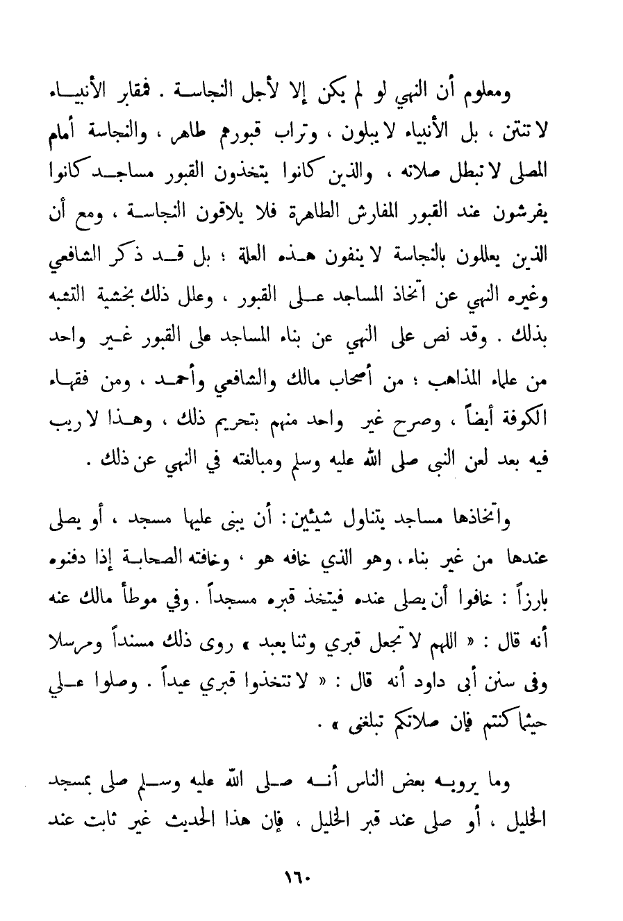 وَمَعْلُومٌ أَنَّ النَّهْيَ لَوْ لَمْ يَكُنْ إلَّا لِأَجْلِ النَّجَاسَةِ. فَمَقَابِرُ الْأَنْبِيَاءِ لَا تُنْتِنُ بَلْ الْأَنْبِيَاءُ لَا يَبْلُونَ وَتُرَابُ قُبُورِهِمْ طَاهِرٌ وَالنَّجَاسَةُ أَمَامَ الْمُصَلِّي لَا تُبْطِلُ صَلَاتَهُ وَاَلَّذِينَ كَانُوا يَتَّخِذُونَ الْقُبُورَ مَسَاجِدَ كَانُوا يَفْرِشُونَ عِنْدَ الْقُبُورِ الْمَفَارِشَ الطَّاهِرَةَ فَلَا يُلَاقُونَ النَّجَاسَةَ وَمَعَ أَنَّ الَّذِينَ يُعَلِّلُونَ بِالنَّجَاسَةِ لَا يَنْفُونَ هَذِهِ الْعِلَّةَ؛ بَلْ قَدْ ذَكَرَ الشَّافِعِيُّ وَغَيْرُهُ النَّهْيَ عَنْ اتِّخَاذِ الْمَسَاجِدِ عَلَى الْقُبُورِ وَعَلَّلَ ذَلِكَ بِخَشْيَةِ التَّشَبُّهِ بِذَلِكَ. وَقَدْ نَصَّ عَلَى النَّهْيِ عَنْ بِنَاءِ الْمَسَاجِدِ عَلَى الْقُبُورِ غَيْرُ وَاحِدٍ مِنْ عُلَمَاءِ الْمَذَاهِبِ؛ مِنْ أَصْحَابِ مَالِكٍ وَالشَّافِعِيِّ وَأَحْمَد وَمِنْ فُقَهَاءَ الْكُوفَةِ أَيْضًا وَصَرَّحَ غَيْرُ وَاحِدٍ مِنْهُمْ بِتَحْرِيمِ ذَلِكَ وَهَذَا لَا رَيْبَ فِيهِ بَعْدَ لَعْنِ النَّبِيِّ صَلَّى اللَّهُ عَلَيْهِ وَسَلَّمَ وَمُبَالَغَتِهِ فِي النَّهْيِ عَنْ ذَلِكَ. وَاِتِّخَاذُهَا مَسَاجِدُ يَتَنَاوَلُ شَيْئَيْنِ: أَنْ يَبْنِيَ عَلَيْهَا مَسْجِدًا أَوْ يُصَلِّيَ عِنْدَهَا مِنْ غَيْرِ بِنَاءٍ وَهُوَ الَّذِي خَافَهُ هُوَ وَخَافَتْهُ الصَّحَابَةُ إذَا دَفَنُوهُ بَارِزًا: خَافُوا أَنْ يُصَلَّى عِنْدَهُ فَيُتَّخَذَ قَبْرُهُ مَسْجِدًا. وَفِي مُوَطَّأِ مَالِكٍ عَنْهُ أَنَّهُ قَالَ: {اللَّهُمَّ لَا تَجْعَلْ قَبْرِي وَثَنًا يُعْبَدُ} رُوِيَ ذَلِكَ مُسْنَدًا وَمُرْسَلًا وَفِي سُنَنِ أَبِي دَاوُد أَنَّهُ قَالَ: {لَا تَتَّخِذُوا قَبْرِي عِيدًا. وَصَلُّوا عَلَيَّ حَيْثُمَا كُنْتُمْ فَإِنَّ صَلَاتَكُمْ تَبْلُغُنِي} . وَمَا يَرْوِيهِ بَعْضُ النَّاسِ أَنَّهُ صَلَّى اللَّهُ عَلَيْهِ وَسَلَّمَ صَلَّى بِمَسْجِدِ الْخَلِيلِ أَوْ صَلَّى عِنْدَ قَبْرِ الْخَلِيلِ فَإِنَّ هَذَا الْحَدِيثَ غَيْرُ ثَابِتٍ عِنْدَ