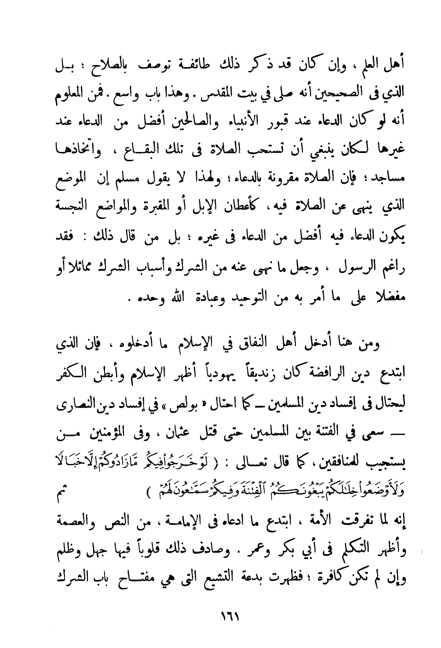 أَهْلِ الْعِلْمِ وَإِنْ كَانَ قَدْ ذَكَرَ ذَلِكَ طَائِفَةٌ تُوصَفُ بِالصَّلَاحِ؛ بَلْ الَّذِي فِي الصَّحِيحَيْنِ {أَنَّهُ صَلَّى فِي بَيْتِ الْمَقْدِسِ} . وَهَذَا بَابٌ وَاسِعٌ. فَمِنْ الْمَعْلُومِ أَنَّهُ لَوْ كَانَ الدُّعَاءُ عِنْدَ قُبُورِ الْأَنْبِيَاءِ وَالصَّالِحِينَ أَفْضَلَ مِنْ الدُّعَاءِ عِنْدَ غَيْرِهَا لَكَانَ يَنْبَغِي أَنْ تُسْتَحَبَّ الصَّلَاةُ فِي تِلْكَ الْبِقَاعِ وَاِتِّخَاذُهَا مَسَاجِدَ؛ فَإِنَّ الصَّلَاةَ مَقْرُونَةٌ بِالدُّعَاءِ؛ وَلِهَذَا لَا يَقُولُ مُسْلِمٌ إنَّ الْمَوْضِعَ الَّذِي يُنْهَى عَنْ الصَّلَاةِ فِيهِ كَأَعْطَانِ الْإِبِلِ أَوْ الْمَقْبَرَةِ وَالْمَوَاضِعِ النَّجِسَةِ يَكُونُ الدُّعَاءُ فِيهِ أَفْضَلَ مِنْ الدُّعَاءِ فِي غَيْرِهِ؛ بَلْ مَنْ قَالَ ذَلِكَ: فَقَدْ رَاغَمَ الرَّسُولَ وَجَعَلَ مَا نَهَى عَنْهُ مِنْ الشِّرْكِ وَأَسْبَابِ الشِّرْكِ مُمَاثِلًا أَوْ مُفَضَّلًا عَلَى مَا أَمَرَ بِهِ مِنْ التَّوْحِيدِ وَعِبَادَةِ اللَّهِ وَحْدَهُ. وَمِنْ هُنَا أَدْخَلَ أَهْلُ النِّفَاقِ فِي الْإِسْلَامِ مَا أَدْخَلُوهُ فَإِنَّ الَّذِي ابْتَدَعَ دِينَ الرَّافِضَةِ كَانَ زِنْدِيقًا يَهُودِيًّا أَظْهَرَ الْإِسْلَامَ وَأَبْطَنَ الْكُفْرَ لِيَحْتَالَ فِي إفْسَادِ دِينِ الْمُسْلِمِينَ - كَمَا احْتَالَ بُولِصَ " فِي إفْسَادِ دِينِ النَّصَارَى - سَعَى فِي الْفِتْنَةِ بَيْنَ الْمُسْلِمِينَ حَتَّى قُتِلَ عُثْمَانُ وَفِي الْمُؤْمِنِينَ مَنْ يَسْتَجِيبُ لِلْمُنَافِقِينَ كَمَا قَالَ تَعَالَى: {لَوْ خَرَجُوا فِيكُمْ مَا زَادُوكُمْ إلَّا خَبَالًا وَلَأَوْضَعُوا خِلَالَكُمْ يَبْغُونَكُمُ الْفِتْنَةَ وَفِيكُمْ سَمَّاعُونَ لَهُمْ} ثُمَّ إنَّهُ لَمَّا تَفَرَّقَتْ الْأُمَّةُ ابْتَدَعَ مَا ادَّعَاهُ فِي الْإِمَامَةِ مِنْ النَّصِّ وَالْعِصْمَةِ وَأَظْهَرَ التَّكَلُّمَ فِي أَبِي بَكْرٍ وَعُمَرَ. وَصَادَفَ ذَلِكَ قُلُوبًا فِيهَا جَهْلٌ وَظُلْمٌ وَإِنْ لَمْ تَكُنْ كَافِرَةً؛ فَظَهَرَتْ بِدْعَةُ التَّشَيُّعِ الَّتِي هِيَ مِفْتَاحُ بَابِ الشِّرْكِ
