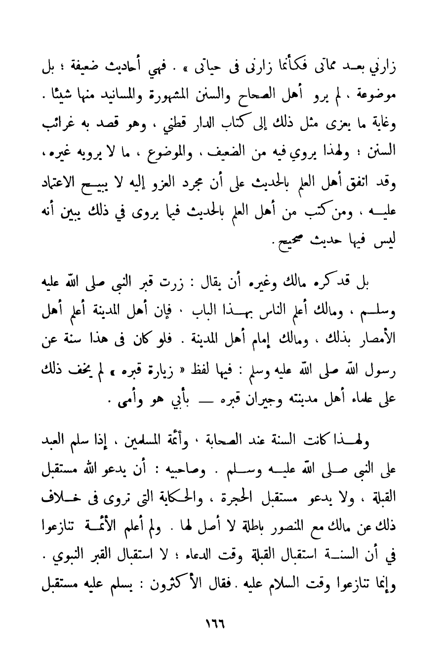 زَارَنِي بَعْدَ مَمَاتِي فَكَأَنَّمَا زَارَنِي فِي حَيَاتِي} . فَهِيَ أَحَادِيثُ ضَعِيفَةٌ؛ بَلْ مَوْضُوعَةٌ لَمْ يَرْوِ أَهْلُ الصِّحَاحِ وَالسُّنَنِ الْمَشْهُورَةِ وَالْمَسَانِيدِ مِنْهَا شَيْئًا. وَغَايَةُ مَا يُعْزَى مِثْلُ ذَلِكَ إلَى كِتَابِ الدارقطني وَهُوَ قَصَدَ بِهِ غَرَائِبَ السُّنَنِ؛ وَلِهَذَا يَرْوِي فِيهِ مِنْ الضَّعِيفِ وَالْمَوْضُوعِ مَا لَا يَرْوِيهِ غَيْرُهُ وَقَدْ اتَّفَقَ أَهْلُ الْعِلْمِ بِالْحَدِيثِ عَلَى أَنَّ مُجَرَّدَ الْعَزْوِ إلَيْهِ لَا يُبِيحُ الِاعْتِمَادَ عَلَيْهِ وَمَنْ كَتَبَ مِنْ أَهْلِ الْعِلْمِ بِالْحَدِيثِ فِيمَا يُرْوَى فِي ذَلِكَ يُبَيِّنُ أَنَّهُ لَيْسَ فِيهَا حَدِيثٌ صَحِيحٌ. بَلْ قَدْ كَرِهَ مَالِكٌ وَغَيْرُهُ أَنْ يُقَالَ: زُرْت قَبْرَ النَّبِيِّ صَلَّى اللَّهُ عَلَيْهِ وَسَلَّمَ وَمَالِكٌ أَعْلَمُ النَّاسِ بِهَذَا الْبَابِ فَإِنَّ أَهْلَ الْمَدِينَةِ أَعْلَمُ أَهْلِ الْأَمْصَارِ بِذَلِكَ وَمَالِكٌ إمَامُ أَهْلِ الْمَدِينَةِ. فَلَوْ كَانَ فِي هَذَا سُنَّةٌ عَنْ رَسُولِ اللَّهِ صَلَّى اللَّهُ عَلَيْهِ وَسَلَّمَ فِيهَا لَفْظُ " زِيَارَةِ قَبْرِهِ " لَمْ يَخْفَ ذَلِكَ عَلَى عُلَمَاءِ أَهْلِ مَدِينَتِهِ وَجِيرَانِ قَبْرِهِ - بِأَبِي هُوَ وَأُمِّي. وَلِهَذَا كَانَتْ السُّنَّةُ عِنْد الصَّحَابَةِ وَأَئِمَّةِ الْمُسْلِمِينَ إذَا سَلَّمَ الْعَبْدُ عَلَى النَّبِيِّ صَلَّى اللَّهُ عَلَيْهِ وَسَلَّمَ. وَصَاحِبَيْهِ: أَنْ يَدْعُوَ اللَّهُ مُسْتَقْبِلَ الْقِبْلَةِ وَلَا يَدْعُوَ مُسْتَقْبِلَ الْحُجْرَةِ وَالْحِكَايَةُ الَّتِي تُرْوَى فِي خِلَافِ ذَلِكَ عَنْ مَالِكٍ مَعَ الْمَنْصُورِ بَاطِلَةٌ لَا أَصْلَ لَهَا. وَلَمْ أَعْلَمْ الْأَئِمَّةَ تَنَازَعُوا فِي أَنَّ السُّنَّةَ اسْتِقْبَالُ الْقِبْلَةِ وَقْتَ الدُّعَاءِ؛ لَا اسْتِقْبَالُ الْقَبْرِ النَّبَوِيِّ. وَإِنَّمَا تَنَازَعُوا وَقْتَ السَّلَامِ عَلَيْهِ. فَقَالَ الْأَكْثَرُونَ: يُسَلِّمُ عَلَيْهِ مُسْتَقْبِلَ