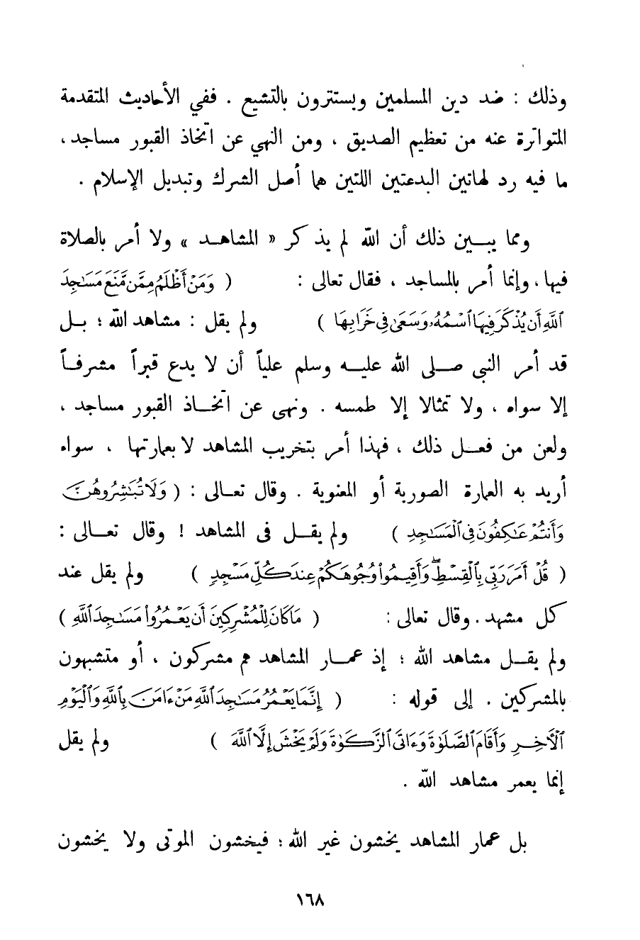 وَذَلِكَ: ضِدُّ دِينِ الْمُسْلِمِينَ وَيَسْتَتِرُونَ بِالتَّشَيُّعِ. فَفِي الْأَحَادِيثِ الْمُتَقَدِّمَةِ الْمُتَوَاتِرَةِ عَنْهُ مِنْ تَعْظِيمِ الصِّدِّيقِ وَمِنْ النَّهْيِ عَنْ اتِّخَاذِ الْقُبُورِ مَسَاجِدَ مَا فِيهِ رَدٌّ لِهَاتَيْنِ الْبِدْعَتَيْنِ اللَّتَيْنِ هُمَا أَصْلُ الشِّرْكِ وَتَبْدِيلِ الْإِسْلَامِ. وَمِمَّا يُبَيِّنُ ذَلِكَ أَنَّ اللَّهَ لَمْ يَذْكُرْ " الْمَشَاهِدَ " وَلَا أَمَرَ بِالصَّلَاةِ فِيهَا وَإِنَّمَا أَمَرَ بِالْمَسَاجِدِ فَقَالَ تَعَالَى: {وَمَنْ أَظْلَمُ مِمَّنْ مَنَعَ مَسَاجِدَ اللَّهِ أَنْ يُذْكَرَ فِيهَا اسْمُهُ وَسَعَى فِي خَرَابِهَا} وَلَمْ يَقُلْ: مَشَاهِدَ اللَّهِ؛ بَلْ قَدْ {أَمَرَ النَّبِيُّ صَلَّى اللَّهُ عَلَيْهِ وَسَلَّمَ عَلِيًّا أَنْ لَا يَدَعَ قَبْرًا مُشْرِفًا إلَّا سَوَّاهُ وَلَا تِمْثَالًا إلَّا طَمَسَهُ} . وَنَهَى عَنْ اتِّخَاذِ الْقُبُورِ مَسَاجِدَ وَلَعَنَ مَنْ فَعَلَ ذَلِكَ فَهَذَا أَمْرٌ بِتَخْرِيبِ الْمَشَاهِدِ لَا بِعِمَارَتِهَا سَوَاءٌ أُرِيدَ بِهِ الْعِمَارَةُ الصُّورِيَّةُ أَوْ الْمَعْنَوِيَّةُ. وَقَالَ تَعَالَى: {وَلَا تُبَاشِرُوهُنَّ وَأَنْتُمْ عَاكِفُونَ فِي الْمَسَاجِدِ} وَلَمْ يَقُلْ فِي الْمَشَاهِدِ وَقَالَ تَعَالَى: {قُلْ أَمَرَ رَبِّي بِالْقِسْطِ وَأَقِيمُوا وُجُوهَكُمْ عِنْدَ كُلِّ مَسْجِدٍ} وَلَمْ يَقُلْ عِنْدَ كُلِّ مَشْهَدٍ. وَقَالَ تَعَالَى: {مَا كَانَ لِلْمُشْرِكِينَ أَنْ يَعْمُرُوا مَسَاجِدَ اللَّهِ} وَلَمْ يَقُلْ مَشَاهِدَ اللَّهِ؛ إذْ عُمَّارُ الْمَشَاهِدِ هُمْ مُشْرِكُونَ أَوْ مُتَشَبِّهُونَ بِالْمُشْرِكِينَ. إلَى قَوْلِهِ: {إنَّمَا يَعْمُرُ مَسَاجِدَ اللَّهِ مَنْ آمَنَ بِاللَّهِ وَالْيَوْمِ الْآخِرِ وَأَقَامَ الصَّلَاةَ وَآتَى الزَّكَاةَ وَلَمْ يَخْشَ إلَّا اللَّهَ} وَلَمْ يَقُلْ إنَّمَا يَعْمُرُ مَشَاهِدَ اللَّهِ. بَلْ عُمَّارُ الْمَشَاهِدِ يَخْشَوْنَ غَيْرَ اللَّهِ؛ فَيَخْشَوْنَ الْمَوْتَى وَلَا يَخْشَوْنَ