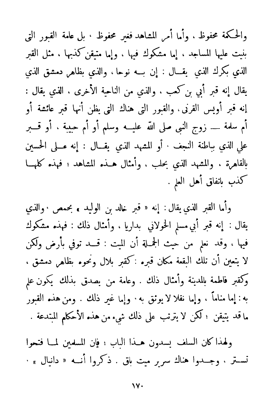 وَالْحِكْمَةِ مَحْفُوظٌ وَأَمَّا أَمْرُ الْمَشَاهِدِ فَغَيْرُ مَحْفُوظٍ بَلْ عَامَّةُ الْقُبُورِ الَّتِي بُنِيَتْ عَلَيْهَا الْمَسَاجِدُ إمَّا مَشْكُوكٌ فِيهَا وَإِمَّا مُتَيَقَّنٌ كَذِبُهَا مِثْلُ الْقَبْرِ الَّذِي بِكْرك الَّذِي يُقَالُ: إنَّ بِهِ نُوحٌ وَاَلَّذِي بِظَاهِرِ دِمَشْقَ الَّذِي يُقَالُ إنَّهُ قَبْرُ أبي بْنِ كَعْبٍ وَاَلَّذِي مِنْ النَّاحِيَةِ الْأُخْرَى الَّذِي يُقَالُ: إنَّهُ قَبْرُ أُوَيْسٍ القرني وَالْقُبُورُ الَّتِي هُنَاكَ الَّتِي يُظَنُّ أَنَّهَا قَبْرُ عَائِشَةَ أَوْ أُمِّ سَلَمَةَ - زَوْجِ النَّبِيِّ صَلَّى اللَّهُ عَلَيْهِ وَسَلَّمَ أَوْ أُمِّ حَبِيبَةَ أَوْ قَبْرُ عَلِيٍّ الَّذِي بِبَاطِنَةِ النَّجَفِ أَوْ الْمَشْهَدُ الَّذِي يُقَالُ: إنَّهُ عَلَى الْحُسَيْنِ بِالْقَاهِرَةِ وَالْمَشْهَدُ الَّذِي بِحَلَبِ وَأَمْثَالُ هَذِهِ الْمَشَاهِدِ؛ فَهَذِهِ كُلُّهَا كَذِبٌ بِاتِّفَاقِ أَهْلِ الْعِلْمِ. وَأَمَّا الْقَبْرُ الَّذِي يُقَالُ: إنَّهُ " قَبْرُ خَالِدِ بْنِ الْوَلِيدِ " بحمص وَاَلَّذِي يُقَالُ: إنَّهُ قَبْرُ أَبِي مُسْلِمٍ الخولاني بداريا وَأَمْثَالُ ذَلِكَ: فَهَذِهِ مَشْكُوكٌ فِيهَا وَقَدْ نَعْلَمُ مِنْ حَيْثُ الْجُمْلَةِ أَنَّ الْمَيِّتَ: قَدْ تُوُفِّيَ بِأَرْضِ وَلَكِنْ لَا يَتَعَيَّنُ أَنَّ تِلْكَ الْبُقْعَةَ مَكَانُ قَبْرِهِ: كَقَبْرِ بِلَالٍ وَنَحْوِهِ بِظَاهِرِ دِمَشْقَ وَكَقَبْرِ فَاطِمَةَ بِالْمَدِينَةِ وَأَمْثَالِ ذَلِكَ. وَعَامَّةُ مَنْ يُصَدِّقُ بِذَلِكَ يَكُونُ عَلِمَ بِهِ: إمَّا مَنَامًا وَإِمَّا نَقْلًا لَا يُوثَقُ بِهِ وَإِمَّا غَيْرَ ذَلِكَ. وَمِنْ هَذِهِ الْقُبُورِ مَا قَدْ يُتَيَقَّنُ؛ لَكِنْ لَا يَتَرَتَّبُ عَلَى ذَلِكَ شَيْءٌ مِنْ هَذِهِ الْأَحْكَامِ الْمُبْتَدَعَةِ. وَلِهَذَا كَانَ السَّلَفُ يَسِدُّونَ هَذَا الْبَابَ؛ فَإِنَّ الْمُسْلِمِينَ لَمَّا فَتَحُوا تُسْتَرَ وَجَدُوا هُنَاكَ سَرِيرَ مَيِّتٍ بَاقٍ. ذَكَرُوا أَنَّهُ " دَانْيَالَ "