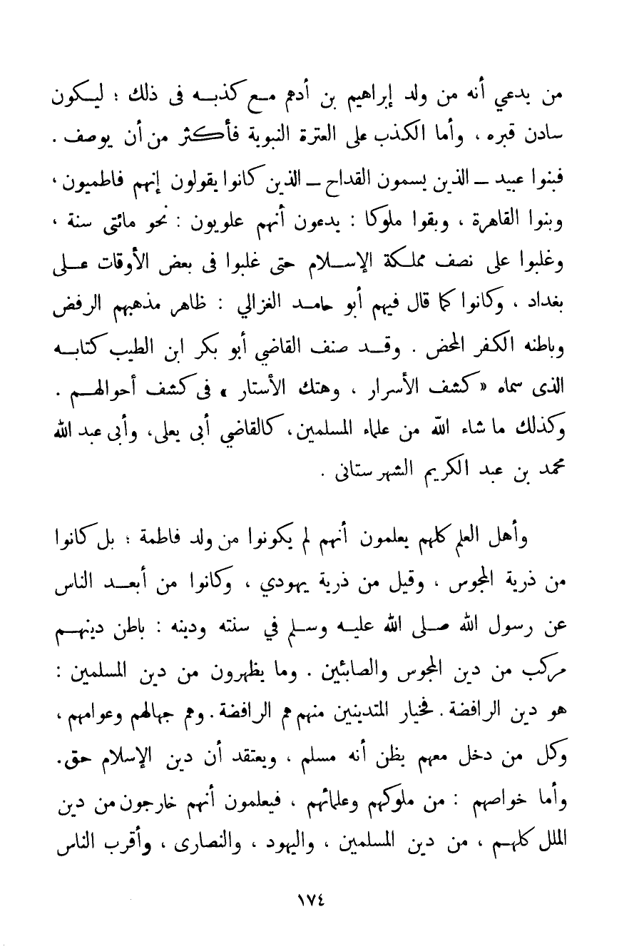 أَنَّهُ مِنْ وَلَدِ إبْرَاهِيمَ بْنِ أَدْهَمَ مَعَ كَذِبِهِ فِي ذَلِكَ؛ لِيَكُونَ سَادِنَ قَبْرِهِ وَأَمَّا الْكَذِبُ عَلَى الْعِتْرَةِ النَّبَوِيَّةِ فَأَكْثَرُ مِنْ أَنْ يُوصَفَ. فَبَنُو عُبَيْدٍ - الَّذِينَ يُسَمَّوْنَ القداح - الَّذِينَ كَانُوا يَقُولُونَ إنَّهُمْ فَاطِمِيُّونَ وَبَنُو الْقَاهِرَةِ وَبَقُوا مُلُوكًا: يَدَّعُونَ أَنَّهُمْ عَلَوِيُّونَ: نَحْوَ مِائَتَيْ سَنَةٍ وَغَلَبُوا عَلَى نِصْفِ مَمْلَكَةِ الْإِسْلَامِ حَتَّى غَلَبُوا فِي بَعْضِ الْأَوْقَاتِ عَلَى بَغْدَادَ وَكَانُوا كَمَا قَالَ فِيهِمْ أَبُو حَامِدٍ الْغَزَالِيُّ: ظَاهِرُ مَذْهَبِهِمْ الرَّفْضُ وَبَاطِنُهُ الْكُفْرُ الْمَحْضُ. وَقَدْ صَنَّفَ الْقَاضِي أَبُو بَكْرِ بْنُ الطَّيِّبِ كِتَابَهُ الَّذِي سَمَّاهُ " كَشْفُ الْأَسْرَارِ وَهَتْكُ الْأَسْتَارِ " فِي كَشْفِ أَحْوَالِهِمْ. وَكَذَلِكَ مَا شَاءَ اللَّهُ مِنْ عُلَمَاءِ الْمُسْلِمِينَ كَالْقَاضِي أَبِي يَعْلَى وَأَبِي عَبْدِ اللَّهِ مُحَمَّدِ بْنِ عَبْدِ الْكَرِيمِ الشَّهْرَستَانِي. وَأَهْلُ الْعِلْمِ كُلُّهُمْ يَعْلَمُونَ أَنَّهُمْ لَمْ يَكُونُوا مِنْ وَلَدِ فَاطِمَةَ؛ بَلْ كَانُوا مِنْ ذُرِّيَّةِ الْمَجُوسِ وَقِيلَ مِنْ ذُرِّيَّةِ يَهُودِيٍّ وَكَانُوا مِنْ أَبْعَدِ النَّاسِ عَنْ رَسُولِ اللَّهِ صَلَّى اللَّهُ عَلَيْهِ وَسَلَّمَ فِي سُنَّتِهِ وَدِينِهِ: بَاطِنُ دِينِهِمْ مُرَكَّبٌ مِنْ دِينِ الْمَجُوسِ وَالصَّابِئِينَ. وَمَا يُظْهِرُونَ مِنْ دِينِ الْمُسْلِمِينَ: هُوَ دِينُ الرَّافِضَةِ. فَخِيَارُ الْمُتَدَيِّنِينَ مِنْهُمْ هُمْ الرَّافِضَةُ. وَهُمْ جُهَّالُهُمْ وَعَوَامُّهُمْ وَكُلُّ مَنْ دَخَلَ مَعَهُمْ يَظُنُّ أَنَّهُ مُسْلِمٌ وَيَعْتَقِدُ أَنَّ دِينَ الْإِسْلَامِ حَقٌّ. وَأَمَّا خَوَاصُّهُمْ: مِنْ مُلُوكِهِمْ وَعُلَمَائِهِمْ فَيَعْلَمُونَ أَنَّهُمْ خَارِجُونَ مِنْ دِينِ الْمِلَلِ كُلُّهُمْ مِنْ دِينِ الْمُسْلِمِينَ وَالْيَهُودِ وَالنَّصَارَى وَأَقْرَبُ النَّاسِ