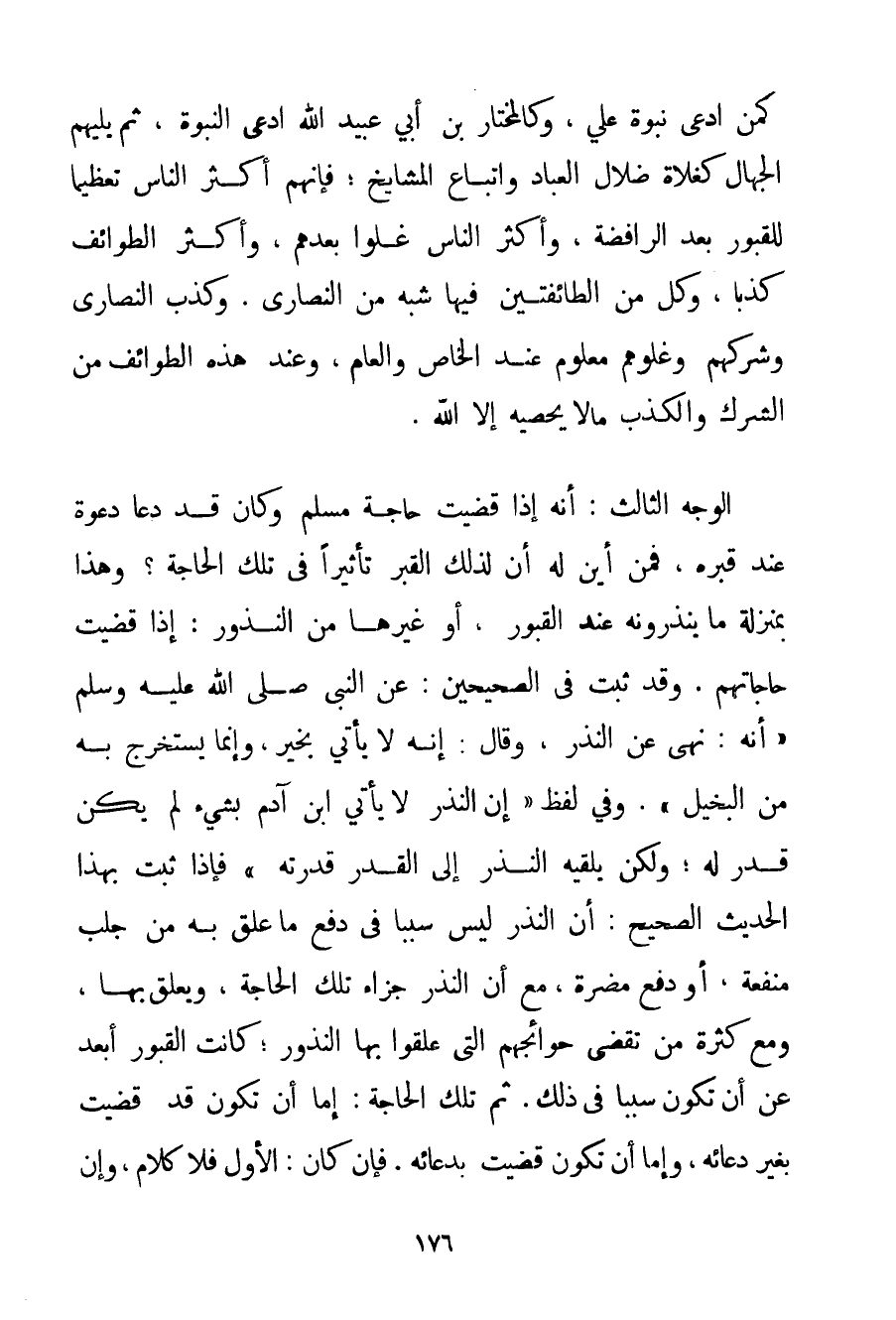 كَمَنْ ادَّعَى نُبُوَّةَ عَلِيٍّ وَكَالْمُخْتَارِ بْنِ أَبِي عُبَيْدِ ادَّعَى النُّبُوَّةَ ثُمَّ يَلِيهِمْ الْجُهَّالُ كَغُلَاةِ ضُلَّالِ الْعُبَّادِ وَأَتْبَاعِ الْمَشَايِخِ؛ فَإِنَّهُمْ أَكْثَرُ النَّاسِ تَعْظِيمًا لِلْقُبُورِ بَعْدَ الرَّافِضَةِ وَأَكْثَرُ النَّاسِ غُلُوًّا بَعْدَهُمْ وَأَكْثَرُ الطَّوَائِفِ كَذِبًا وَكُلٌّ مِنْ الطَّائِفَتَيْنِ فِيهَا شَبَهٌ مِنْ النَّصَارَى. وَكَذِبُ النَّصَارَى وَشِرْكُهُمْ وَغُلُوُّهُمْ مَعْلُومٌ عِنْدَ الْخَاصِّ وَالْعَامِّ وَعِنْدَ هَذِهِ الطَّوَائِفِ مِنْ الشِّرْكِ وَالْكَذِبِ مَا لَا يُحْصِيهِ إلَّا اللَّهُ. الْوَجْهُ الثَّالِثُ: أَنَّهُ إذَا قُضِيَتْ حَاجَةُ مُسْلِمٍ وَكَانَ قَدْ دَعَا دَعْوَةً عِنْدَ قَبْرِهِ فَمِنْ أَيْنَ لَهُ أَنَّ لِذَلِكَ الْقَبْرِ تَأْثِيرًا فِي تِلْكَ الْحَاجَةِ؟ وَهَذَا بِمَنْزِلَةِ مَا يَنْذِرُونَهُ عِنْدَ الْقُبُورِ أَوْ غَيْرِهَا مِنْ النُّذُورِ: إذَا قُضِيَتْ حَاجَاتُهُمْ. وَقَدْ ثَبَتَ فِي الصَّحِيحَيْنِ: عَنْ النَّبِيِّ صَلَّى اللَّهُ عَلَيْهِ وَسَلَّمَ {أَنَّهُ: نَهَى عَنْ النَّذْرِ وَقَالَ: إنَّهُ لَا يَأْتِي بِخَيْرِ وَإِنَّمَا يُسْتَخْرَجُ بِهِ مِنْ الْبَخِيلِ} . وَفِي لَفْظٍ {إنَّ النَّذْرَ لَا يَأْتِي ابْنَ آدَمَ بِشَيْءِ لَمْ يَكُنْ قُدِّرَ لَهُ؛ وَلَكِنْ يُلْقِيهِ النَّذْرُ إلَى الْقَدَرِ قَدَّرْته} فَإِذَا ثَبَتَ بِهَذَا الْحَدِيثِ الصَّحِيحِ: أَنَّ النَّذْرَ لَيْسَ سَبَبًا فِي دَفْعِ مَا عَلِقَ بِهِ مِنْ جَلْبِ مَنْفَعَةٍ أَوْ دَفْعِ مَضَرَّةٍ مَعَ أَنَّ النَّذْرَ جَزَاءُ تِلْكَ الْحَاجَةِ وَيَعْلَقُ بِهَا وَمَعَ كَثْرَةِ مَنْ تُقْضَى حَوَائِجُهُمْ الَّتِي عَلَّقُوا بِهَا النُّذُورَ؛ كَانَتْ الْقُبُورُ أَبْعَدَ عَنْ أَنْ تَكُونَ سَبَبًا فِي ذَلِكَ. ثُمَّ تِلْكَ الْحَاجَةُ: إمَّا أَنْ تَكُونَ قَدْ قُضِيَتْ بِغَيْرِ دُعَائِهِ وَإِمَّا أَنْ تَكُونَ قُضِيَتْ بِدُعَائِهِ. فَإِنْ كَانَ: الْأَوَّلَ فَلَا كَلَامَ وَإِنْ