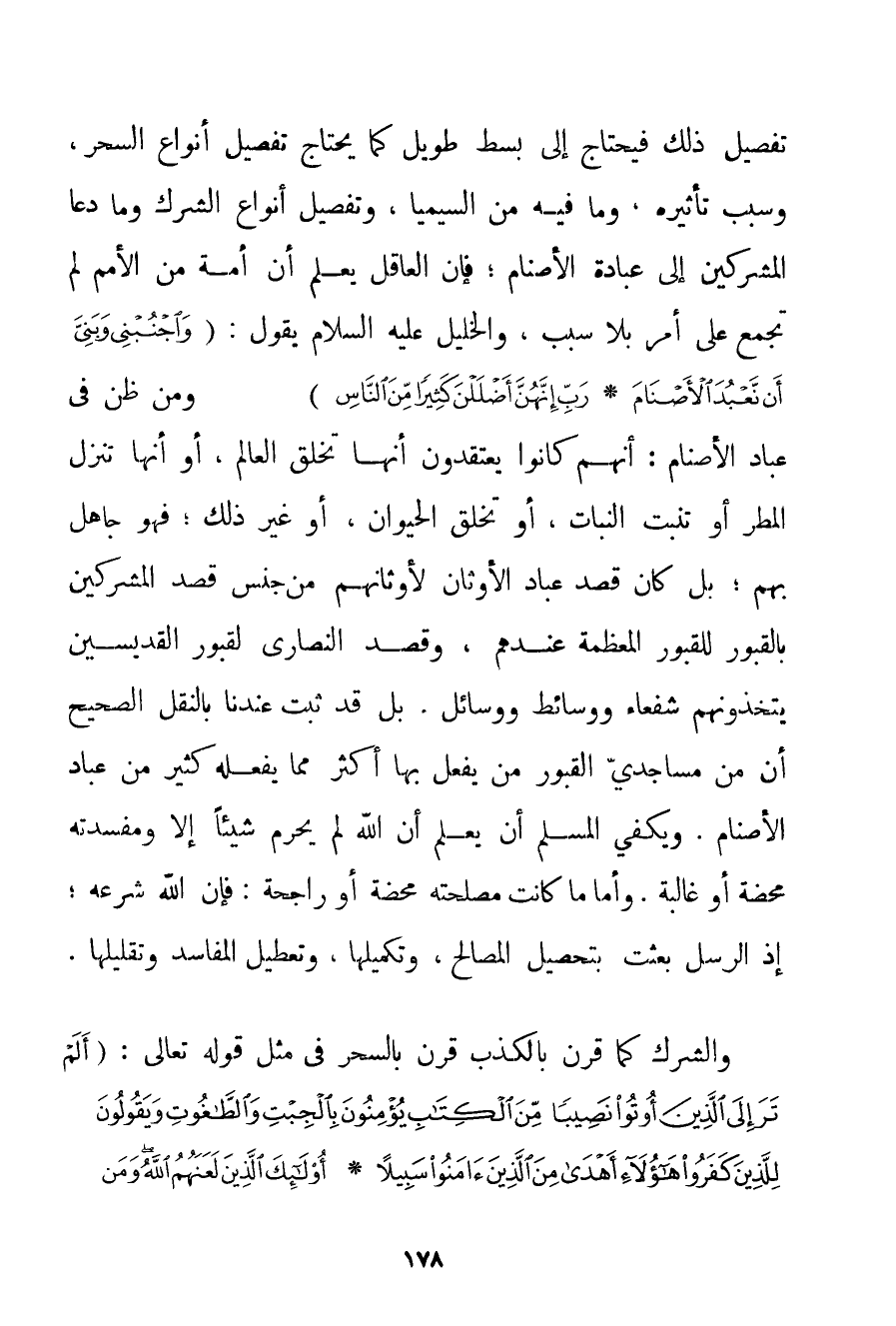تَفْصِيلُ ذَلِكَ فَيَحْتَاجُ إلَى بَسْطٍ طَوِيلٍ كَمَا يَحْتَاجُ تَفْصِيلُ أَنْوَاعِ السِّحْرِ وَسَبَبُ تَأْثِيرِهِ وَمَا فِيهِ مِنْ السِّيمَيَا وَتَفْصِيلُ أَنْوَاعِ الشِّرْكِ وَمَا دَعَا الْمُشْرِكِينَ إلَى عِبَادَةِ الْأَصْنَامِ؛ فَإِنَّ الْعَاقِلَ يَعْلَمُ أَنَّ أُمَّةً مِنْ الْأُمَمِ لَمْ تُجْمِعْ عَلَى أَمْرٍ بِلَا سَبَبٍ وَالْخَلِيلُ عَلَيْهِ السَّلَامُ يَقُولُ: {وَاجْنُبْنِي وَبَنِيَّ أَنْ نَعْبُدَ الْأَصْنَامَ} {رَبِّ إنَّهُنَّ أَضْلَلْنَ كَثِيرًا مِنَ النَّاسِ} وَمَنْ ظَنَّ فِي عُبَّادِ الْأَصْنَامِ: أَنَّهُمْ كَانُوا يَعْتَقِدُونَ أَنَّهَا تَخْلُقُ الْعَالَمَ أَوْ أَنَّهَا تُنَزِّلُ الْمَطَرَ أَوْ تُنْبِتُ النَّبَاتَ أَوْ تَخْلُقُ الْحَيَوَانَ أَوْ غَيْرَ ذَلِكَ؛ فَهُوَ جَاهِلٌ بِهِمْ؛ بَلْ كَانَ قَصْدُ عُبَّادِ الْأَوْثَانِ لِأَوْثَانِهِمْ مِنْ جِنْسِ قَصْدِ الْمُشْرِكِينَ بِالْقُبُورِ لِلْقُبُورِ الْمُعَظَّمَةِ عِنْدَهُمْ وَقَصْدِ النَّصَارَى لِقُبُورِ الْقِدِّيسِينَ يَتَّخِذُونَهُمْ شُفَعَاءَ وَوَسَائِطَ وَوَسَائِلَ. بَلْ قَدْ ثَبَتَ عِنْدَنَا بِالنَّقْلِ الصَّحِيحِ أَنَّ مِنْ مساجدي الْقُبُورِ مَنْ يَفْعَلُ بِهَا أَكْثَرَ مِمَّا يَفْعَلُهُ كَثِيرٌ مِنْ عُبَّادِ الْأَصْنَامِ. وَيَكْفِي الْمُسْلِمَ أَنْ يَعْلَمَ أَنَّ اللَّهَ لَمْ يُحَرِّمْ شَيْئًا إلَّا وَمَفْسَدَتُهُ مَحْضَةٌ أَوْ غَالِبَةٌ. وَأَمَّا مَا كَانَتْ مَصْلَحَتُهُ مَحْضَةً أَوْ رَاجِحَةً: فَإِنَّ اللَّهَ شَرَعَهُ؛ إذْ الرُّسُلُ بُعِثَتْ بِتَحْصِيلِ الْمَصَالِحِ وَتَكْمِيلِهَا وَتَعْطِيلِ الْمَفَاسِدِ وَتَقْلِيلِهَا. وَالشِّرْكُ كَمَا قُرِنَ بِالْكَذِبِ قُرِنَ بِالسِّحْرِ فِي مِثْلِ قَوْله تَعَالَى {أَلَمْ تَرَ إلَى الَّذِينَ أُوتُوا نَصِيبًا مِنَ الْكِتَابِ يُؤْمِنُونَ بِالْجِبْتِ وَالطَّاغُوتِ وَيَقُولُونَ لِلَّذِينَ كَفَرُوا هَؤُلَاءِ أَهْدَى مِنَ الَّذِينَ آمَنُوا سَبِيلًا} {أُولَئِكَ