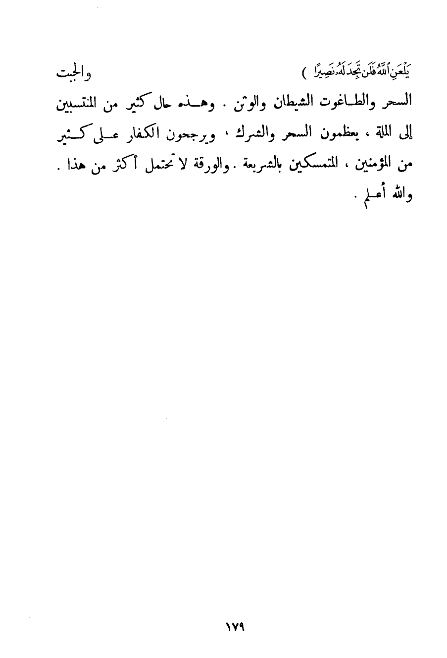 الَّذِينَ لَعَنَهُمُ اللَّهُ وَمَنْ يَلْعَنِ اللَّهُ فَلَنْ تَجِدَ لَهُ نَصِيرًا} وَالْجِبْتُ السِّحْرُ وَالطَّاغُوتُ الشَّيْطَانُ وَالْوَثَنُ. وَهَذِهِ حَالُ كَثِيرٍ مِنْ الْمُنْتَسِبِينَ إلَى الْمِلَّةِ يُعَظِّمُونَ السِّحْرَ وَالشِّرْكَ وَيُرَجِّحُونَ الْكُفَّارَ عَلَى كَثِيرٍ مِنْ الْمُؤْمِنِينَ الْمُتَمَسِّكِينَ بِالشَّرِيعَةِ. وَالْوَرَقَةُ لَا تَحْتَمِلُ أَكْثَرَ مِنْ هَذَا. وَاَللَّهُ أَعْلَمُ.