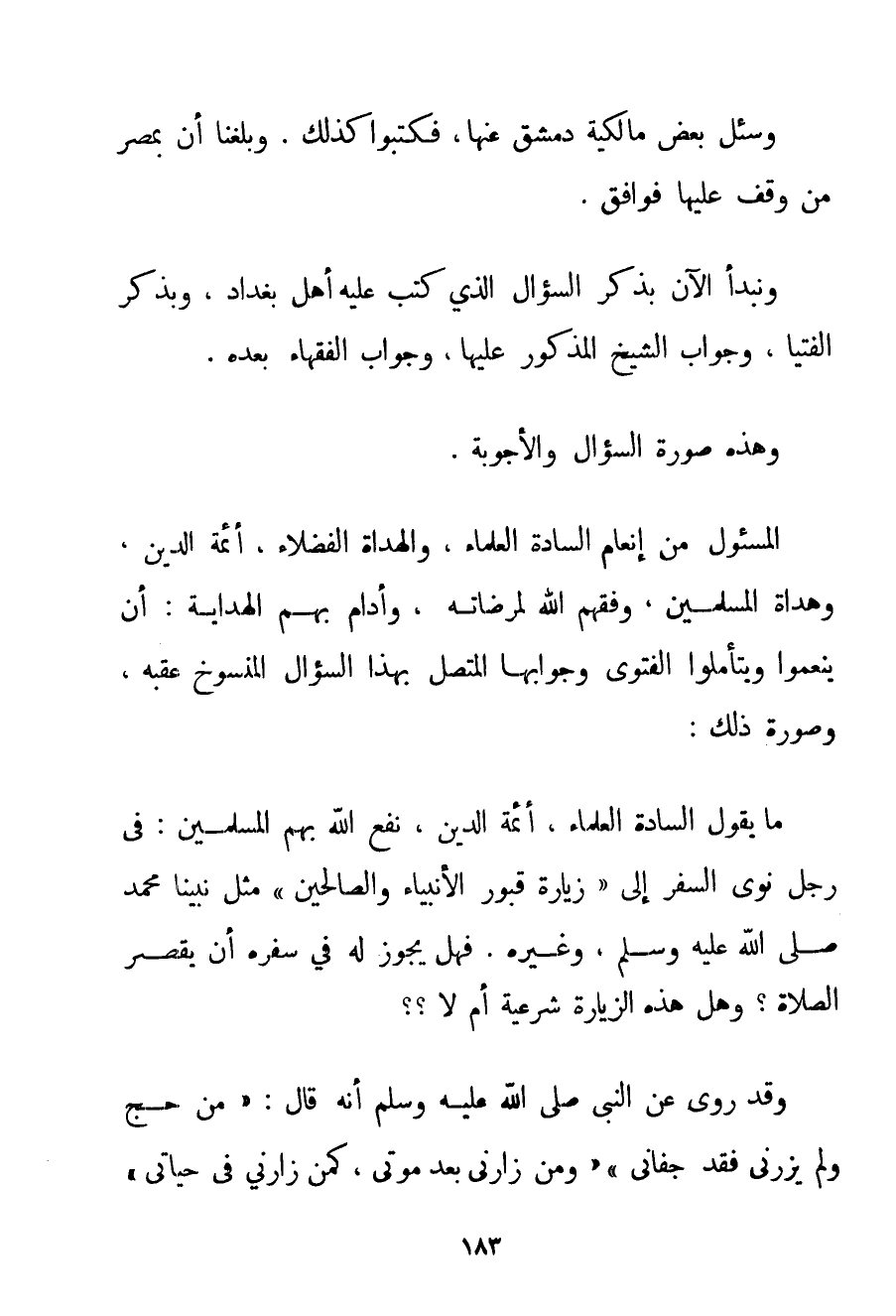 وَسُئِلَ بَعْضُ مَالِكِيَّةِ دِمَشْقَ عَنْهَا فَكَتَبُوا كَذَلِكَ. وَبَلَغَنَا أَنَّ بِمِصْرِ مَنْ وَقَفَ عَلَيْهَا فَوَافَقَ. وَنَبْدَأُ الْآنَ بِذِكْرِ السُّؤَالِ الَّذِي كَتَبَ عَلَيْهِ أَهْلُ بَغْدَادَ وَبِذِكْرِ الْفُتْيَا وَجَوَابِ الشَّيْخِ الْمَذْكُورِ عَلَيْهَا وَجَوَابِ الْفُقَهَاءِ بَعْدَهُ. وَهَذِهِ صُورَةُ السُّؤَالِ وَالْأَجْوِبَةِ. الْمَسْئُولُ مِنْ إنْعَامِ السَّادَةِ الْعُلَمَاءِ وَالْهُدَاةِ الْفُضَلَاءِ أَئِمَّةِ الدِّينِ وَهُدَاةِ الْمُسْلِمِينَ وَفَّقَهُمْ اللَّهُ لِمَرْضَاتِهِ وَأَدَامَ بِهِمْ الْهِدَايَةَ: أَنْ يَنْعَمُوا وَيَتَأَمَّلُوا الْفَتْوَى وَجَوَابَهَا الْمُتَّصِلَ بِهَذَا السُّؤَالِ الْمَنْسُوخِ عَقِبَهُ وَصُورَةُ ذَلِكَ: مَا يَقُولُ السَّادَةُ الْعُلَمَاءُ أَئِمَّةُ الدِّينِ نَفَعَ اللَّهُ بِهِمْ الْمُسْلِمِينَ: فِي رَجُلٍ نَوَى السَّفَرَ إلَى " زِيَارَةِ قُبُورِ الْأَنْبِيَاءِ وَالصَّالِحِينَ " مِثْلِ نَبِيِّنَا مُحَمَّدٍ صَلَّى اللَّهُ عَلَيْهِ وَسَلَّمَ وَغَيْرِهِ. فَهَلْ يَجُوزُ لَهُ فِي سَفَرِهِ أَنْ يَقْصُرَ الصَّلَاةَ؟ وَهَلْ هَذِهِ الزِّيَارَةُ شَرْعِيَّةٌ أَمْ لَا؟ ؟ وَقَدْ رُوِيَ عَنْ النَّبِيِّ صَلَّى اللَّهُ عَلَيْهِ وَسَلَّمَ أَنَّهُ قَالَ: {مَنْ حَجَّ وَلَمْ يَزُرْنِي فَقَدْ جَفَانِي} {وَمَنْ زَارَنِي بَعْدَ مَوْتِي كَمَنْ زَارَنِي فِي حَيَاتِي}