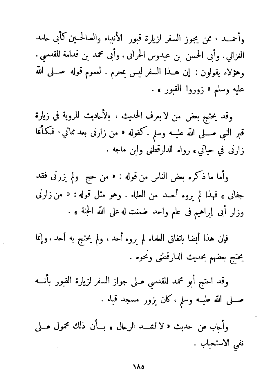 وَأَحْمَد مِمَّنْ يُجَوِّزُ السَّفَرَ لِزِيَارَةِ قُبُورِ الْأَنْبِيَاءِ وَالصَّالِحِينَ كَأَبِي حَامِدٍ الْغَزَالِيِّ وَأَبِي الْحَسَنِ بْنِ عبدوس الْحَرَّانِي وَأَبِي مُحَمَّدِ بْنِ قدامة المقدسي. وَهَؤُلَاءِ يَقُولُونَ: إنَّ هَذَا السَّفَرَ لَيْسَ بِمُحَرَّمِ. لِعُمُومِ قَوْلِهِ صَلَّى اللَّهُ عَلَيْهِ وَسَلَّمَ {زُورُوا الْقُبُورَ} . وَقَدْ يَحْتَجُّ بَعْضُ مَنْ لَا يَعْرِفُ الْحَدِيثَ بِالْأَحَادِيثِ الْمَرْوِيَّةِ فِي زِيَارَةِ قَبْرِ النَّبِيِّ صَلَّى اللَّهُ عَلَيْهِ وَسَلَّمَ. كَقَوْلِهِ {مَنْ زَارَنِي بَعْدَ مَمَاتِي فَكَأَنَّمَا زَارَنِي فِي حَيَاتِي} رَوَاهُ الدارقطني وَابْنُ مَاجَه. وَأَمَّا مَا ذَكَرَهُ بَعْضُ النَّاسِ مِنْ قَوْلِهِ: {مَنْ حَجَّ وَلَمْ يَزُرْنِي فَقَدْ جَفَانِي} فَهَذَا لَمْ يَرْوِهِ أَحَدٌ مِنْ الْعُلَمَاءِ. وَهُوَ مِثْلُ قَوْلِهِ: {مَنْ زَارَنِي وَزَارَ أَبِي إبْرَاهِيمَ فِي عَامٍ وَاحِدٍ ضَمِنْت لَهُ عَلَى اللَّهِ الْجَنَّةَ} . فَإِنَّ هَذَا أَيْضًا بِاتِّفَاقِ الْعُلَمَاءِ لَمْ يَرْوِهِ أَحَدٌ وَلَمْ يَحْتَجَّ بِهِ أَحَدٌ وَإِنَّمَا يَحْتَجُّ بَعْضُهُمْ بِحَدِيثِ الدارقطني وَنَحْوِهِ. وَقَدْ احْتَجَّ أَبُو مُحَمَّدٍ المقدسي عَلَى جَوَازِ السَّفَرِ لِزِيَارَةِ الْقُبُورِ بِأَنَّهُ صَلَّى اللَّهُ عَلَيْهِ وَسَلَّمَ كَانَ يَزُورُ مَسْجِدَ قُبَاء. وَأَجَابَ عَنْ حَدِيثِ {لَا تُشَدُّ الرِّحَالُ} بِأَنَّ ذَلِكَ مَحْمُولٌ عَلَى نَفْيِ الِاسْتِحْبَابِ.