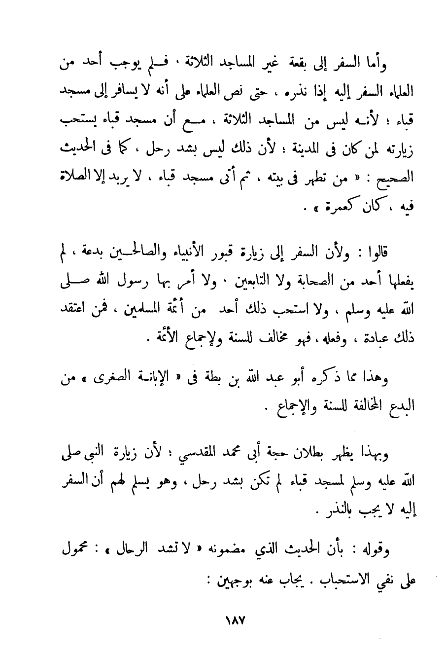 وَأَمَّا السَّفَرُ إلَى بُقْعَةٍ غَيْرَ الْمَسَاجِدِ الثَّلَاثَةِ فَلَمْ يُوجِبْ أَحَدٌ مِنْ الْعُلَمَاءِ السَّفَرَ إلَيْهِ إذَا نَذَرَهُ حَتَّى نَصَّ الْعُلَمَاءُ عَلَى أَنَّهُ لَا يُسَافِرُ إلَى مَسْجِدِ قُبَاء؛ لِأَنَّهُ لَيْسَ مِنْ الْمَسَاجِدِ الثَّلَاثَةِ مَعَ أَنَّ مَسْجِدَ قُبَاء يُسْتَحَبُّ زِيَارَتُهُ لِمَنْ كَانَ فِي الْمَدِينَةِ؛ لِأَنَّ ذَلِكَ لَيْسَ بِشَدِّ رَحْلٍ كَمَا فِي الْحَدِيثِ الصَّحِيحِ: {مَنْ تَطَهَّرَ فِي بَيْتِهِ ثُمَّ أَتَى مَسْجِدَ قُبَاء لَا يُرِيدُ إلَّا الصَّلَاةَ فِيهِ كَانَ كَعُمْرَةِ} . قَالُوا: وَلِأَنَّ السَّفَرَ إلَى زِيَارَةِ قُبُورِ الْأَنْبِيَاءِ وَالصَّالِحِينَ بِدْعَةٌ لَمْ يَفْعَلْهَا أَحَدٌ مِنْ الصَّحَابَةِ وَلَا التَّابِعِينَ وَلَا أَمَرَ بِهَا رَسُولُ اللَّهِ صَلَّى اللَّهُ عَلَيْهِ وَسَلَّمَ وَلَا اسْتَحَبَّ ذَلِكَ أَحَدٌ مِنْ أَئِمَّةِ الْمُسْلِمِينَ فَمَنْ اعْتَقَدَ ذَلِكَ عِبَادَةً وَفَعَلَهُ فَهُوَ مُخَالِفٌ لِلسُّنَّةِ وَلِإِجْمَاعِ الْأَئِمَّةِ. وَهَذَا مِمَّا ذَكَرَهُ أَبُو عَبْدِ اللَّهِ بْنُ بَطَّةَ فِي " الْإِبَانَةِ الصُّغْرَى " مِنْ الْبِدَعِ الْمُخَالِفَةِ لِلسُّنَّةِ وَالْإِجْمَاعِ. وَبِهَذَا يَظْهَرُ بُطْلَانُ حُجَّةِ أَبِي مُحَمَّدٍ المقدسي؛ لِأَنَّ زِيَارَةَ النَّبِيِّ صَلَّى اللَّهُ عَلَيْهِ وَسَلَّمَ لِمَسْجِدِ قُبَاء لَمْ تَكُنْ بِشَدِّ رَحْلٍ وَهُوَ يُسَلِّمُ لَهُمْ أَنَّ السَّفَرَ إلَيْهِ لَا يَجِبُ بِالنَّذْرِ. وَقَوْلُهُ: بِأَنَّ الْحَدِيثَ الَّذِي مَضْمُونُهُ {لَا تُشَدُّ الرِّحَالُ} مَحْمُولٌ عَلَى نَفْيِ الِاسْتِحْبَابِ. يُجَابُ عَنْهُ بِوَجْهَيْنِ: