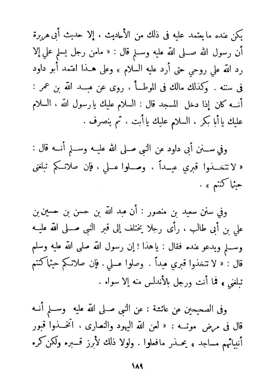 يَكُنْ عِنْدَهُ مَا يَعْتَمِدُ عَلَيْهِ فِي ذَلِكَ مِنْ الْأَحَادِيثِ إلَّا حَدِيثُ أَبِي هُرَيْرَةَ أَنَّ رَسُولَ اللَّهِ صَلَّى اللَّهُ عَلَيْهِ وَسَلَّمَ قَالَ: {مَا مِنْ رَجُلٍ يُسَلِّمُ عَلَيَّ إلَّا رَدَّ اللَّهُ عَلَيَّ رُوحِي حَتَّى أَرُدَّ عَلَيْهِ السَّلَامَ} وَعَلَى هَذَا اعْتَمَدَ أَبُو دَاوُد فِي سُنَنِهِ. وَكَذَلِكَ مَالِكٌ فِي الْمُوَطَّأِ رَوَى عَنْ عَبْدِ اللَّهِ بْنِ عُمَرَ: أَنَّهُ كَانَ إذَا دَخَلَ الْمَسْجِدَ قَالَ: السَّلَامُ عَلَيْك يَا رَسُولَ اللَّهِ السَّلَامُ عَلَيْك يَا أَبَا بَكْرٍ السَّلَامُ عَلَيْك يَا أَبَتْ ثُمَّ يَنْصَرِفُ. وَفِي سُنَنِ أَبِي دَاوُد عَنْ النَّبِيِّ صَلَّى اللَّهُ عَلَيْهِ وَسَلَّمَ أَنَّهُ قَالَ: {لَا تَتَّخِذُوا قَبْرِي عِيدًا وَصَلُّوا عَلَيَّ فَإِنَّ صَلَاتَكُمْ تَبْلُغُنِي حَيْثُمَا كُنْتُمْ} . وَفِي سُنَنِ سَعِيدِ بْنِ مَنْصُورٍ: أَنَّ عَبْدَ اللَّهِ بْنَ حَسَنِ بْنِ حُسَيْنِ بْنِ عَلِيِّ بْنِ أَبِي طَالِبٍ رَأَى رَجُلًا يَخْتَلِفُ إلَى قَبْرِ النَّبِيِّ صَلَّى اللَّهُ عَلَيْهِ وَسَلَّمَ وَيَدْعُو عِنْدَهُ فَقَالَ: يَا هَذَا إنَّ رَسُولَ اللَّهِ صَلَّى اللَّهُ عَلَيْهِ وَسَلَّمَ قَالَ: {لَا تَتَّخِذُوا قَبْرِي عِيدًا. وَصَلُّوا عَلَيَّ. فَإِنَّ صَلَاتَكُمْ حَيْثُمَا كُنْتُمْ تَبْلُغُنِي} فَمَا أَنْتَ وَرَجُلٌ بِالْأَنْدَلُسِ مِنْهُ إلَّا سَوَاءٌ. وَفِي الصَّحِيحَيْنِ عَنْ عَائِشَةَ: عَنْ النَّبِيِّ صَلَّى اللَّهُ عَلَيْهِ وَسَلَّمَ أَنَّهُ قَالَ فِي مَرَضِ مَوْتِهِ: {لَعَنَ اللَّهُ الْيَهُودَ وَالنَّصَارَى اتَّخَذُوا قُبُورَ أَنْبِيَائِهِمْ مَسَاجِدَ} يُحَذِّرُ مَا فَعَلُوا. وَلَوْلَا ذَلِكَ لَأُبْرِزَ قَبْرُهُ وَلَكِنْ كَرِهَ