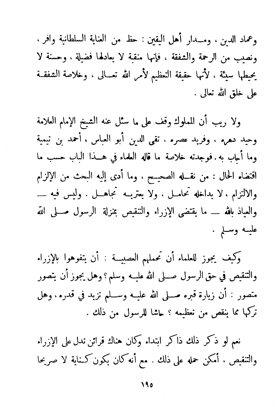 وَعِمَادُ الدِّينِ وَمَدَارُ أَهْلِ الْيَقِينِ: حَظٌّ مِنْ الْعِنَايَةِ السُّلْطَانِيَّةِ وَافِرٌ وَنَصِيبٌ مِنْ الرَّحْمَةِ وَالشَّفَقَةِ فَإِنَّهَا مَنْقَبَةٌ لَا يُعَادِلُهَا فَضِيلَةٌ وَحَسَنَةٌ لَا يُحِيطُهَا سَيِّئَةٌ لِأَنَّهَا حَقِيقَةُ التَّعْظِيمِ لِأَمْرِ اللَّهِ تَعَالَى وَخُلَاصَةُ الشَّفَقَةِ عَلَى خَلْقِ اللَّهِ تَعَالَى. وَلَا رَيْبَ أَنَّ الْمَمْلُوكَ وَقَفَ عَلَى مَا سُئِلَ عَنْهُ الشَّيْخُ الْإِمَامُ الْعَلَّامَةُ وَحِيدُ دَهْرِهِ وَفَرِيدُ عَصْرِهِ تَقِيُّ الدِّينِ أَبُو الْعَبَّاسِ أَحْمَد ابْنُ تَيْمِيَّة وَمَا أَجَابَ بِهِ. فَوَجَدْته خُلَاصَةَ مَا قَالَهُ الْعُلَمَاءُ فِي هَذَا الْبَابِ حَسْبَ مَا اقْتَضَاهُ الْحَالُ: مِنْ نَقْلِهِ الصَّحِيحِ وَمَا أَدَّى إلَيْهِ الْبَحْثُ مِنْ الْإِلْزَامِ وَالِالْتِزَامِ لَا يُدَاخِلُهُ تَحَامُلٌ وَلَا يَعْتَرِيهِ تَجَاهُلٌ. وَلَيْسَ فِيهِ - وَالْعِيَاذُ بِاَللَّهِ - مَا يَقْتَضِي الْإِزْرَاءَ وَالتَّنْقِيصَ بِمَنْزِلَةِ الرَّسُولِ صَلَّى اللَّهُ عَلَيْهِ وَسَلَّمَ. وَكَيْفَ يَجُوزُ لِلْعُلَمَاءِ أَنْ تَحْمِلَهُمْ الْعَصَبِيَّةُ: أَنْ يَتَفَوَّهُوا بِالْإِزْرَاءِ وَالتَّنْقِيصِ فِي حَقِّ الرَّسُولِ صَلَّى اللَّهُ عَلَيْهِ وَسَلَّمَ؟ وَهَلْ يَجُوزُ أَنْ يَتَصَوَّرَ مُتَصَوِّرٌ: أَنَّ زِيَارَةَ قَبْرِهِ صَلَّى اللَّهُ عَلَيْهِ وَسَلَّمَ تَزِيدُ فِي قَدْرِهِ وَهَلْ تَرْكُهَا مِمَّا يُنْقِصُ مِنْ تَعْظِيمِهِ؟ حَاشَا لِلرَّسُولِ مِنْ ذَلِكَ. نَعَمْ لَوْ ذَكَرَ ذَلِكَ ذَاكِرٌ ابْتِدَاءً وَكَانَ هُنَاكَ قَرَائِنُ تَدُلُّ عَلَى الْإِزْرَاءِ وَالتَّنْقِيصِ أَمْكَنَ حَمْلُهُ عَلَى ذَلِكَ. مَعَ أَنَّهُ كَانَ يَكُونُ كِنَايَةً لَا صَرِيحًا