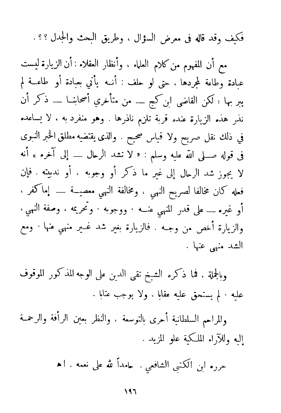 فَكَيْفَ وَقَدْ قَالَهُ فِي مَعْرِضِ السُّؤَالِ وَطَرِيقِ الْبَحْثِ وَالْجَدَلِ؟ . مَعَ أَنَّ الْمَفْهُومَ مِنْ كَلَامِ الْعُلَمَاءِ وَأَنْظَارِ الْعُقَلَاءِ: أَنَّ الزِّيَارَةَ لَيْسَتْ عِبَادَةً وَطَاعَةً لِمُجَرَّدِهَا حَتَّى لَوْ حَلَفَ: أَنَّهُ يَأْتِي بِعِبَادَةِ أَوْ طَاعَةٍ لَمْ يَبَرَّ بِهَا؛ لَكِنَّ الْقَاضِيَ ابْنَ كَجٍّ - مِنْ مُتَأَخِّرِي أَصْحَابِنَا - ذَكَرَ أَنَّ نَذْرَ هَذِهِ الزِّيَارَةِ عِنْدَهُ قُرْبَةٌ تَلْزَمُ نَاذِرَهَا. وَهُوَ مُنْفَرِدٌ بِهِ لَا يُسَاعِدُهُ فِي ذَلِكَ نَقْلٌ صَرِيحٌ وَلَا قِيَاسٌ صَحِيحٌ. وَاَلَّذِي يَقْتَضِيهِ مُطْلَقُ الْخَبَرِ النَّبَوِيِّ فِي قَوْلِهِ صَلَّى اللَّهُ عَلَيْهِ وَسَلَّمَ {لَا تُشَدُّ الرِّحَالُ} - إلَى آخِرِهِ " أَنَّهُ لَا يَجُوزُ شَدُّ الرِّحَالِ إلَى غَيْرِ مَا ذَكَرَ أَوْ وُجُوبُهُ أَوْ ندبيته. فَإِنْ فَعَلَهُ كَانَ مُخَالِفًا لِصَرِيحِ النَّهْيِ وَمُخَالَفَةُ النَّهْيِ مَعْصِيَةٌ - إمَّا كُفْرٌ أَوْ غَيْرُهُ - عَلَى قَدْرِ الْمَنْهِيِّ عَنْهُ وَوُجُوبِهِ وَتَحْرِيمِهِ وَصِفَةِ النَّهْيِ وَالزِّيَارَةُ أَخَصُّ مِنْ وَجْهٍ. فَالزِّيَارَةُ بِغَيْرِ شَدٍّ غَيْرُ مَنْهِيٍّ عَنْهَا وَمَعَ الشَّدِّ مَنْهِيٌّ عَنْهَا. وَبِالْجُمْلَةِ فَمَا ذَكَرَهُ الشَّيْخُ تَقِيُّ الدِّينِ عَلَى الْوَجْهِ الْمَذْكُورِ الْمَوْقُوفِ عَلَيْهِ لَمْ يَسْتَحِقَّ عَلَيْهِ عِقَابًا وَلَا يُوجِبْ عِتَابًا. وَالْمَرَاحِمُ السُّلْطَانِيَّةُ أَحْرَى بِالتَّوْسِعَةِ وَالنَّظَرِ بِعَيْنِ الرَّأْفَةِ وَالرَّحْمَةِ إلَيْهِ وَلِلْآرَاءِ الْمَلَكِيَّةِ عُلُوُّ الْمَزِيدِ. حَرَّرَهُ ابْنُ الْكُتُبِيِّ الشَّافِعِيُّ. حَامِدًا لِلَّهِ عَلَى نِعَمِهِ. اهـ