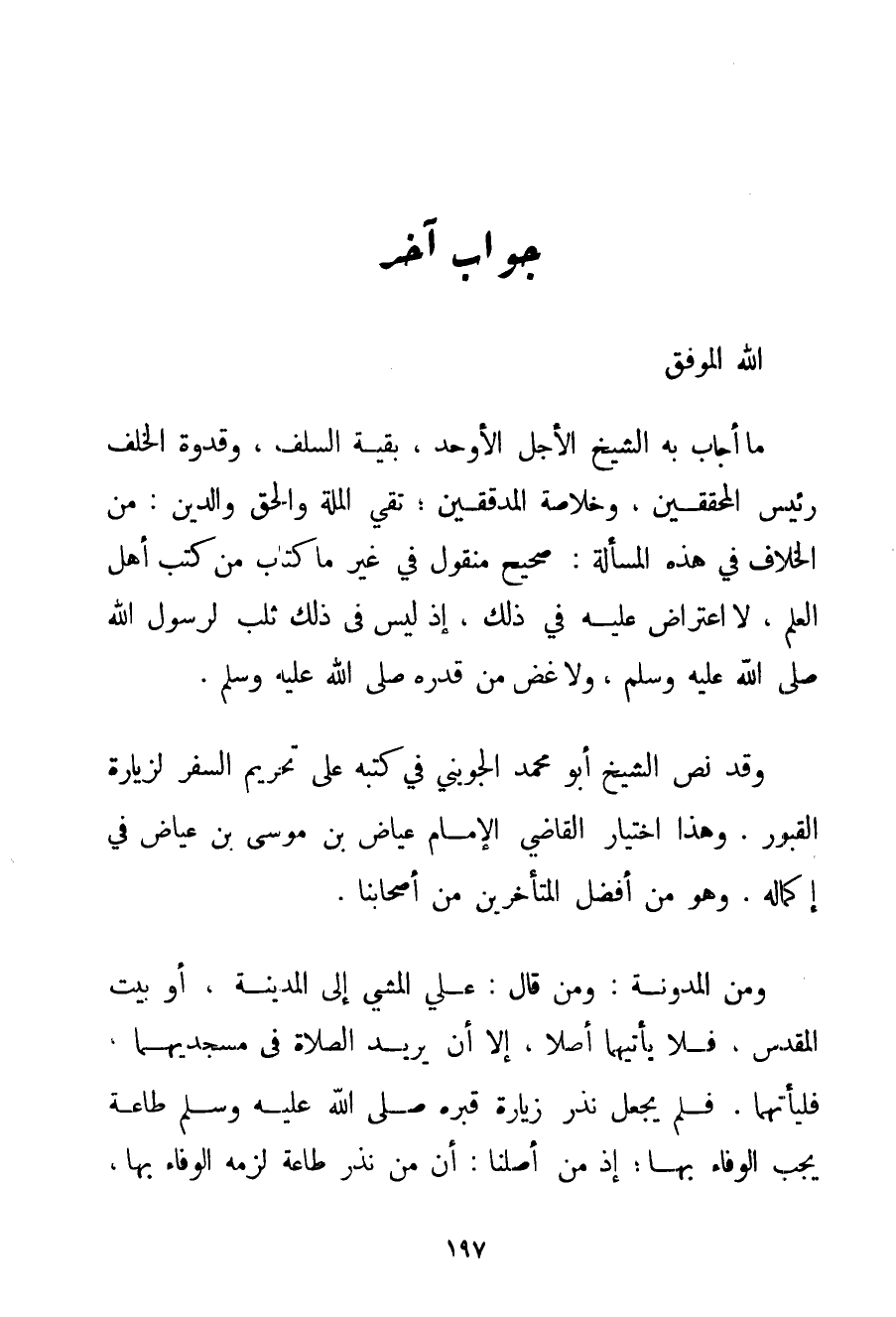 مَا أَجَابَ بِهِ الشَّيْخُ الْأَجَلُّ الْأَوْحَدُ بَقِيَّةُ السَّلَفِ وَقُدْوَةُ الْخَلَفِ رَئِيسُ الْمُحَقِّقِينَ وَخُلَاصَةُ الْمُدَقِّقِينَ؛ تَقِيُّ الْمِلَّةِ وَالْحَقِّ وَالدِّينِ: مِنْ الْخِلَافِ فِي هَذِهِ الْمَسْأَلَةِ: صَحِيحٌ مَنْقُولٌ فِي غَيْرِ مَا كِتَابٍ مِنْ كُتُبِ أَهْلِ الْعِلْمِ لَا اعْتِرَاضَ عَلَيْهِ فِي ذَلِكَ إذْ لَيْسَ فِي ذَلِكَ ثَلْبٌ لِرَسُولِ اللَّهِ صَلَّى اللَّهُ عَلَيْهِ وَسَلَّمَ وَلَا غَضٌّ مِنْ قَدْرِهِ صَلَّى اللَّهُ عَلَيْهِ وَسَلَّمَ. وَقَدْ نَصَّ الشَّيْخُ أَبُو مُحَمَّدٍ الجُوَيْنِي فِي كُتُبِهِ عَلَى تَحْرِيمِ السَّفَرِ لِزِيَارَةِ الْقُبُورِ. وَهَذَا اخْتِيَارُ الْقَاضِي الْإِمَامِ عِيَاضِ بْنِ مُوسَى بْنِ عِيَاضٍ فِي إكْمَالِهِ. وَهُوَ مِنْ أَفْضَلِ الْمُتَأَخِّرِينَ مِنْ أَصْحَابِنَا. وَمِنْ الْمُدَوِّنَةِ: وَمَنْ قَالَ: عَلَيَّ الْمَشْيُ إلَى الْمَدِينَةِ أَوْ بَيْتِ الْمَقْدِسِ فَلَا يَأْتِيهِمَا أَصْلًا إلَّا أَنْ يُرِيدَ الصَّلَاةَ فِي مَسْجِدَيْهِمَا فَلْيَأْتِهِمَا. فَلَمْ يَجْعَلْ نَذْرَ زِيَارَةِ قَبْرِهِ صَلَّى اللَّهُ عَلَيْهِ وَسَلَّمَ طَاعَةً يَجِبُ الْوَفَاءُ بِهَا؛ إذْ مِنْ أَصْلِنَا: أَنَّ مَنْ نَذَرَ طَاعَةً لَزِمَهُ الْوَفَاءُ بِهَا