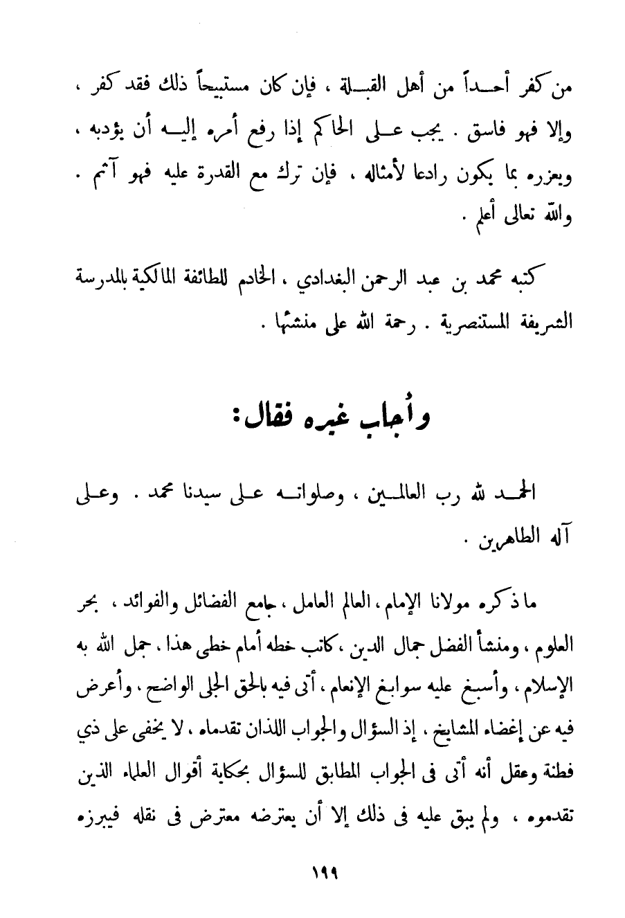 مَنْ كَفَّرَ أَحَدًا مِنْ أَهْلِ الْقِبْلَةِ فَإِنْ كَانَ مُسْتَبِيحًا ذَلِكَ فَقَدْ كَفَرَ وَإِلَّا فَهُوَ فَاسِقٌ. يَجِبُ عَلَى الْحَاكِمِ إذَا رُفِعَ أَمْرُهُ إلَيْهِ أَنْ يُؤَدِّبَهُ وَيُعَزِّرَهُ بِمَا يَكُونُ رَادِعًا لِأَمْثَالِهِ فَإِنْ تُرِكَ مَعَ الْقُدْرَةِ عَلَيْهِ فَهُوَ آثِمٌ. وَاَللَّهُ تَعَالَى أَعْلَمُ. كَتَبَهُ مُحَمَّدُ بْنُ عَبْدِ الرَّحْمَنِ الْبَغْدَادِيُّ الْخَادِمُ لِلطَّائِفَةِ الْمَالِكِيَّةِ بِالْمَدْرَسَةِ الشَّرِيفَةِ المستنصرية. رَحْمَةُ اللَّهِ عَلَى مُنْشِئِهَا.