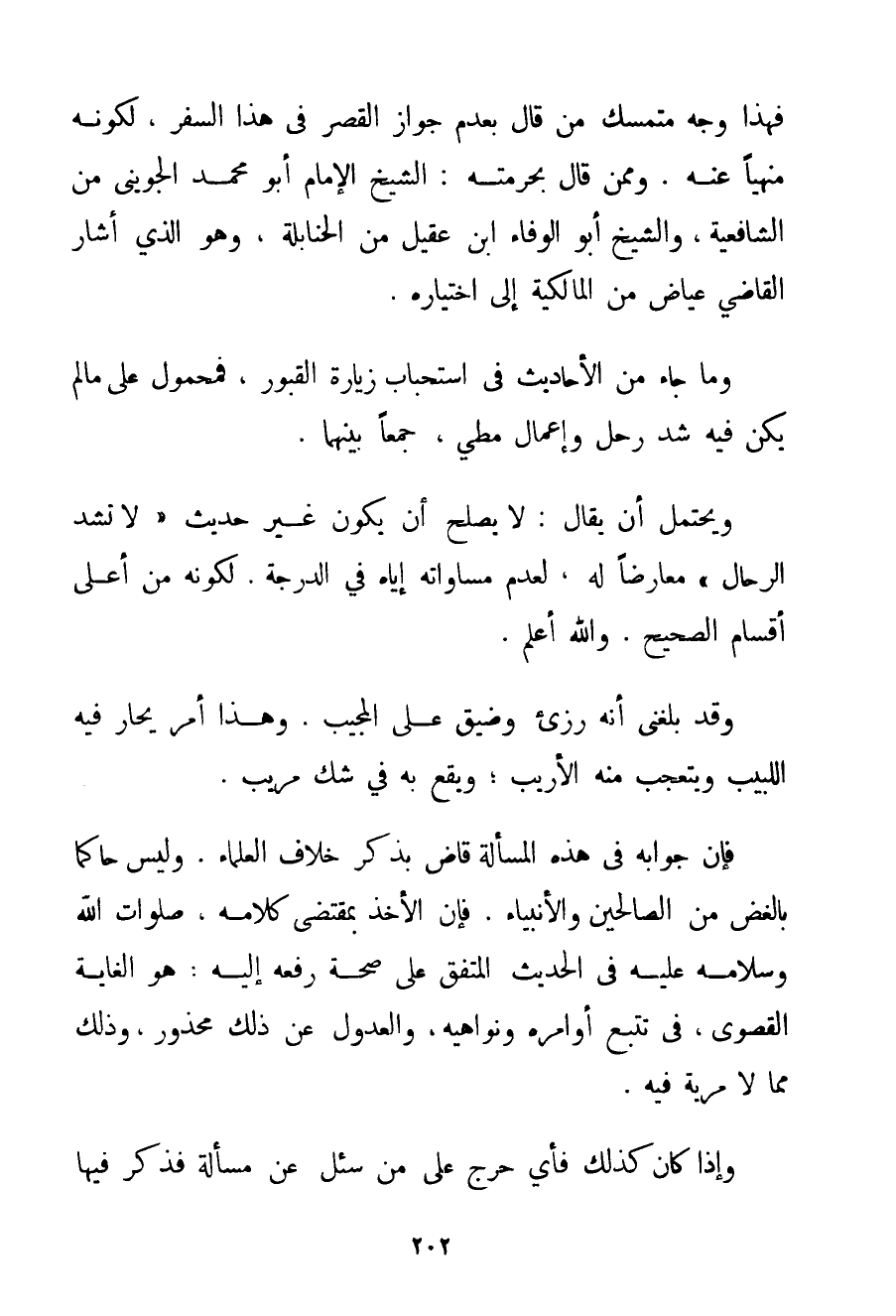 فَهَذَا وَجْهُ مُتَمَسَّكِ مَنْ قَالَ بِعَدَمِ جَوَازِ الْقَصْرِ فِي هَذَا السَّفَرِ لِكَوْنِهِ مَنْهِيًّا عَنْهُ. وَمِمَّنْ قَالَ بِحُرْمَتِهِ: الشَّيْخُ الْإِمَامُ أَبُو مُحَمَّدٍ الجُوَيْنِي مِنْ الشَّافِعِيَّةِ وَالشَّيْخُ أَبُو الْوَفَاءِ ابْنُ عَقِيلٍ مِنْ الْحَنَابِلَةِ وَهُوَ الَّذِي أَشَارَ الْقَاضِي عِيَاضٌ مِنْ الْمَالِكِيَّةِ إلَى اخْتِيَارِهِ. وَمَا جَاءَ مِنْ الْأَحَادِيثِ فِي اسْتِحْبَابِ زِيَارَةِ الْقُبُورِ فَمَحْمُولٌ عَلَى مَا لَمْ يَكُنْ فِيهِ شَدُّ رَحْلٍ وَإِعْمَالُ مَطِيٍّ جَمْعًا بَيْنَهُمَا. وَيُحْتَمَلُ أَنْ يُقَالَ: لَا يَصْلُحُ أَنْ يَكُونَ غَيْرُ حَدِيثِ {لَا تُشَدُّ الرِّحَالُ} مُعَارِضًا لَهُ لِعَدَمِ مُسَاوَاتِهِ إيَّاهُ فِي الدَّرَجَةِ. لِكَوْنِهِ مِنْ أَعْلَى أَقْسَامِ الصَّحِيحِ. وَاَللَّهُ أَعْلَمُ. وَقَدْ بَلَغَنِي أَنَّهُ رَزِئَ وَضَيَّقَ عَلَى الْمُجِيبِ. وَهَذَا أَمْرٌ يَحَارُ فِيهِ اللَّبِيبُ وَيَتَعَجَّبُ مِنْهُ الْأَرِيبُ؛ وَيَقَعُ بِهِ فِي شَكٍّ مُرِيبٍ. فَإِنَّ جَوَابَهُ فِي هَذِهِ الْمَسْأَلَةِ قَاضٍ بِذِكْرِ خِلَافِ الْعُلَمَاءِ. وَلَيْسَ حَاكِمًا بِالْغَضِّ مِنْ الصَّالِحِينَ وَالْأَنْبِيَاءَ. فَإِنَّ الْأَخْذَ بِمُقْتَضَى كَلَامِهِ صَلَوَاتُ اللَّهِ وَسَلَامُهُ عَلَيْهِ فِي الْحَدِيثِ الْمُتَّفَقِ عَلَى صِحَّةِ رَفْعِهِ إلَيْهِ: هُوَ الْغَايَةُ الْقُصْوَى فِي تَتَبُّعِ أَوَامِرِهِ وَنَوَاهِيهِ وَالْعُدُولُ عَنْ ذَلِكَ مَحْذُورٌ وَذَلِكَ مِمَّا لَا مِرْيَةَ فِيهِ. وَإِذَا كَانَ كَذَلِكَ فَأَيُّ حَرَجٍ عَلَى مَنْ سُئِلَ عَنْ مَسْأَلَةٍ فَذَكَرَ فِيهَا