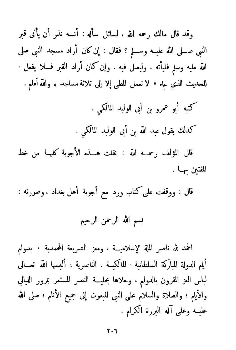 قَالَ: وَوَقَفْت عَلَى كِتَابٍ وَرَدَ مَعَ أَجْوِبَةِ أَهْلِ بَغْدَادَ وَصُورَتُهُ: بِسْمِ اللَّهِ الرَّحْمَنِ الرَّحِيمِ الْحَمْدُ لِلَّهِ نَاصِرِ الْمِلَّةِ الْإِسْلَامِيَّةِ وَمُعِزِّ الشَّرِيعَةِ الْمُحَمَّدِيَّةِ بِدَوَامِ أَيَّامِ الدَّوْلَةِ الْمُبَارَكَةِ السُّلْطَانِيَّةِ. الْمَالِكِيَّةِ النَّاصِرِيَّةِ؛ أَلْبَسَهَا اللَّهُ تَعَالَى لِبَاسَ الْعِزِّ الْمَقْرُونِ بِالدَّوَامِ وَحَلَّاهَا بِحِلْيَةِ النَّصْرِ الْمُسْتَمِرِّ بِمُرُورِ اللَّيَالِي وَالْأَيَّامَ وَالصَّلَاةُ وَالسَّلَامُ عَلَى النَّبِيِّ الْمَبْعُوثِ إلَى جَمِيعِ الْأَنَامِ؛ صَلَّى اللَّهُ عَلَيْهِ وَعَلَى آلِهِ الْبَرَرَةِ الْكِرَامِ.