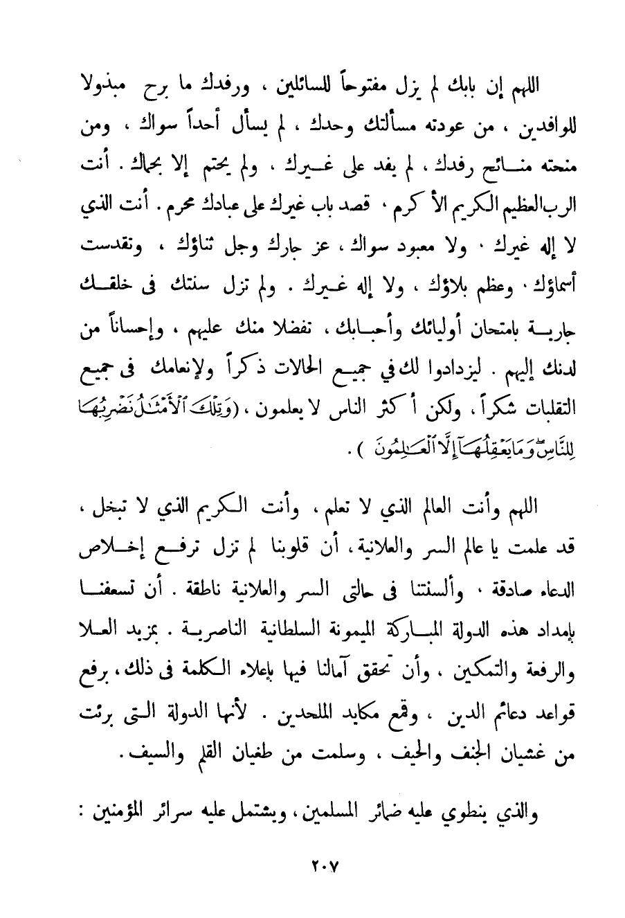 اللَّهُمَّ إنَّ بَابَك لَمْ يَزَلْ مَفْتُوحًا لِلسَّائِلِينَ وَرِفْدَك مَا بَرِحَ مَبْذُولًا لِلْوَافِدِينَ مَنْ عَوَّدْته مَسْأَلَتَك وَحْدَك لَمْ يَسْأَلْ أَحَدًا سِوَاك وَمَنْ مَنَحْته منائح رِفْدِك لَمْ يَفِدْ عَلَى غَيْرِك وَلَمْ يَحْتَمِ إلَّا بِحِمَاك. أَنْتَ الرَّبُّ الْعَظِيمُ الْكَرِيمُ الْأَكْرَمُ قَصْدُ بَابِ غَيْرِك عَلَى عِبَادِك مُحَرَّمٌ. أَنْتَ الَّذِي لَا إلَهَ غَيْرُك وَلَا مَعْبُودَ سِوَاك عَزَّ جَارُك وَجَلَّ ثَنَاؤُك وَتَقَدَّسَتْ أَسْمَاؤُك وَعَظُمَ بَلَاؤُك وَلَا إلَهَ غَيْرُك. وَلَمْ تَزَلْ سُنَّتُك فِي خَلْقِك جَارِيَةً بِامْتِحَانِ أَوْلِيَائِك وَأَحْبَابِك تَفَضُّلًا مِنْك عَلَيْهِمْ وَإِحْسَانًا مِنْ لَدُنْك إلَيْهِمْ. لِيَزْدَادُوا لَك فِي جَمِيعِ الْحَالَاتِ ذِكْرًا وَلِإِنْعَامِك فِي جَمِيعِ التَّقَلُّبَاتِ شُكْرًا وَلَكِنَّ أَكْثَرَ النَّاسِ لَا يَعْلَمُونَ {وَتِلْكَ الْأَمْثَالُ نَضْرِبُهَا لِلنَّاسِ وَمَا يَعْقِلُهَا إلَّا الْعَالِمُونَ} . اللَّهُمَّ وَأَنْتَ الْعَالِمُ الَّذِي لَا تُعْلَمُ وَأَنْتَ الْكَرِيمُ الَّذِي لَا تَبْخَلُ قَدْ عَلِمْت يَا عَالِمَ السِّرِّ وَالْعَلَانِيَةِ أَنَّ قُلُوبَنَا لَمْ تَزَلْ تَرْفَعُ إخْلَاصَ الدُّعَاءِ صَادِقَةً وَأَلْسِنَتَنَا فِي حَالَتَيْ السِّرِّ وَالْعَلَانِيَةِ نَاطِقَةٌ. أَنْ تُسْعِفَنَا بِإِمْدَادِ هَذِهِ الدَّوْلَةِ الْمُبَارَكَةِ الْمَيْمُونَةِ السُّلْطَانِيَّةِ النَّاصِرِيَّةِ. بِمَزِيدِ الْعُلَا وَالرِّفْعَةِ وَالتَّمْكِينِ وَأَنْ تُحَقِّقَ آمَالَنَا فِيهَا بِإِعْلَاءِ الْكَلِمَةِ فِي ذَلِكَ بِرَفْعِ قَوَاعِدِ دَعَائِمِ الدِّينِ وَقَمْعِ مَكَايِدِ الْمُلْحِدِينَ. لِأَنَّهَا الدَّوْلَةُ الَّتِي بَرِئَتْ مِنْ غَشَيَانِ الْجَنَفِ وَالْحَيْفِ وَسَلِمَتْ مِنْ طُغْيَانِ الْقَلَمِ وَالسَّيْفِ. وَاَلَّذِي يَنْطَوِي عَلَيْهِ ضَمَائِرُ الْمُسْلِمِينَ وَيَشْتَمِلُ عَلَيْهِ سَرَائِرُ الْمُؤْمِنِينَ: